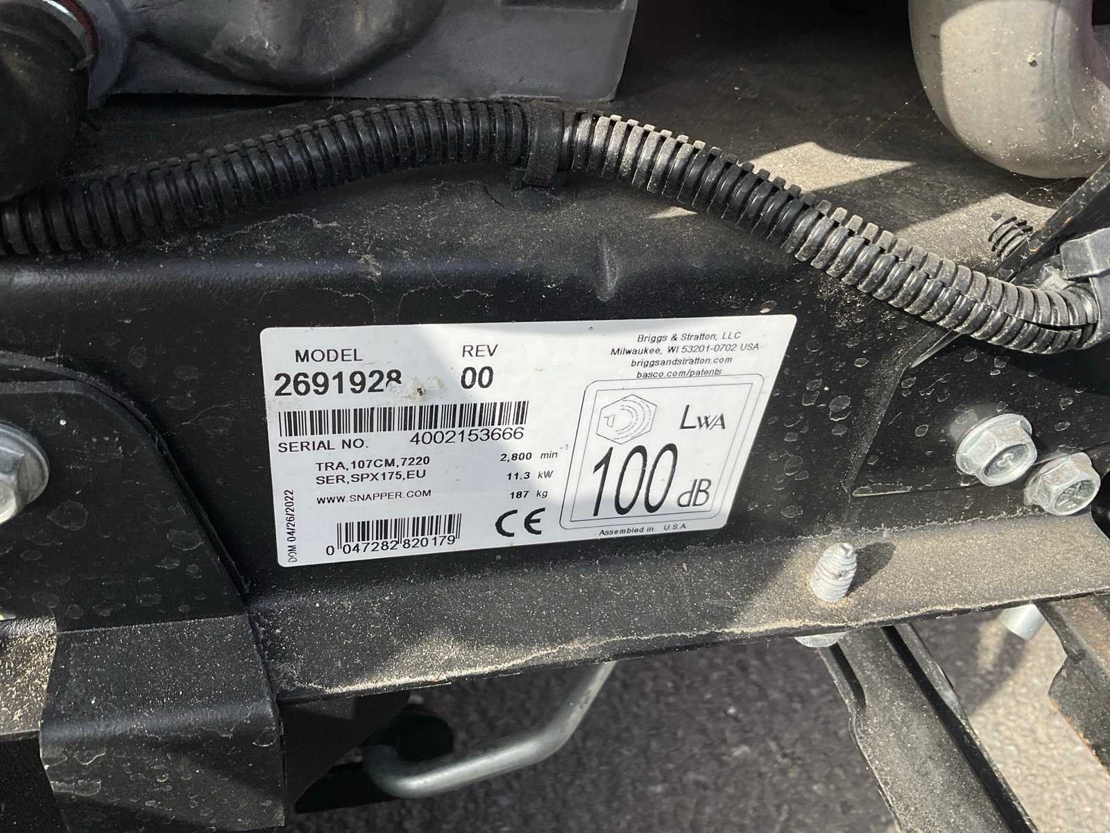 Voorzien van B&S benzinemotor type 7220EXi, afgelezen draaiuren 6h. ongebruikt Merk: Snapper Type: SPX175 Bouwjaar: 2022 Serienummer: 4002153666 Werkbreedte: 1070mm Zelfrijdend: true Zitmaaier: true Benzinemotor: true Brandstof: Benzine Motorvermogen (kW): 11.3kW Eigen gewicht: 193kg Totale afmeting L: 1750mm Totale afmeting Breedte: 1400mm Totale afmeting Hoogte: 1160mm