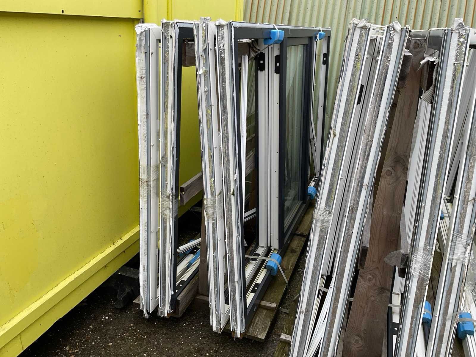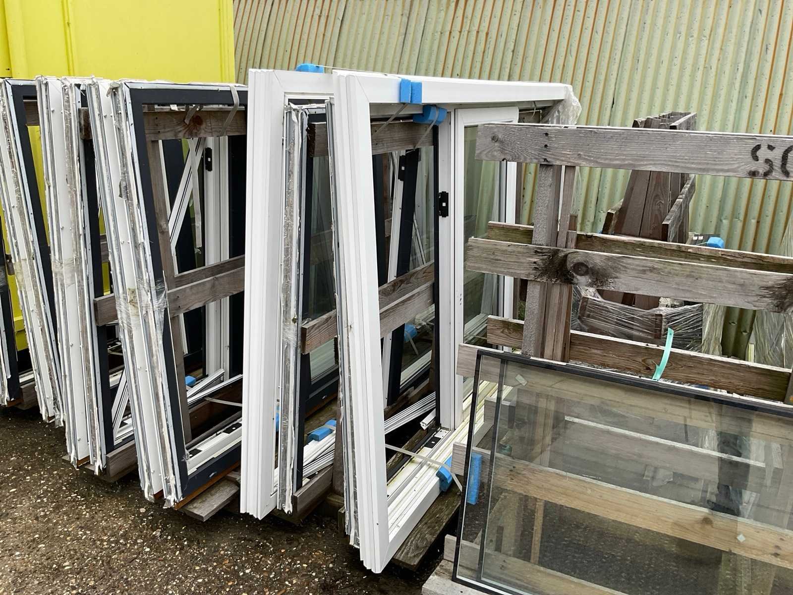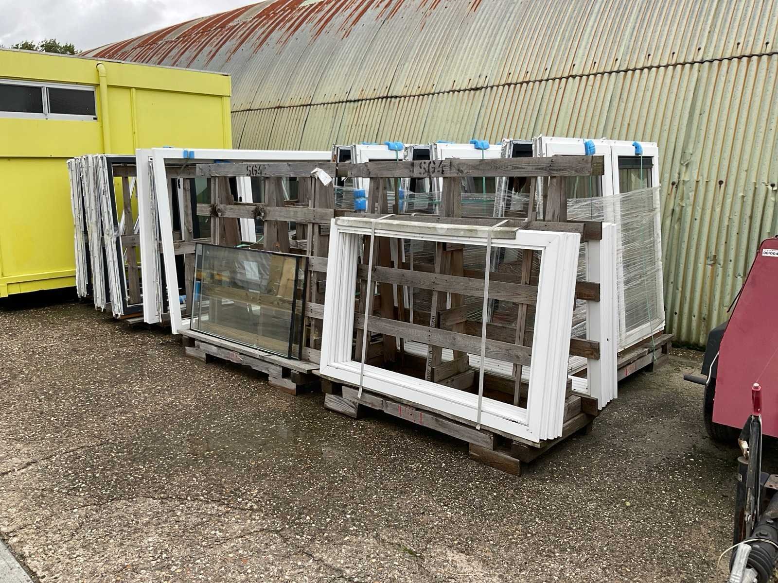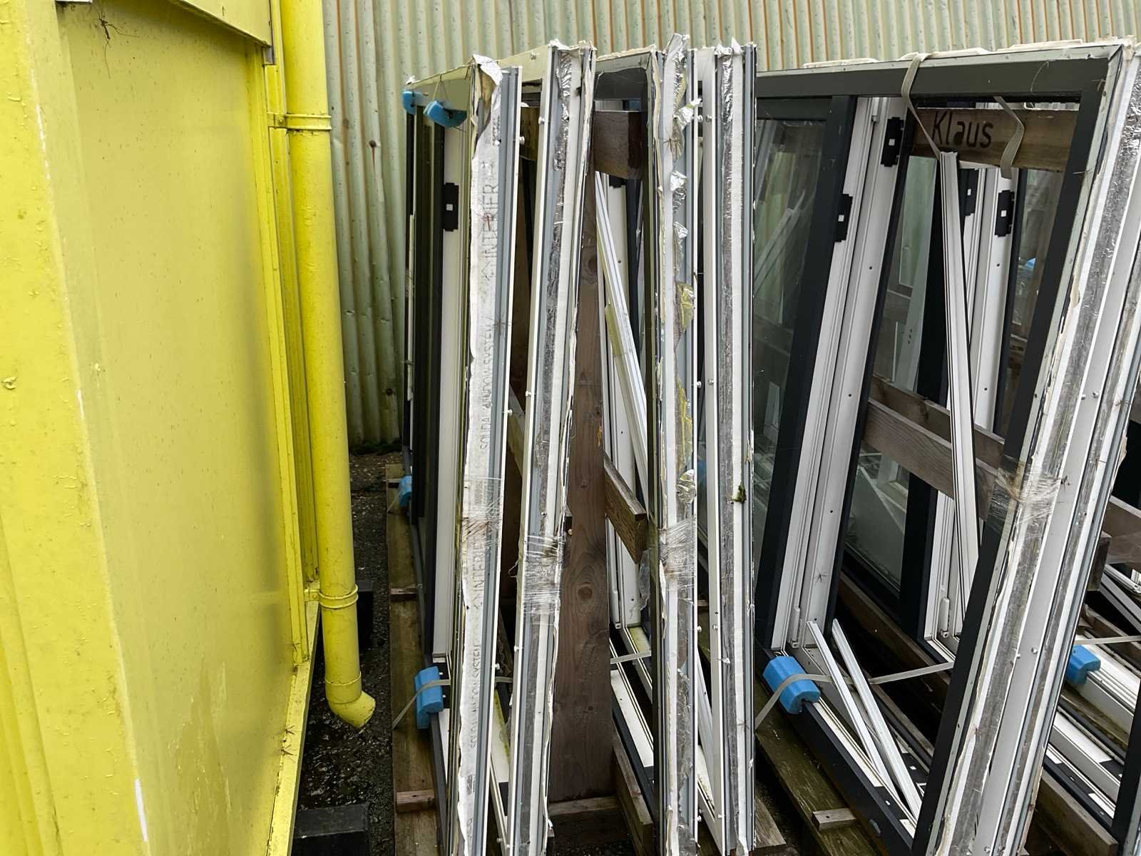 Betreft 9 bokken met kozijnen en glas, antraciet en wit, 2x bok met 8x 2470x1500x70mm met in het midden draaikantel raam, beide zijramen hebben geen glas, 1x bok met 2x 2470x1500x70mm idem als de vorige met 10 witte afdeklijsten, 1x bok met 10x glas voor de vorige kozijnen, 3x bok met 6x 1800x1500x70mm kozijnen voorzien van draairamen met glas, 1x bok met 20 witte afdeklijsten, bok met 2x glas Stomp: true