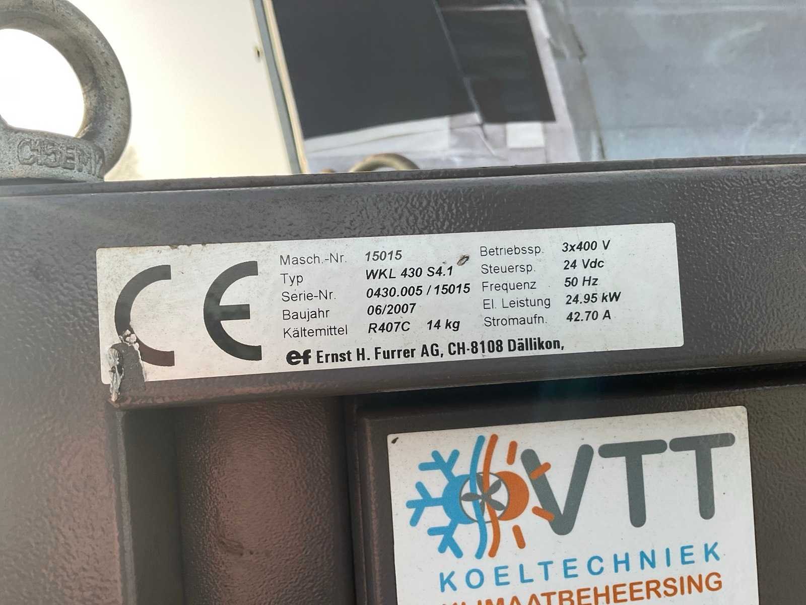 Merk: Copeland Aansluiting: 400V Type koudemiddel: R407C Totale afmeting Breedte: 1000mm Totale afmeting Hoogte: 2450mm Vermogen: 24.95kW Totale afmeting L: 2200mm Type: WKL 430 S4.1 Serienummer: 0430.005 / 15015 Bouwjaar: 2007