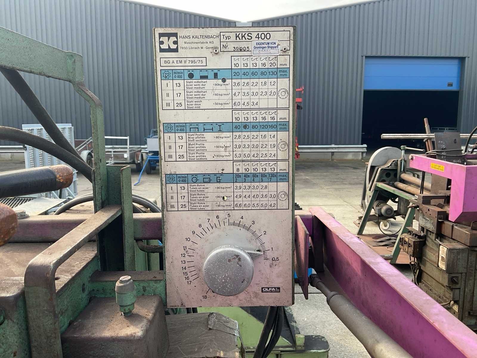 Merk: Kaltenbach Type: KKS400 Serienummer: 39905 Zaagblad Ø: 370mm Tafel afmeting l: 550mm Tafel afmeting b: 550mm Verstekhoek max.: 45° Koelmiddelpomp: true Aansluiting: 400V Afmeting l: 1000mm Afmeting b: 1100mm Afmeting h: 1700mm