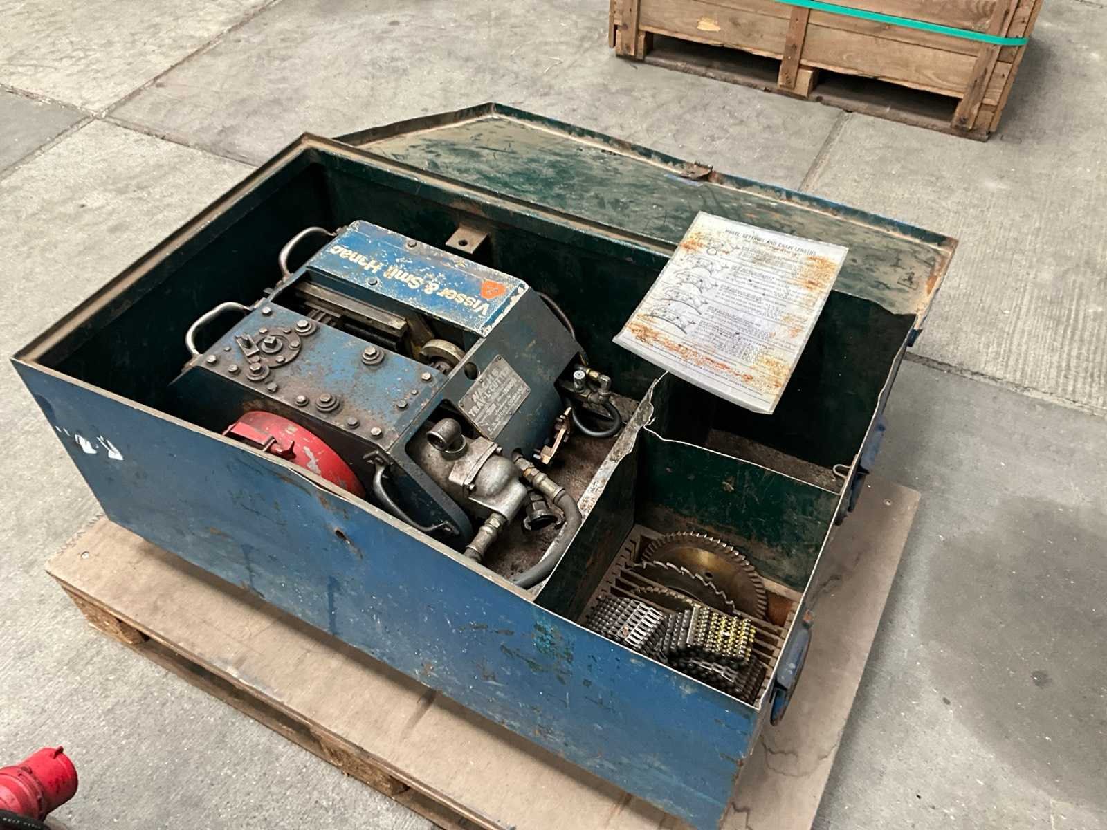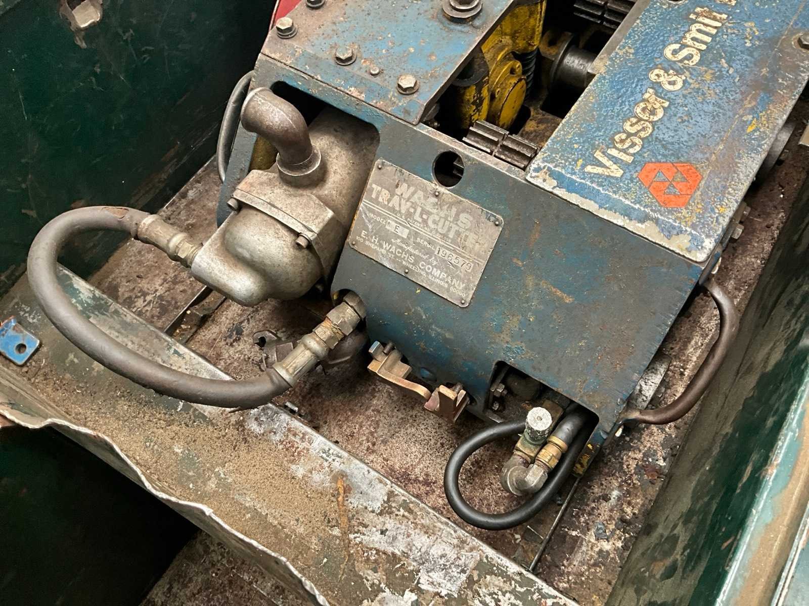 Inclusief stalen kist, afmeting circa: 630x1030x460 mm Merk: Wachs Type: Trav-l-cutter E Serienummer: 196579 Afmeting l: 560mm Afmeting b: 500mm Afmeting h: 300mm