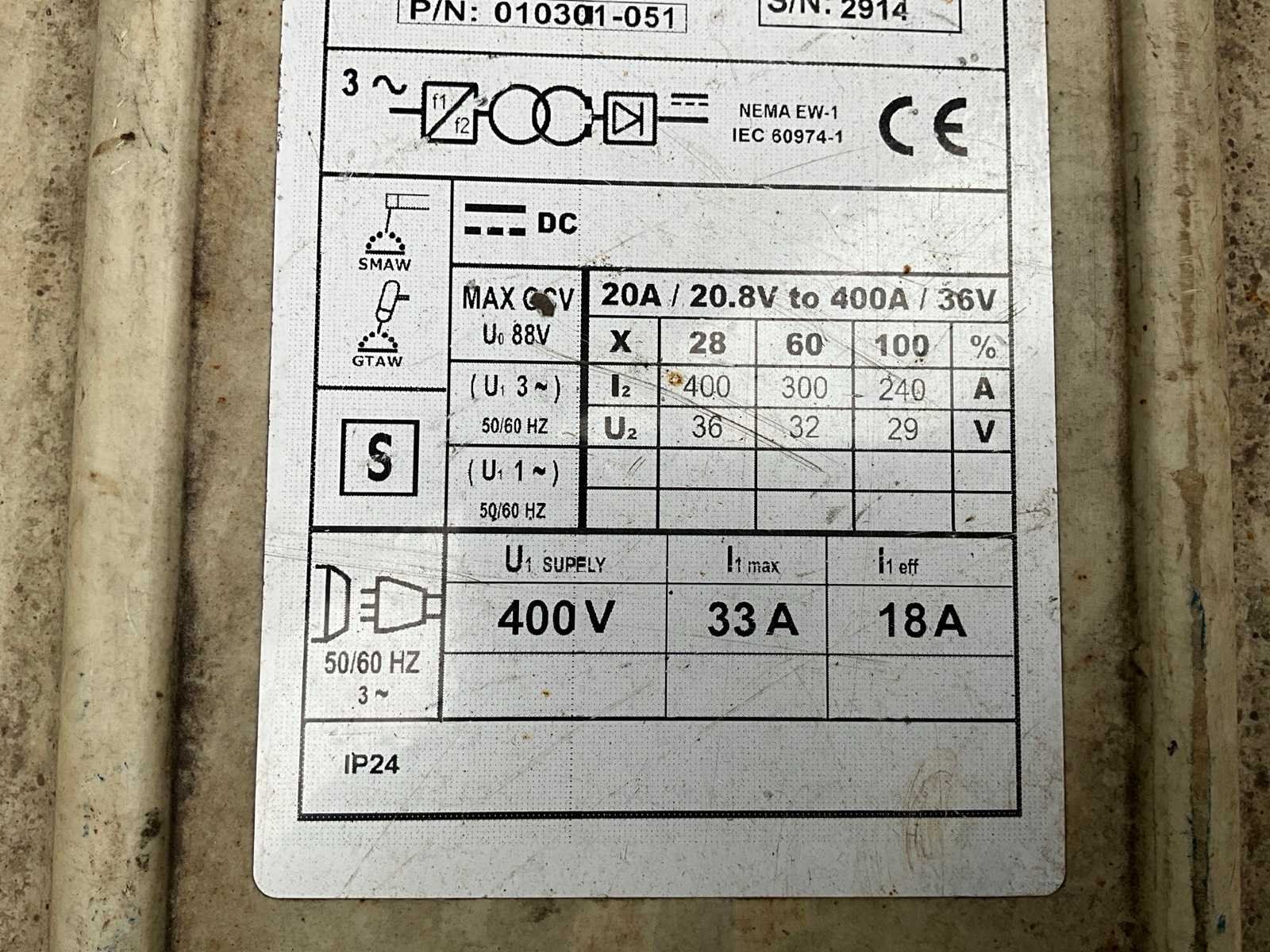 Merk: Workhorse Type: 300S Inschakelduur: 36% Max. lasvermogen: 400A Aansluiting: 400V Afmeting l: 500mm Afmeting b: 280mm Afmeting h: 460mm
