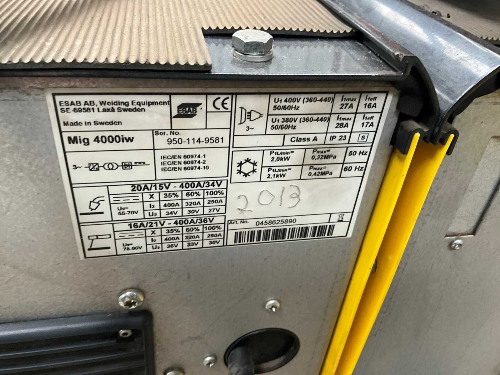 Merk: ESAB Type: Mig 4000iw Bouwjaar: 2013 Aansluiting: 400V Afmeting l: 600mm Afmeting b: 400mm Afmeting h: 800mm