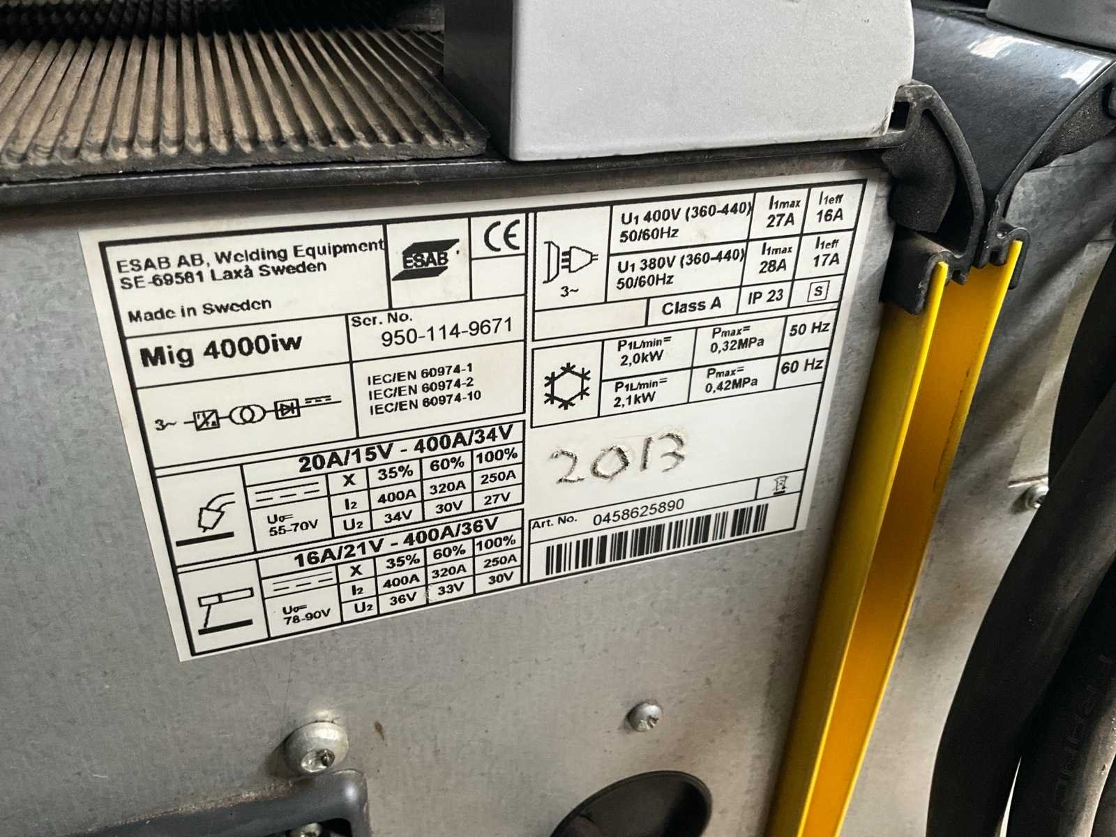 Merk: ESAB Type: Mig 4000iw Bouwjaar: 2013 Aansluiting: 400V Digitale uitlezing: true Draadaanvoerunit: true Afmeting l: 600mm Afmeting b: 400mm Afmeting h: 800mm
