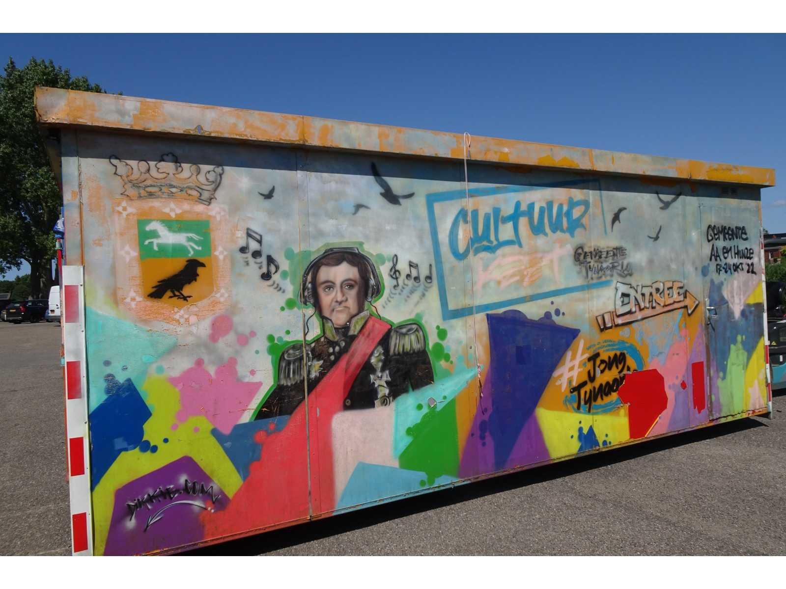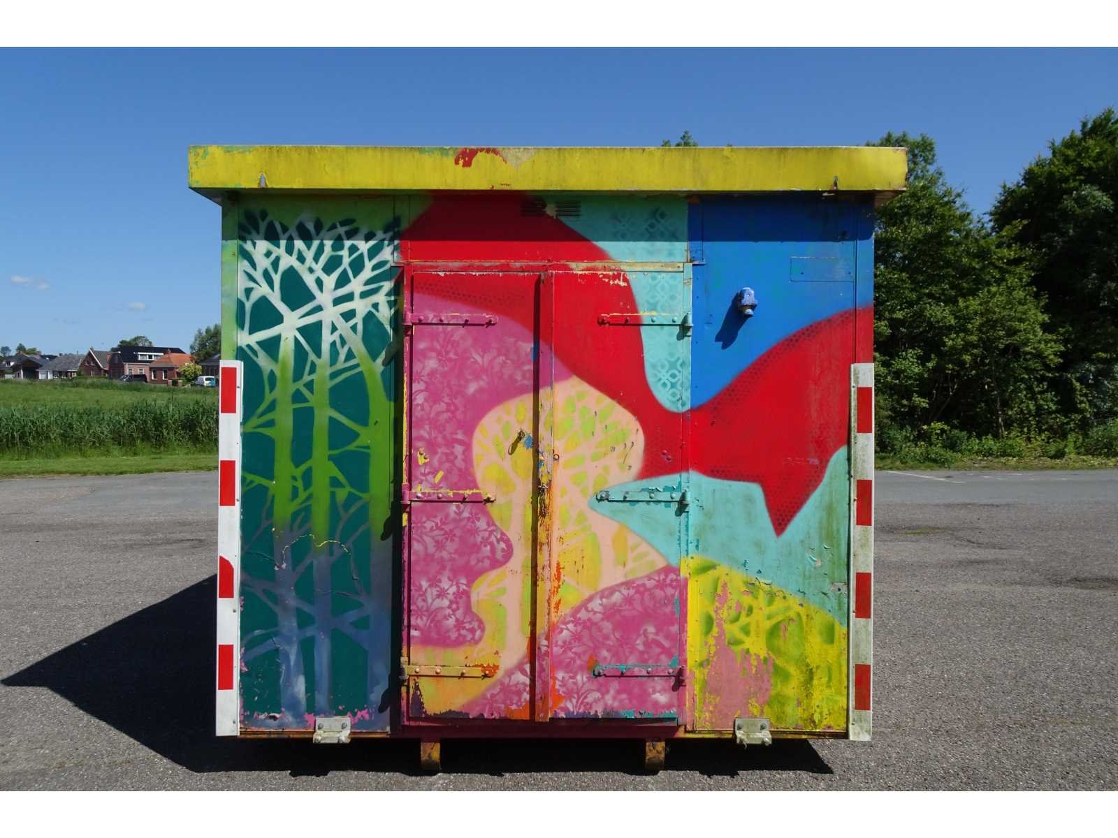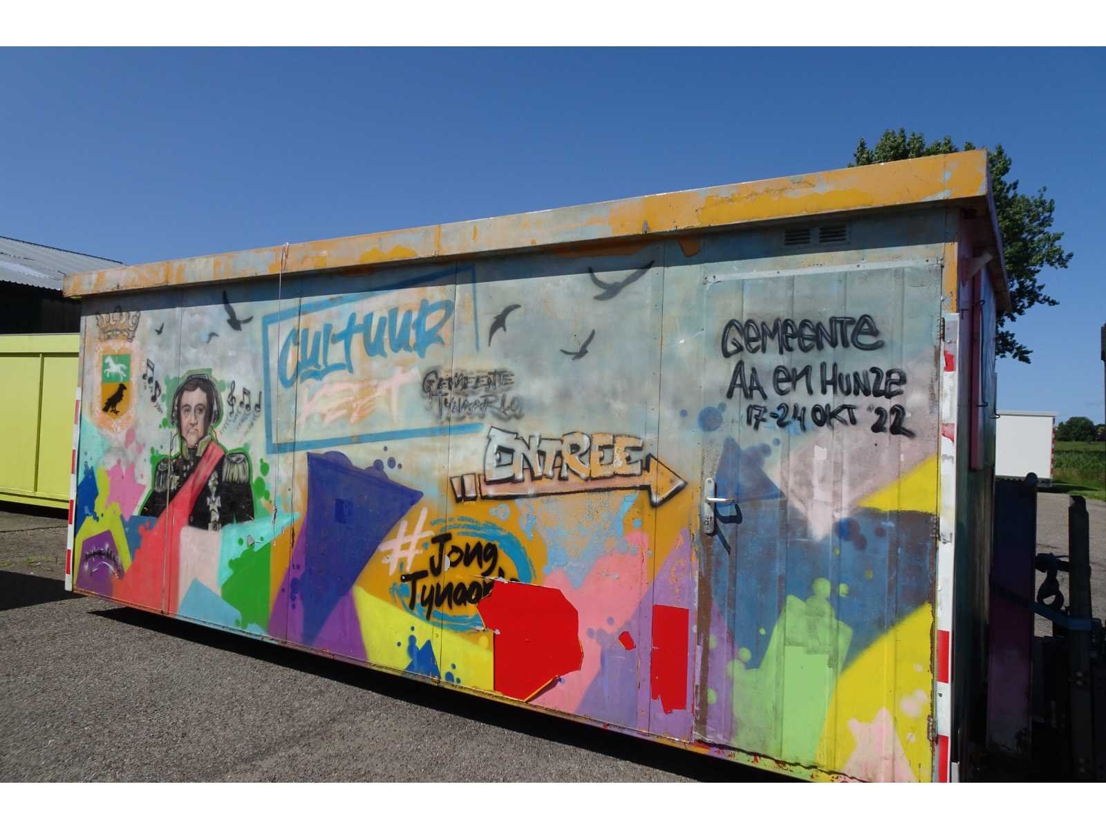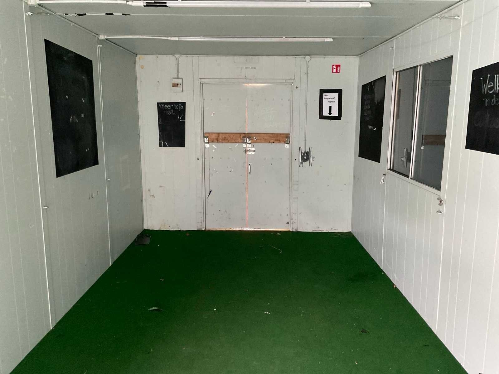Op haakarm frame, 2 deuren, groene tapijt tegels, 230 volt installatie Afmeting l: 6500mm Afmeting b: 3000mm Afmeting h: 2750mm Aantal ramen: 2