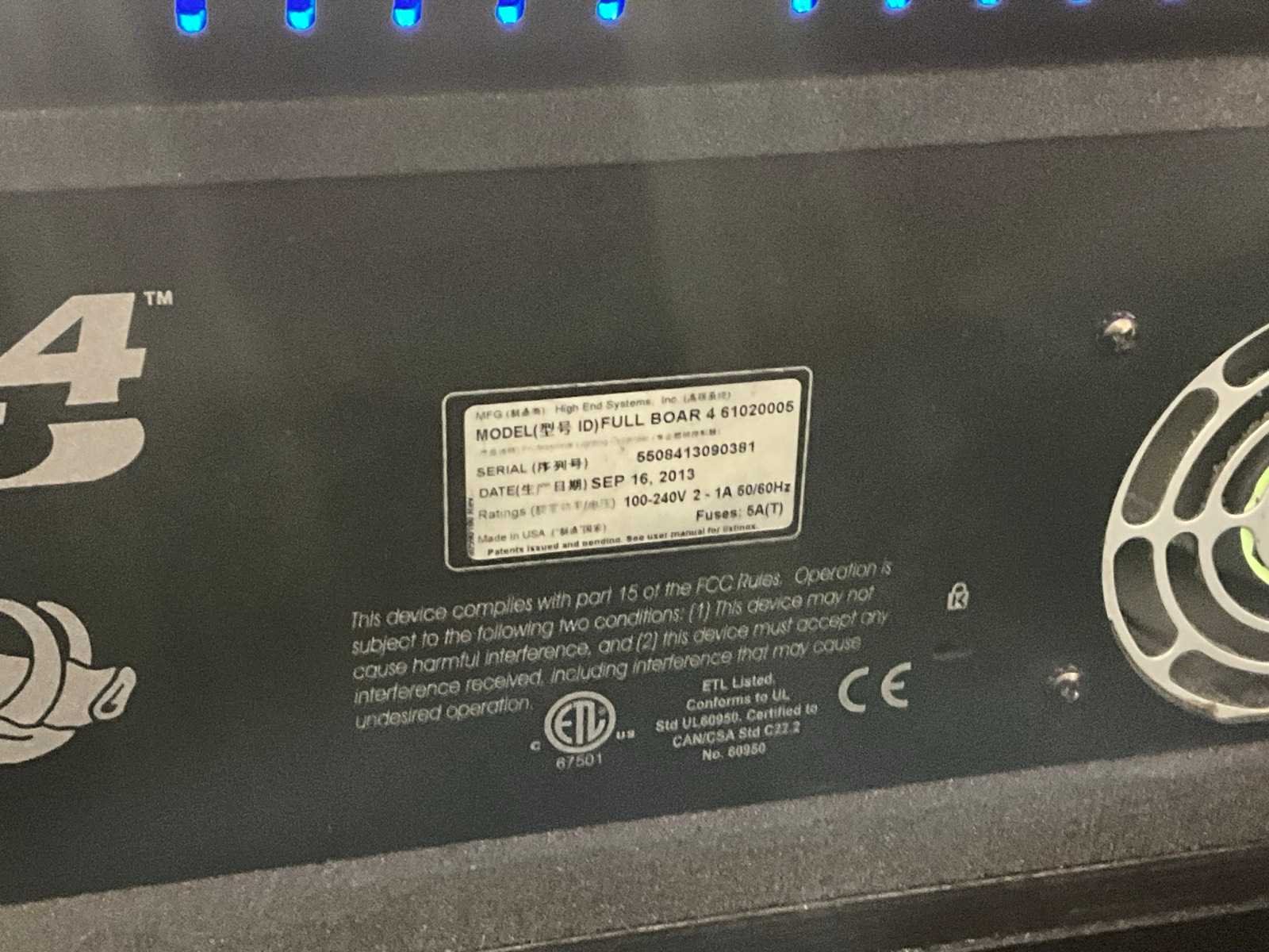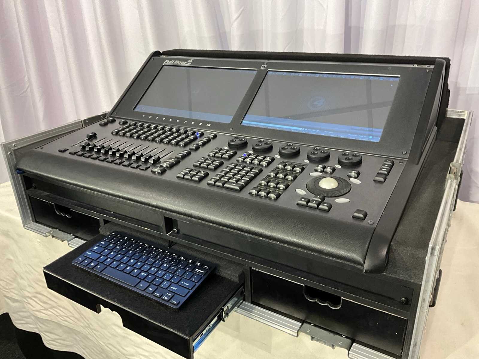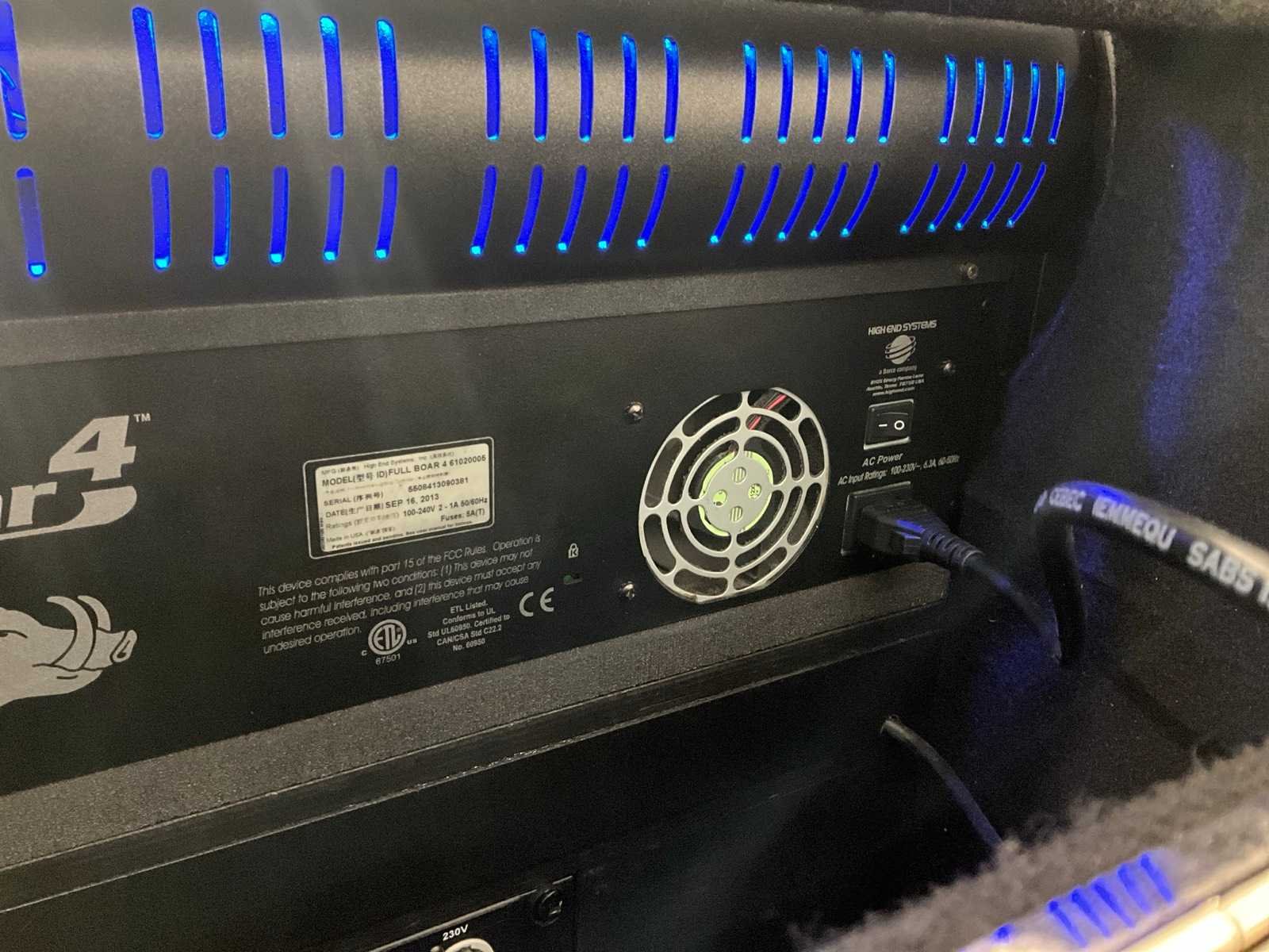 Inclusief: High End Systems Fullboar4, Flightcase met lades. Voorzien van: 6.144 parameters, 10 gemotoriseerde faders, 12x toewijsbare functie knoppen ,2x touchscreen 15.6", 4x DMX output, 1x Local Art-Net and E1.31/sACN output (Ethercon), 1x Unlimited DMX-512, Art-Net and E1.31/sACN universes (ethercon). Merk: High End Systems Type: Full Boar 4 Aantal kanalen: 10 Met flightcase: true Aansluiting: 230V