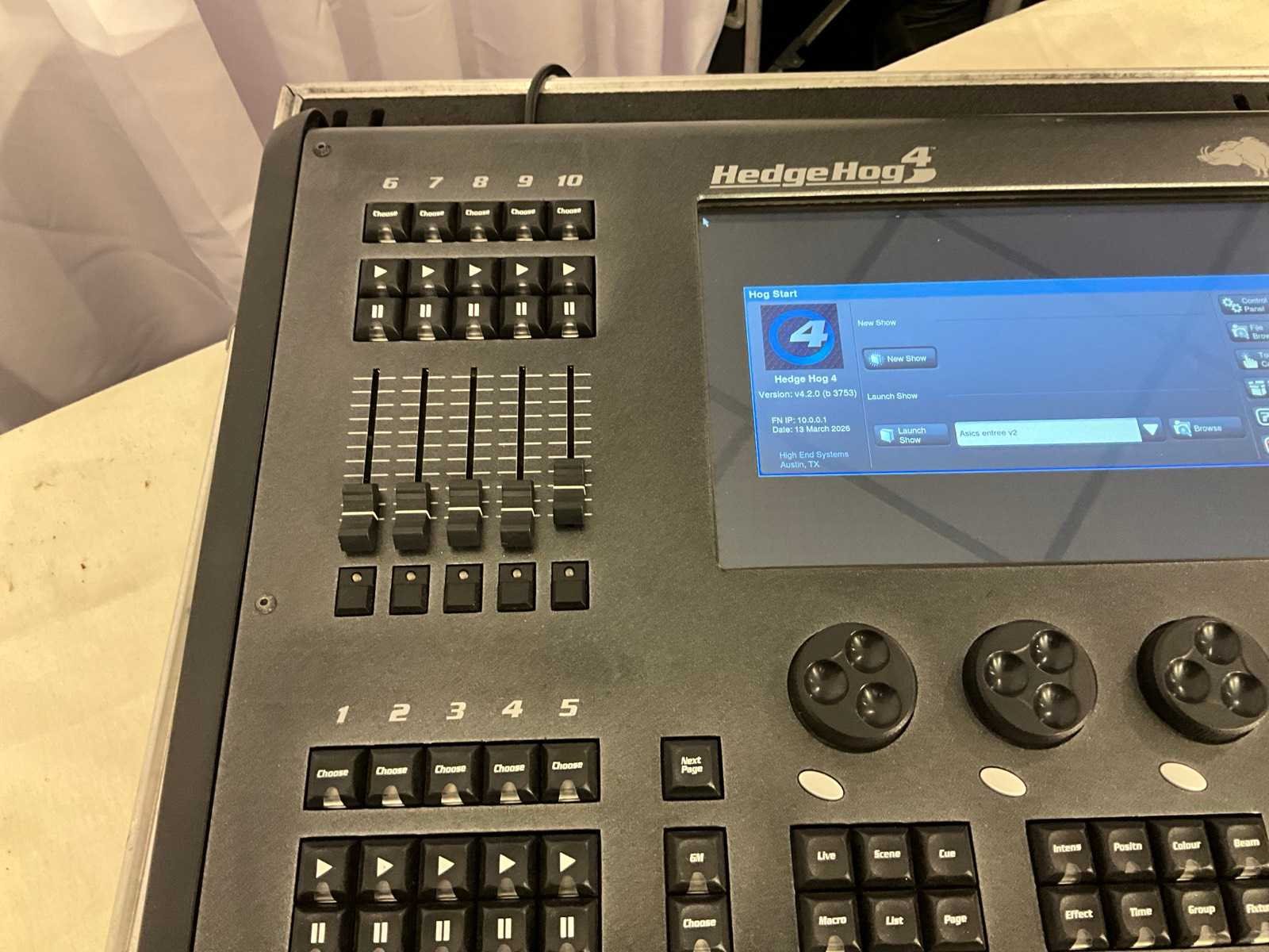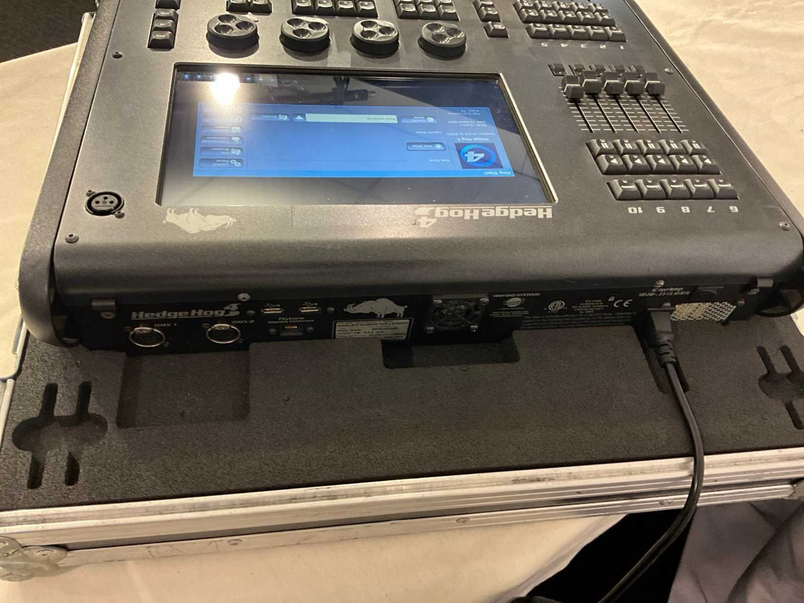 Inclusief: Flightcase. Voorzien van: 2.048 parameters, 10 faders, 12x toewijsbare functie knoppen, 1x touchscreen 12", 2x DMX output, 1x Fixture net poort (RJ45). Merk: High End Systems Type: HedgeHog 4