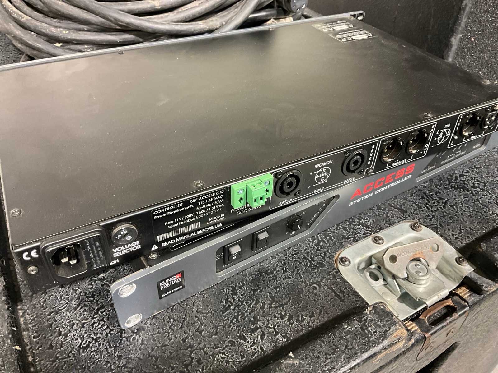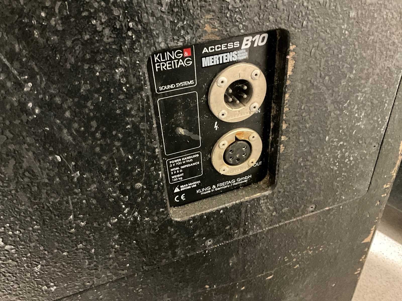 Bestaande uit: 2x Kling & Freitag B10 subwoofer, afmeting circa: 1350x600x1040 mm, 2x Acces C10 system controller, 2x NL4 speakON > EP5 10m, 2x NL4 speakON > EP5 20m Merk: Kling & Freitag Type: B10