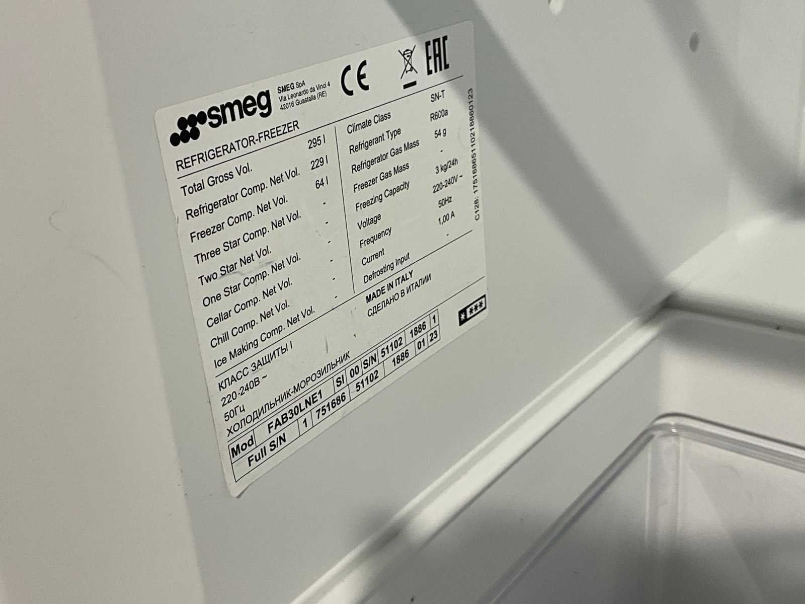 Transporttrolley niet inbegrepen Merk: Smeg Type: FAB30LNE1 Aansluiting: 230V Capaciteit.: 295l Totale afmeting L: 73cm Totale afmeting Breedte: 59cm Totale afmeting Hoogte: 170cm