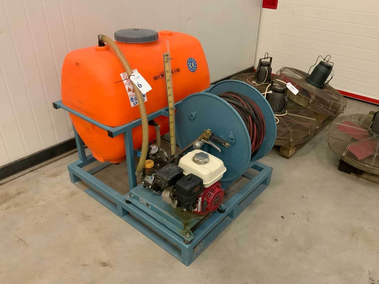 Voorzien van honda GX 160 benzinemotor, slang op haspel, met spuitlans Merk: Empas Type: 30-40-300 BS Bouwjaar: 2014 Serienummer: 33662 PA330 Totale afmeting L: 1300mm Totale afmeting Breedte: 1050mm Totale afmeting Hoogte: 1150mm