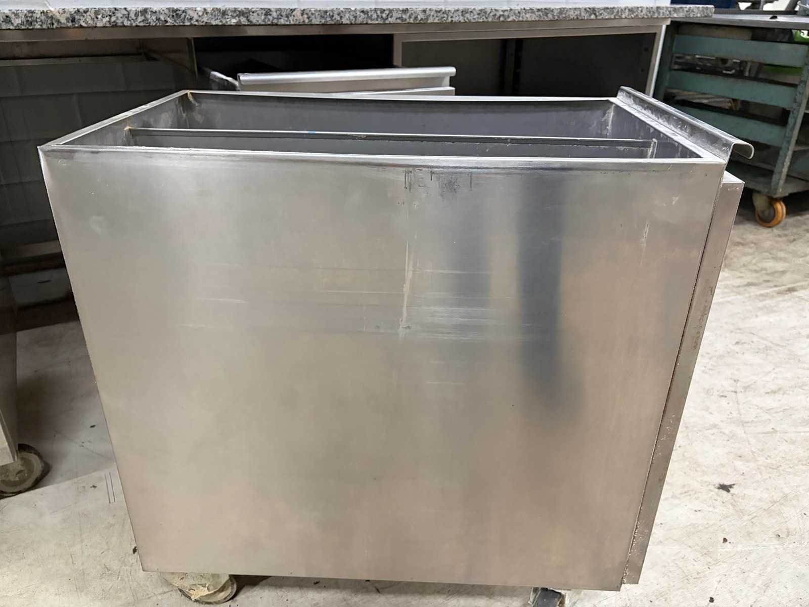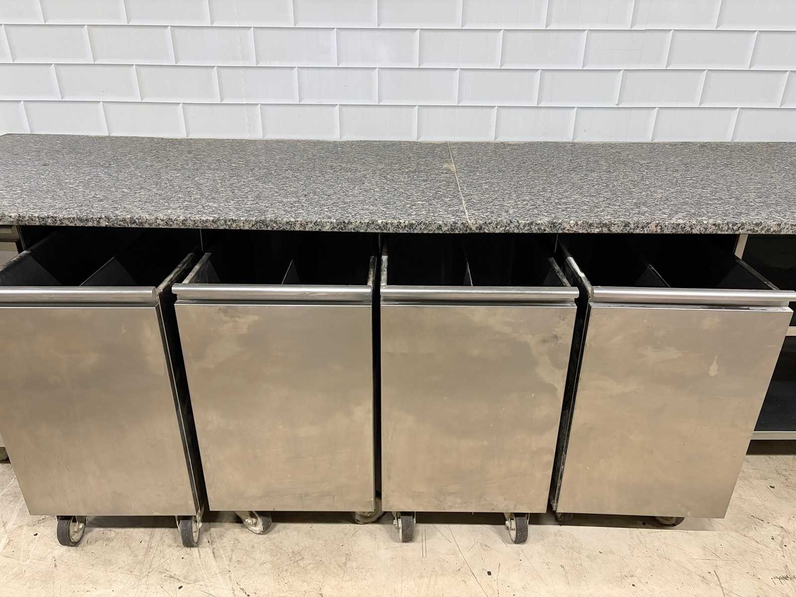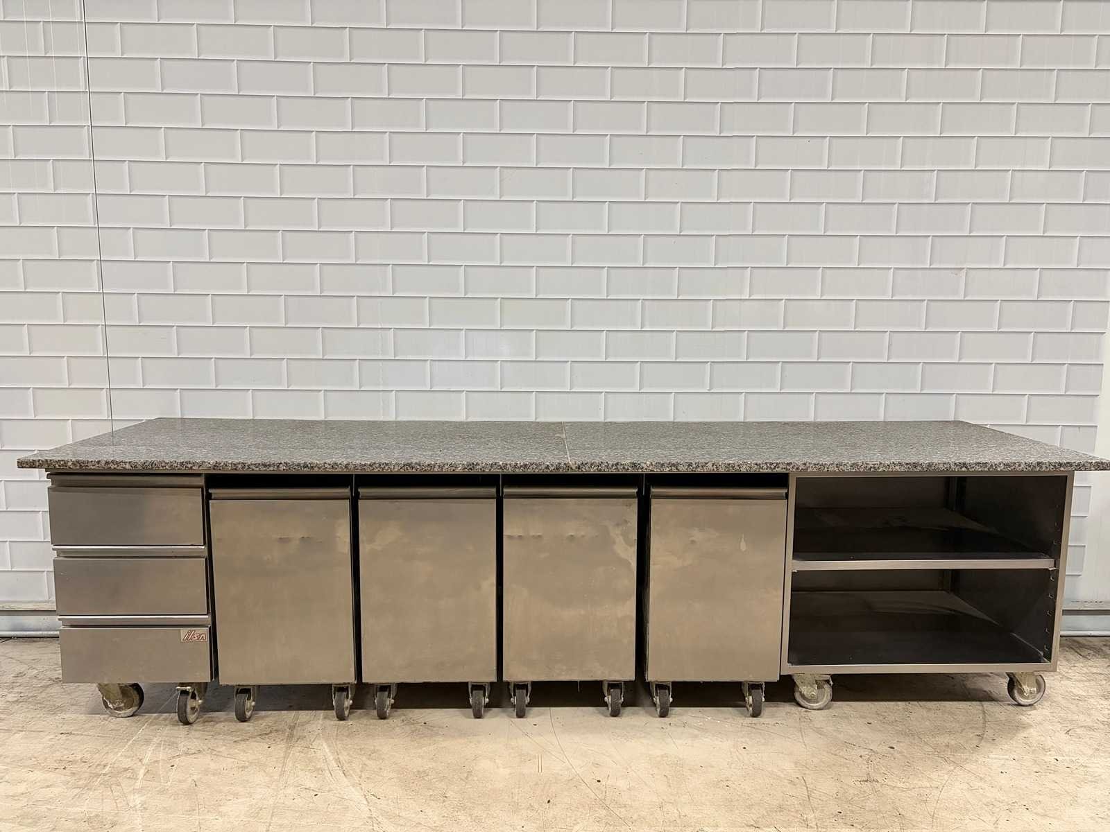 Voorzien van 4 x RVS Grondstoffen wagen Merk: Ilsa Mobiele Materiaal: RVS-Marmer Aantal laden: 3pcs Lengte: 320cm Breedte: 90cm Hoogte: 87cm