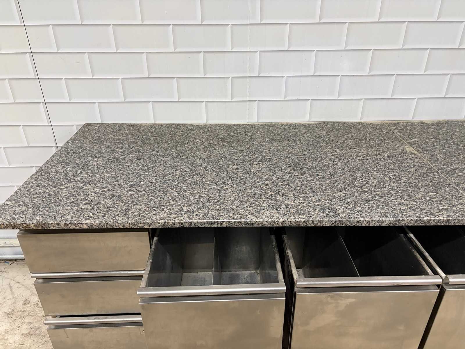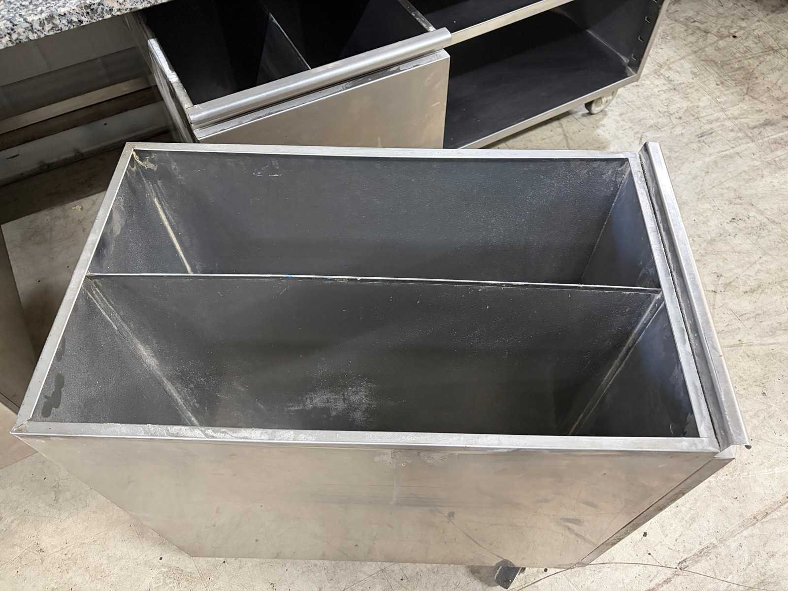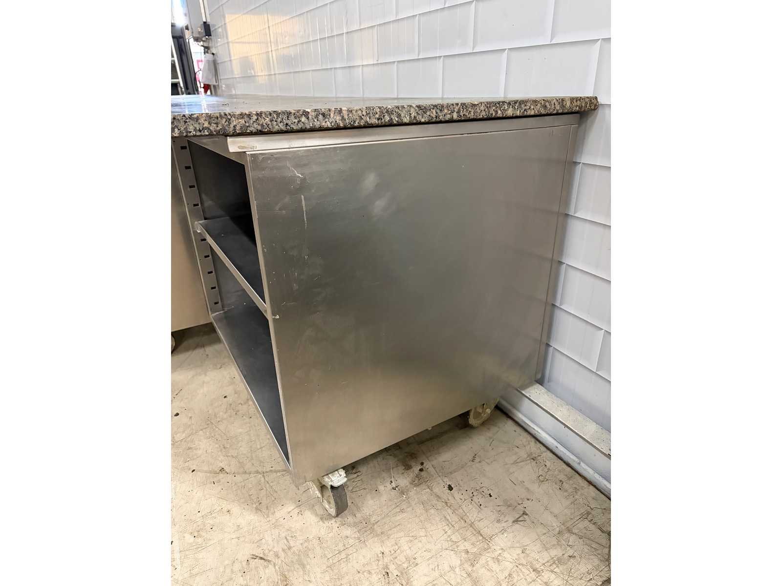 Voorzien van 4 x RVS Grondstoffen wagen Merk: Ilsa Mobiele Materiaal: RVS-Marmer Aantal laden: 3pcs Lengte: 320cm Breedte: 90cm Hoogte: 87cm