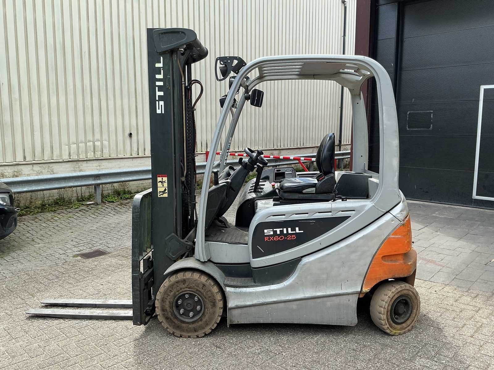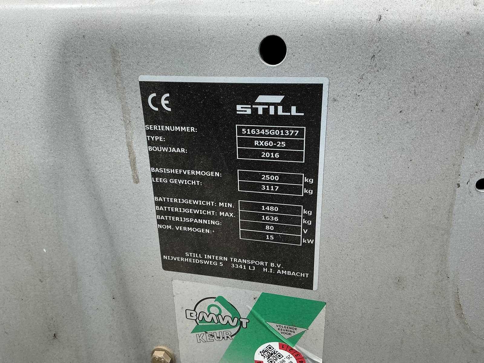 Merk: STILL Type: RX60-25 Bouwjaar: 2016 Serienummer: 516345G01377 Mast: Niho Afgelezen urenstand: 6479 Free-lift: true Side-shift: true Eigen gewicht: 4500kg Hefvermogen: 2500kg Lepellengte: 1200mm Hefhoogte: 3690mm Minimale doorrijhoogte: 2450mm