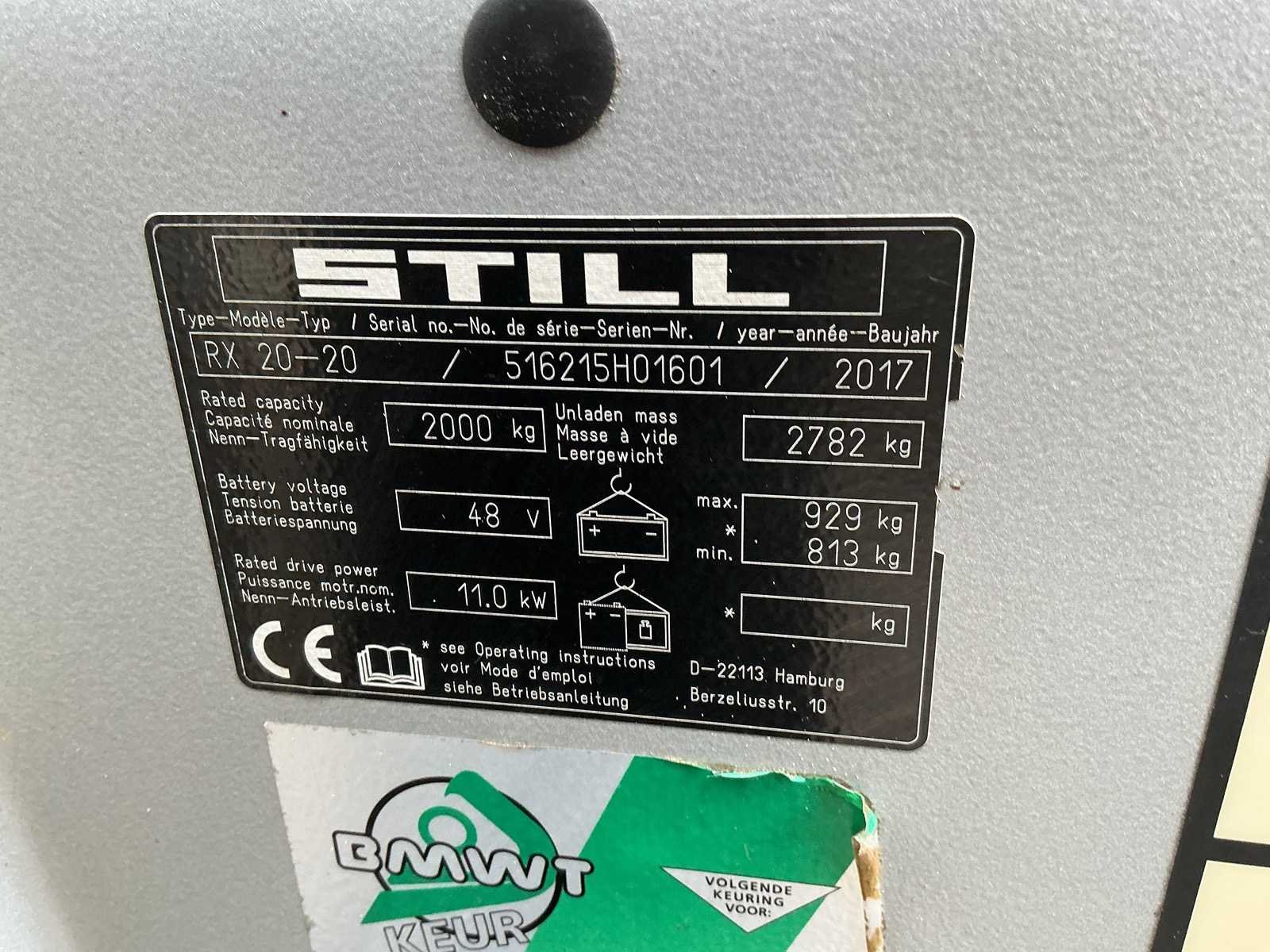 Inrij cabine Merk: STILL Type: RX20-20 Bouwjaar: 2017 Serienummer: 516215H01601 Mast: Triplex Afgelezen urenstand: 8152 Free-lift: true Side-shift: true Triple mast: true Hefvermogen: 2000kg Lepellengte: 1000mm Hefhoogte: 5080mm Minimale doorrijhoogte: 2260mm