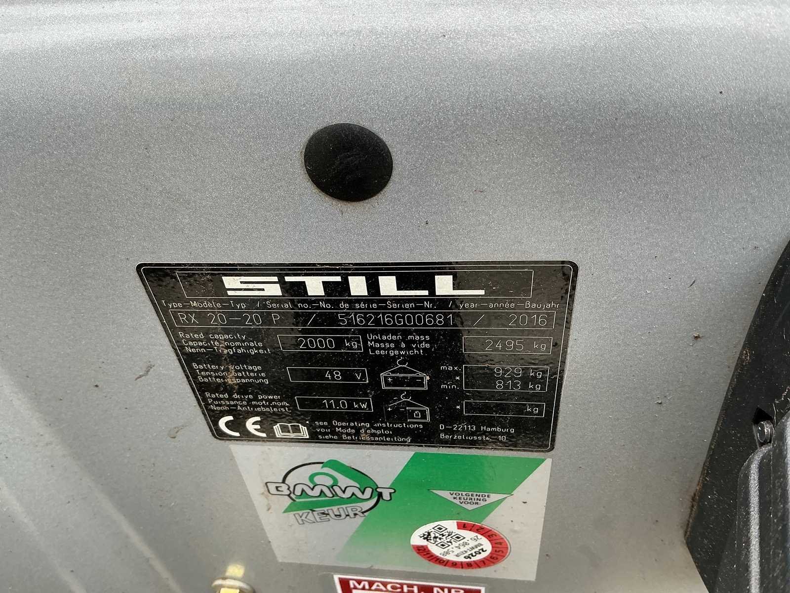 Merk: STILL Type: RX20-20P Bouwjaar: 2016 Serienummer: 516216G00681 Mast: Niho Aantal wielen: 4 Afgelezen urenstand: 8561 Free-lift: true Lepellengte: 1100mm Hefhoogte: 3270mm Minimale doorrijhoogte: 2160mm