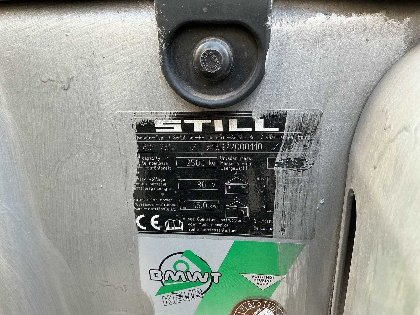Merk: STILL Type: RX60-25 Bouwjaar: 2012 Serienummer: 516322C00110 Mast: Niho Free-lift: true Side-shift: true Duplex mast: true Hefvermogen: 2500kg Lepellengte: 1000mm Hefhoogte: 3100mm Minimale doorrijhoogte: 2200mm