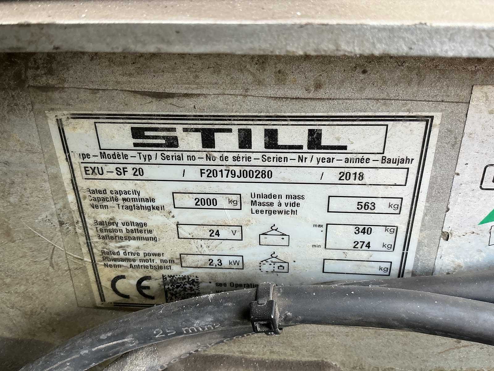Merk: STILL Type: EXU-SF20 Bouwjaar: 2018 Serienummer: F20179J00280 Hefvermogen: 2000kg Lepellengte: 1190mm Meerij palletwagen: true Afgelezen urenstand: 7173