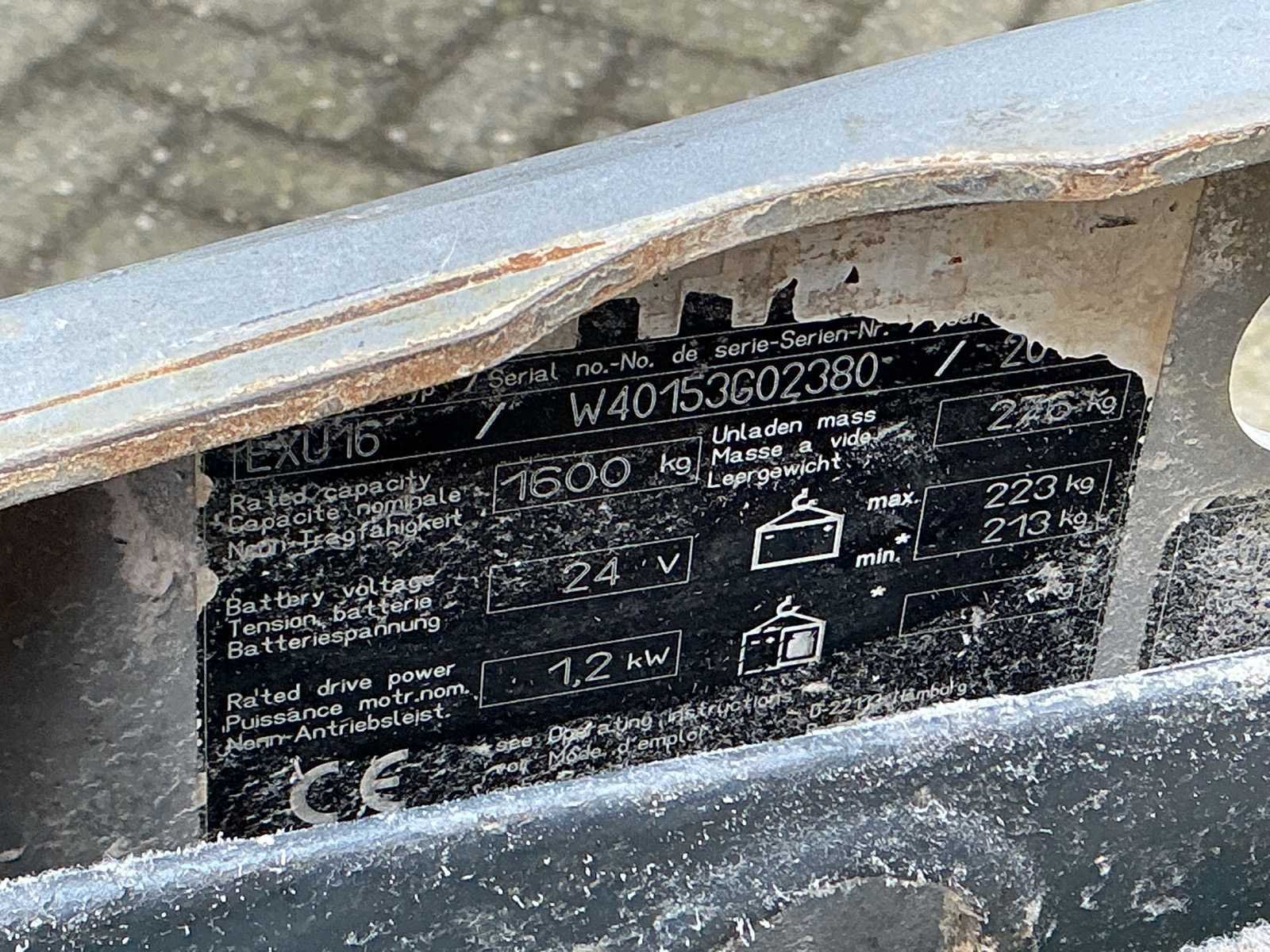 Merk: STILL Type: EXU16 Serienummer: W40153G02380 Hefvermogen: 1600kg Lepellengte: 1150mm Afgelezen urenstand: 7015