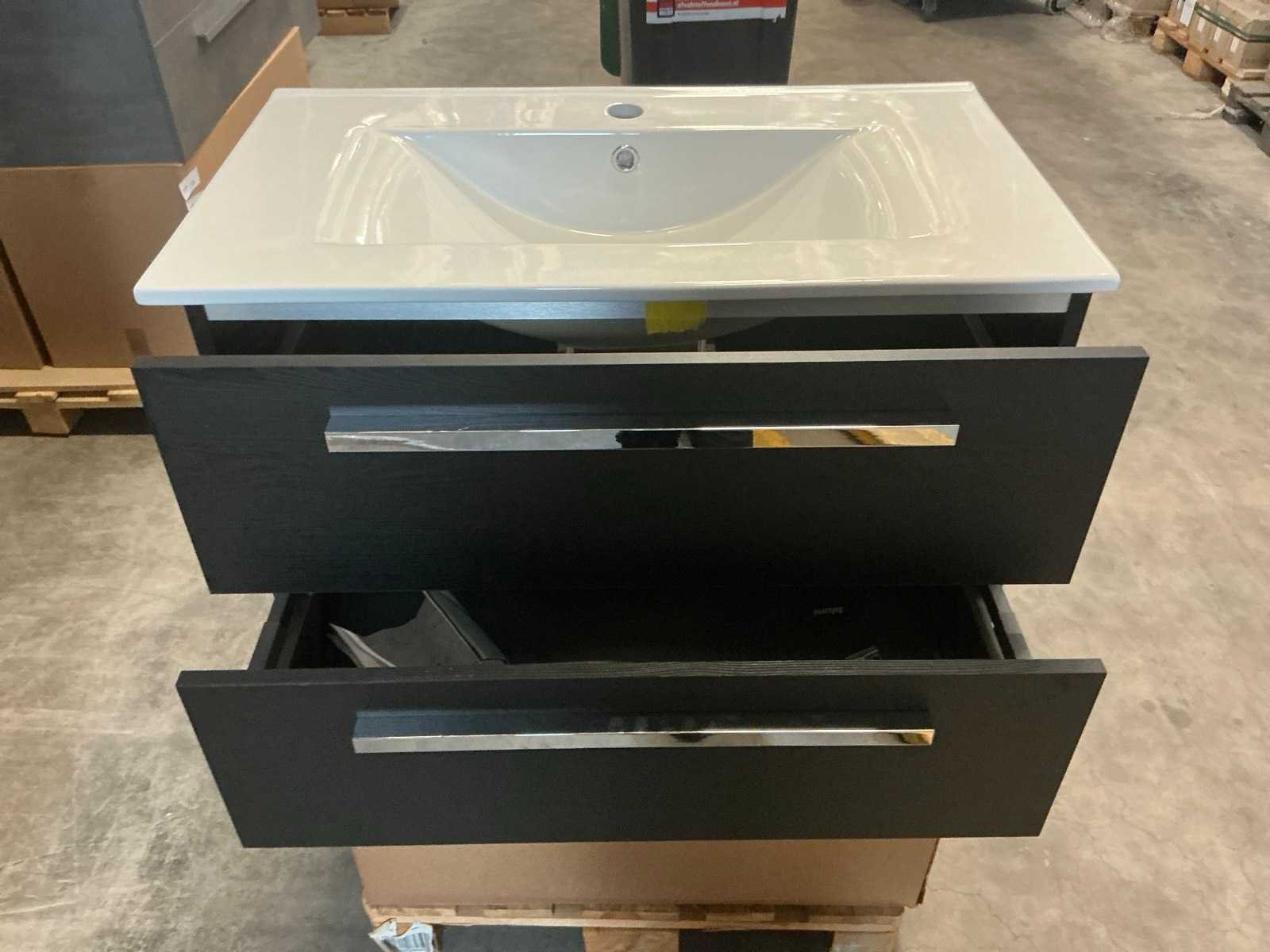 Merk: H&R design Hoogte: 51cm Lengte: 80cm Breedte: 46cm Kleur: Zwart Wastafel: Porto keramiek Lades: 2 Softclose: true