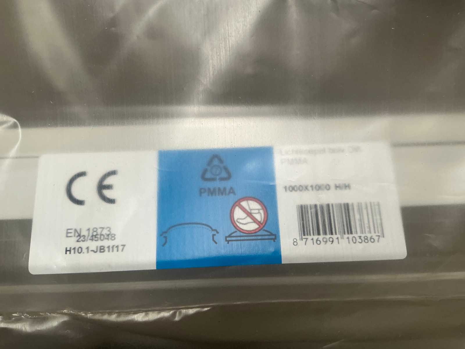Met rand, bolvormig helder acrylaat met rand. Dubbelwandig. 1x koepel, 1x rand Merk: JB Model: 100x100 DW Lengte: 100cm Breedte: 100cm Materiaal: Acrylaat