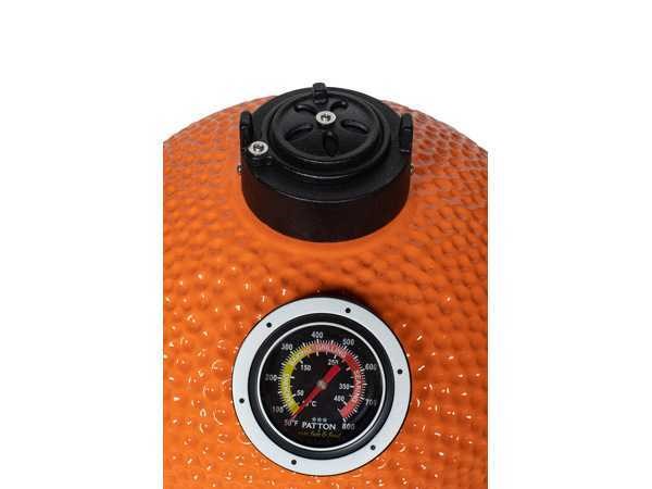 Verdere specificaties zijn: 15 inch, diameter grilloppervlak 34 cm Handig tafelmodel Zwart geëmailleerd van kleur Met zwart poedercoated onderstel incl. twee stevige handgrepen Merk: Patton Model: 55cce208 Product type: 15 inch Kleur: Oranje Gewicht: 38kg Materiaal: Keramiek