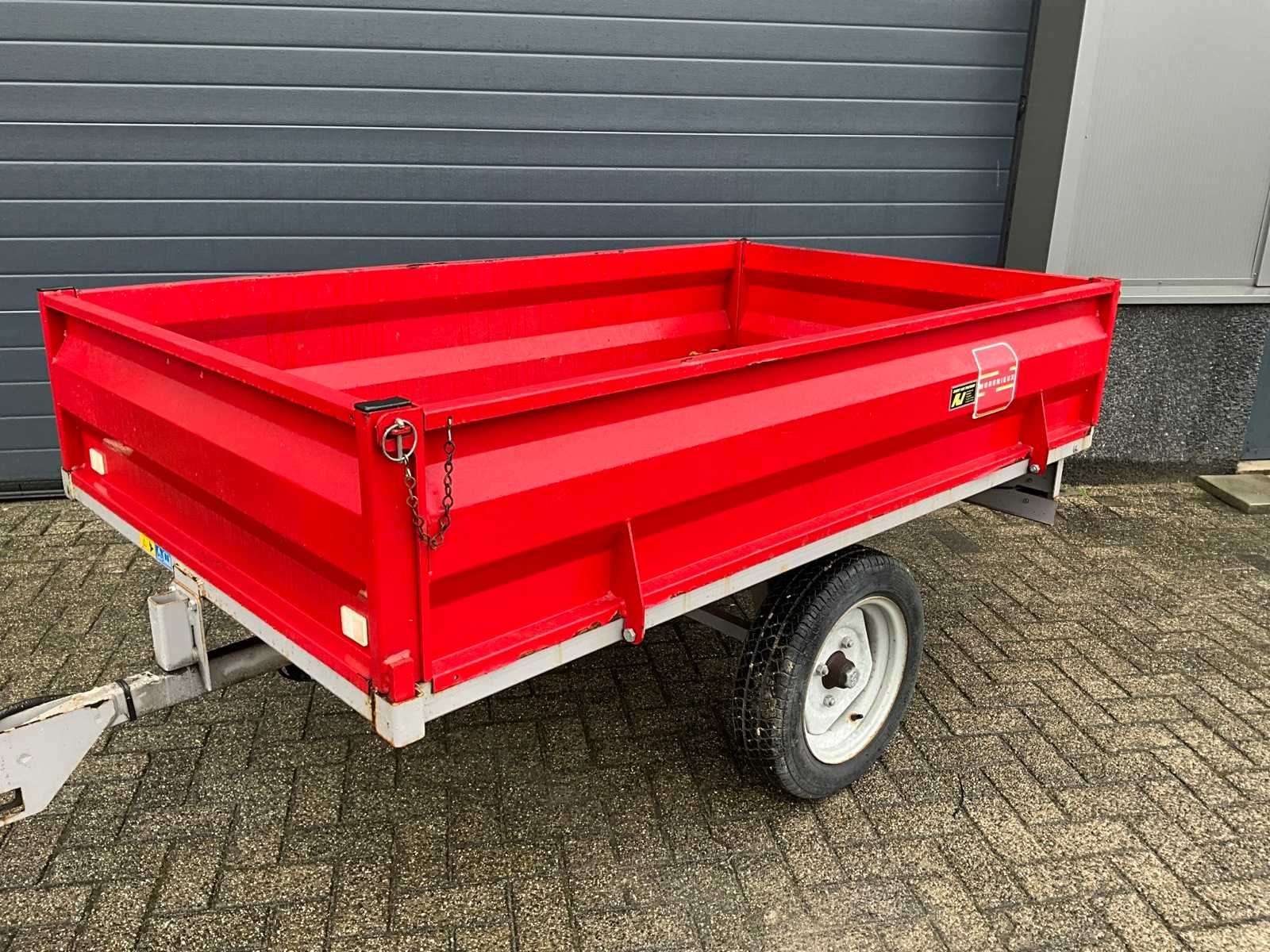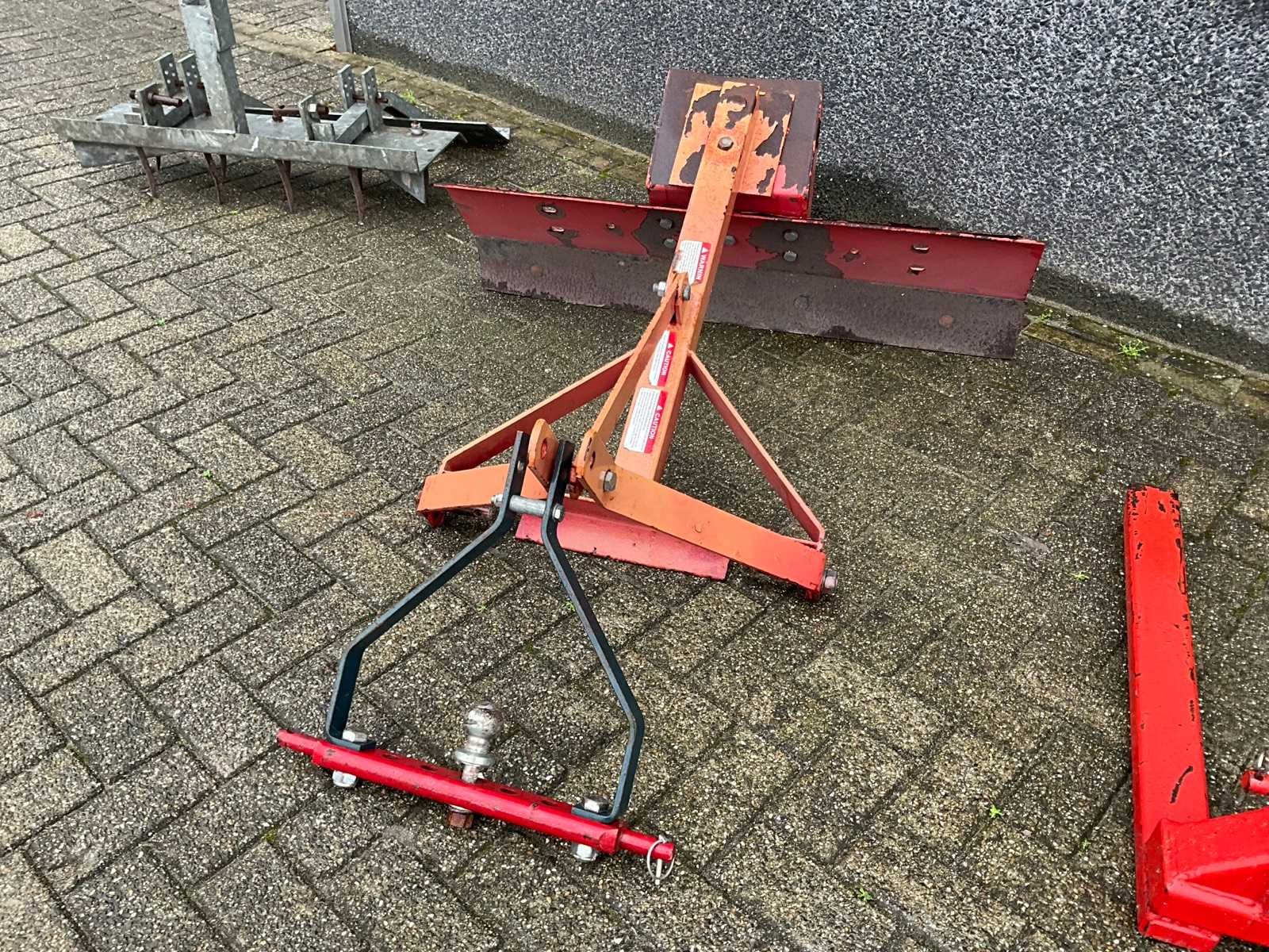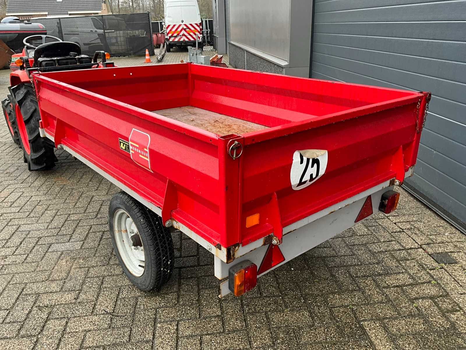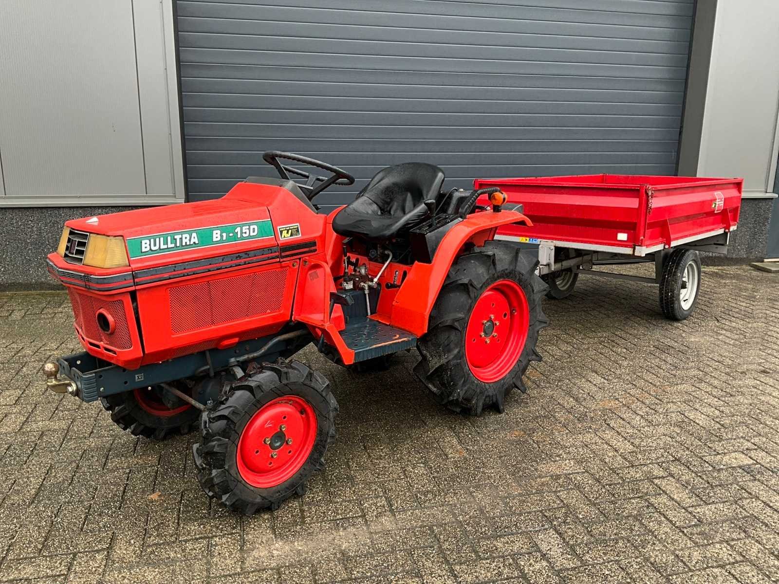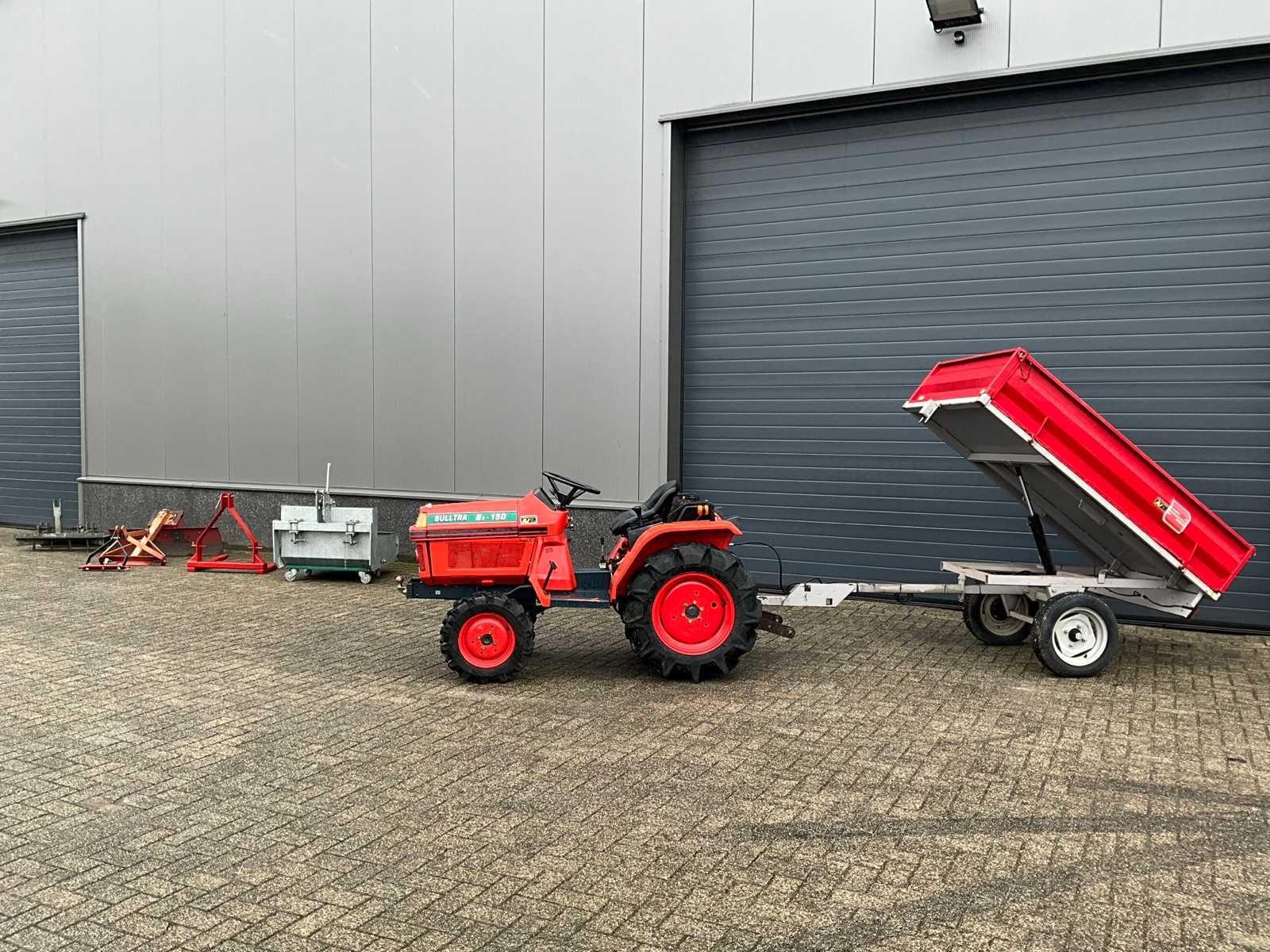 Voorzien van 1-assige kiepaanhanger en diverse accessoires waaronder grondschuif, 3-puntsframe en weidesleep Merk: Kubota Type: Bulltra B1-15D Afgelezen urenstand: 624 Aantal hydraulische ventielen achter: 1 Bandenmaat voor: 5.00-12