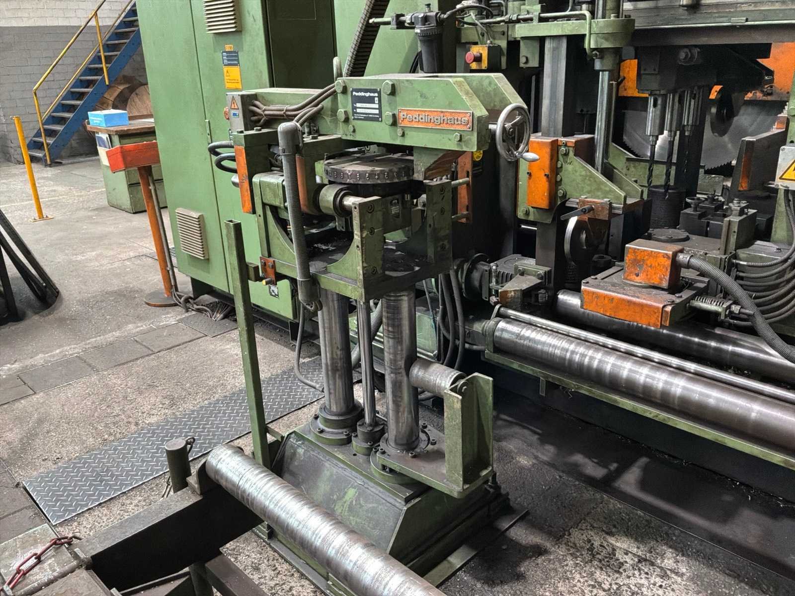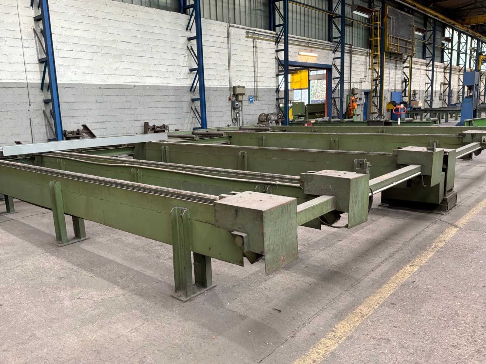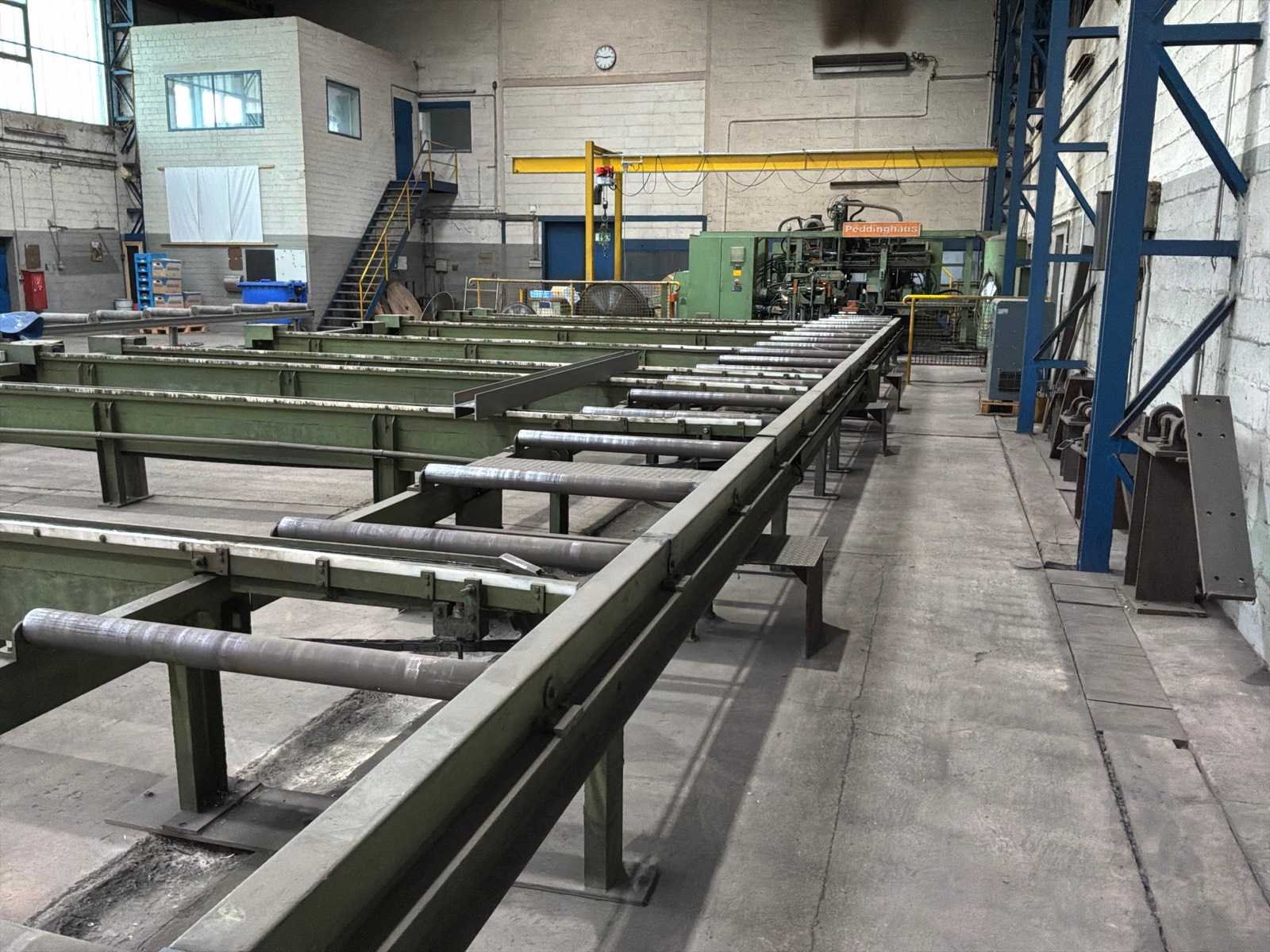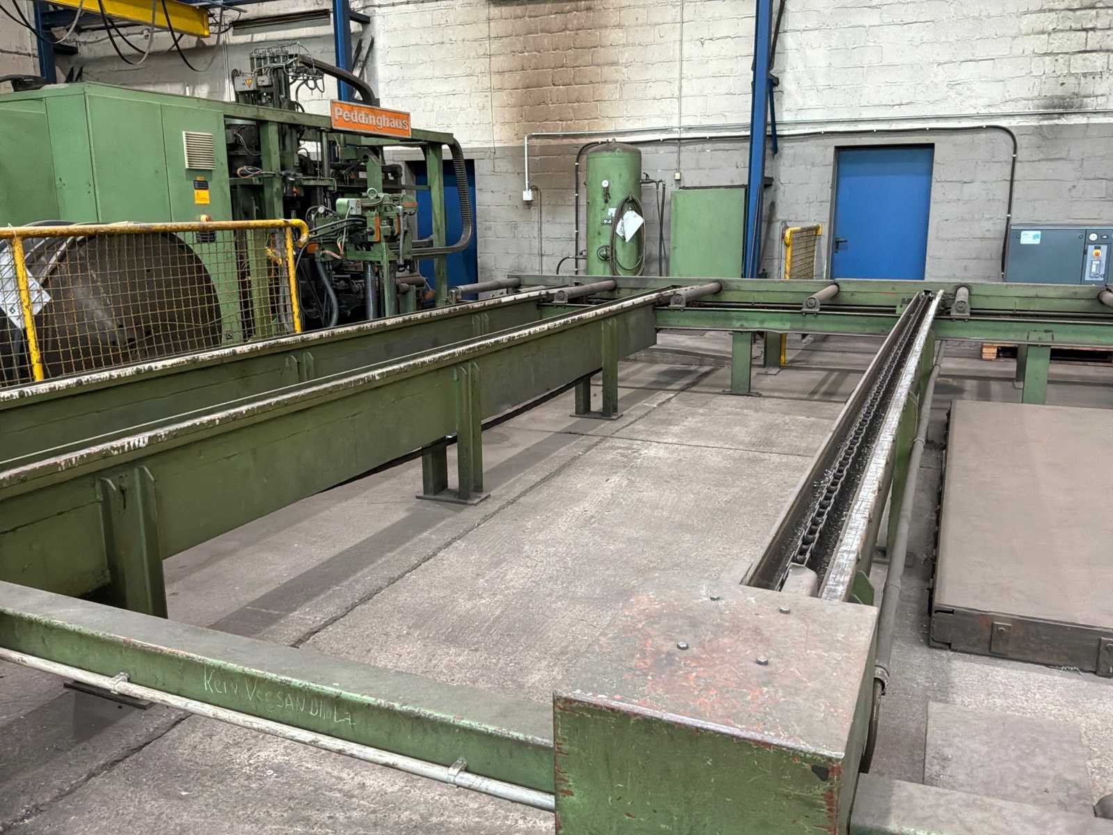 Met CNC-besturing, fabrikant FAGOR Geschat totaalgewicht machine en rollenbaan: 40 ton Kavel dient nog gedemonteerd te worden. Afmetingen rollenbaan (LxBxH) 18,5m X 7,5m X 85cm. Dit kavel bevindt zich nog op een externe locatie. Bezichtiging op de kijkdag enkel op afspraak mogelijk. Na sluiten van de veiling neemt de verkoper contact met u op voor het maken van een ophaalafspraak. Merk: Peddinghaus Type: SIGNO 05 UND TDK 1000/9G Serienummer: 4812674595006 Totale afmeting L: 5400mm Totale afmeting Breedte: 4800mm Totale afmeting Hoogte: 2900mm