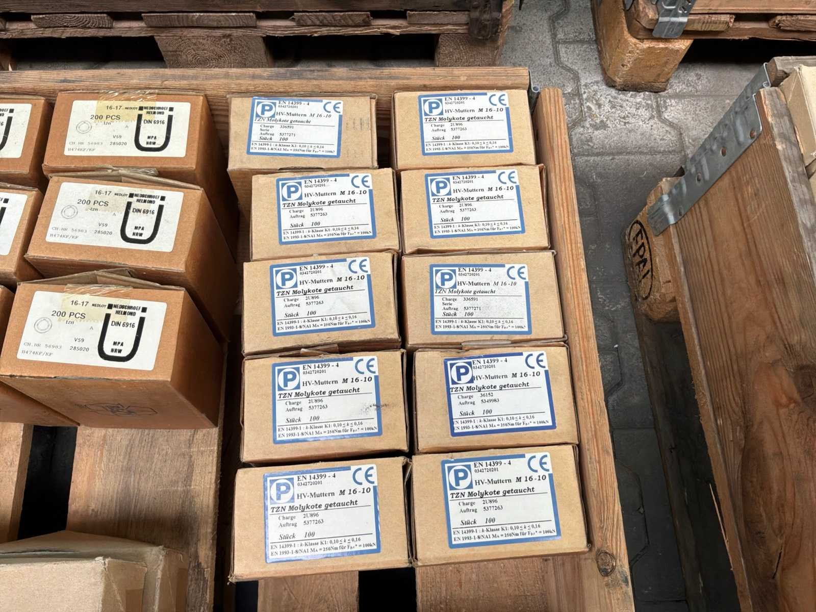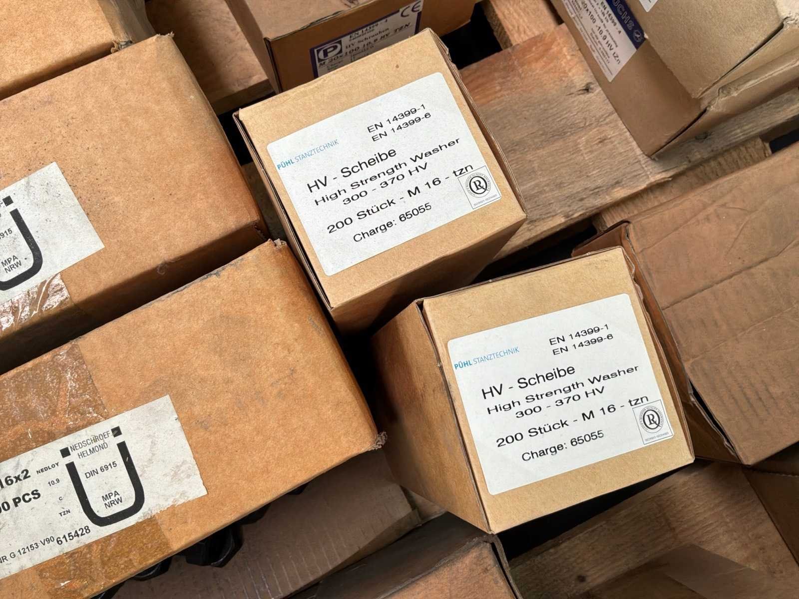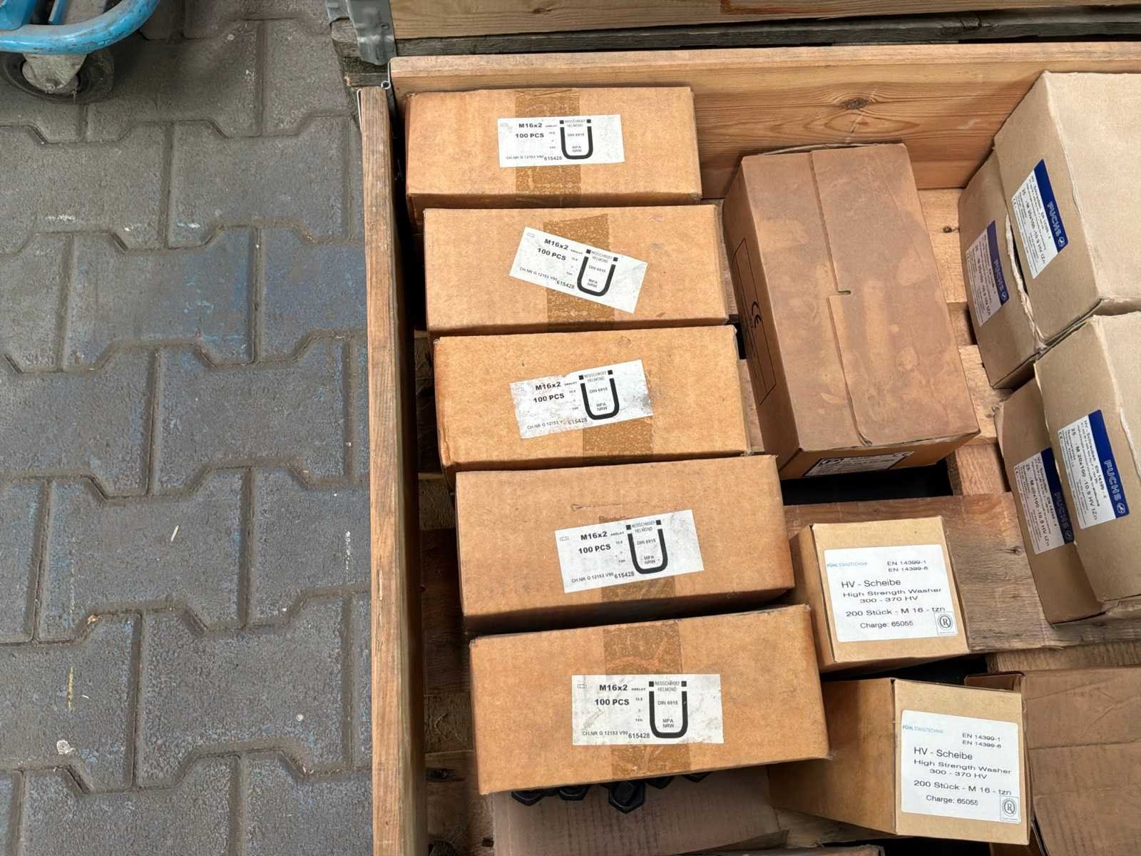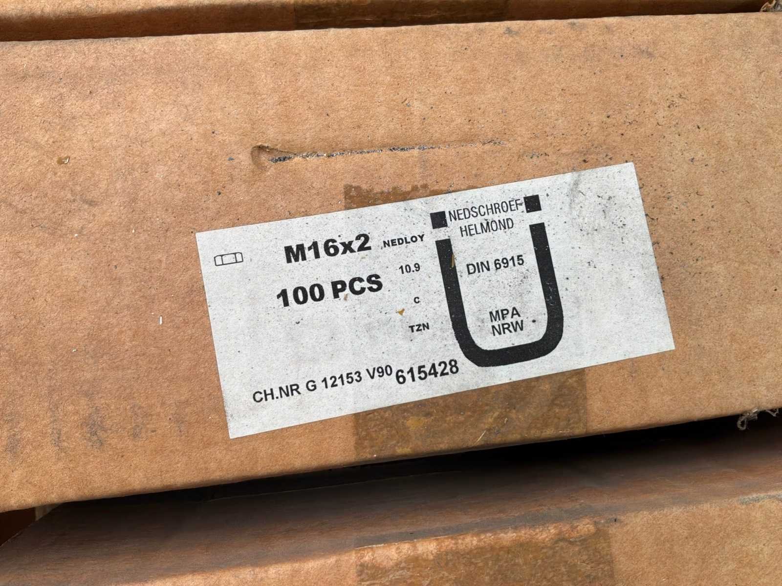 15x M16 moeren doosjes van 100 stuks 1x M16 moeren doos van 400 stuks 12x m16 ringen doosjes van 200 stuks 6x M20 bouten doosjes van 25 stuks