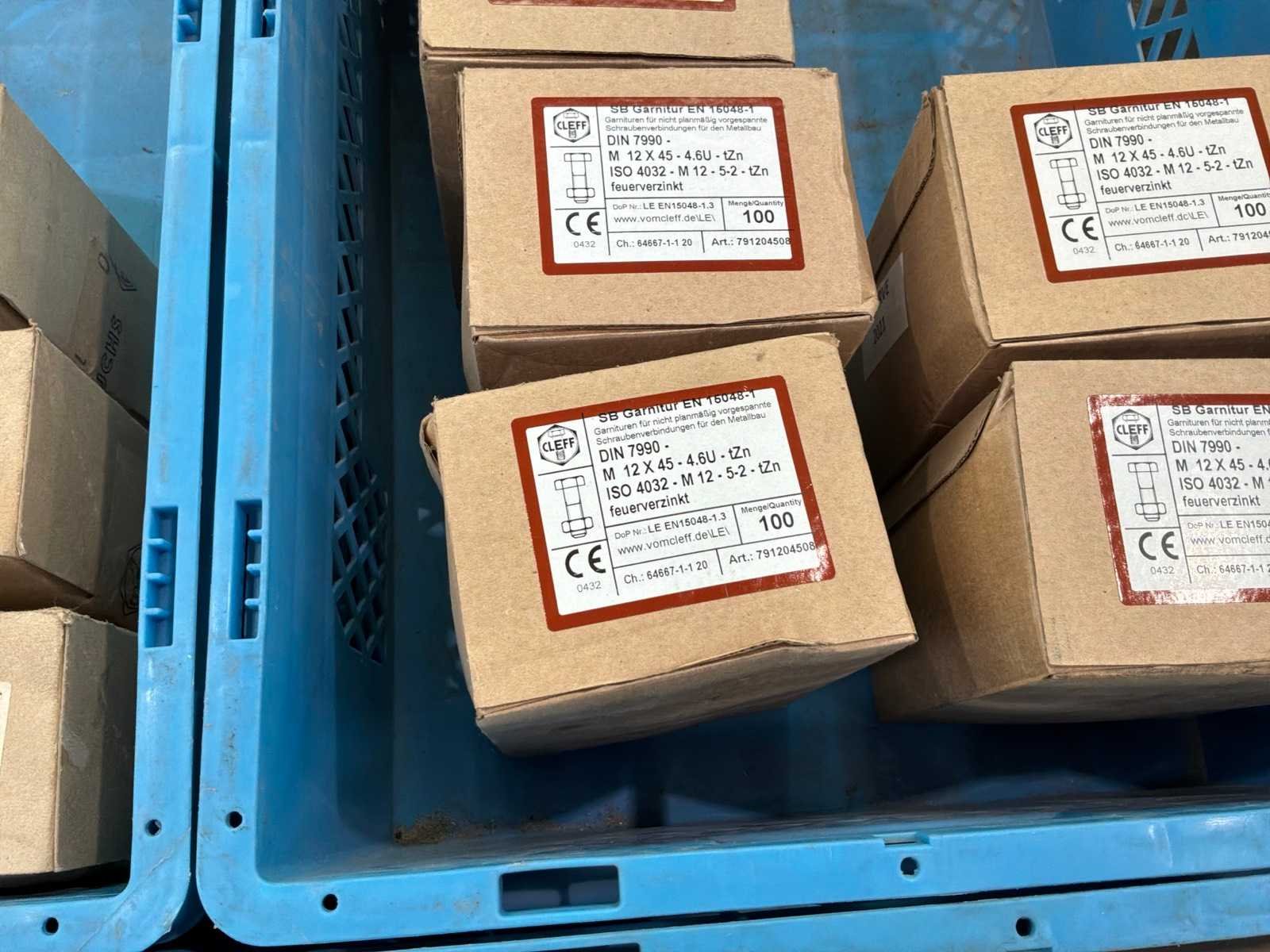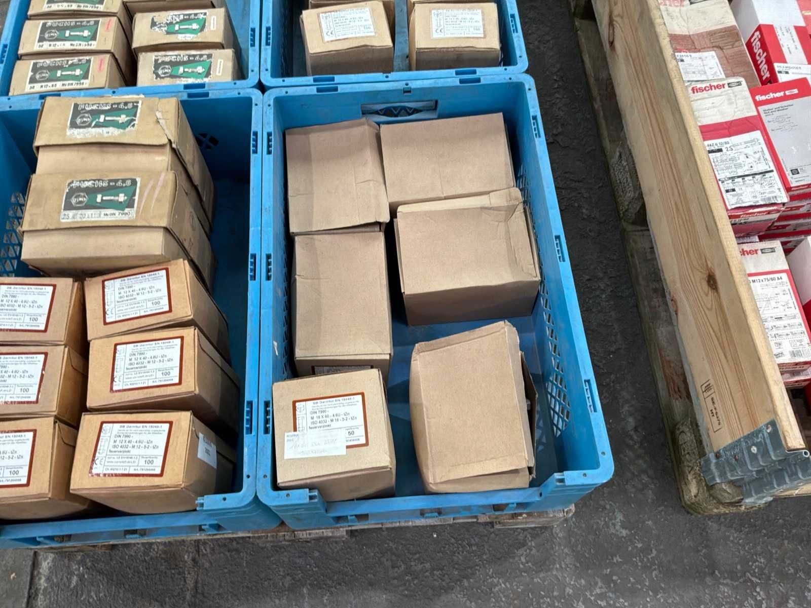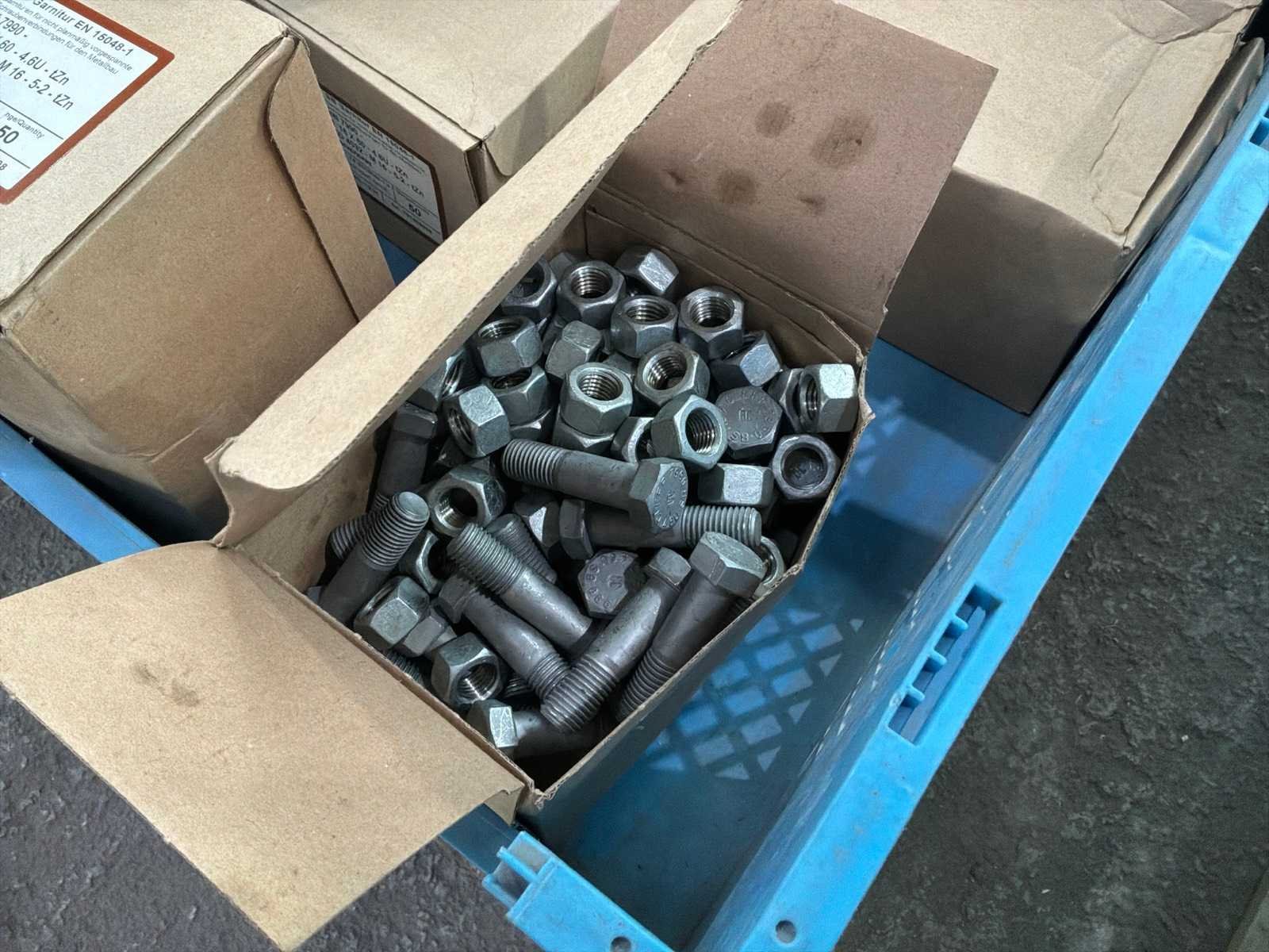 2x Doosjes met M20 bouten met moer van 25 stuks 6x Doosjes met M16 bouten met moer van 50 stuks 13x Doosjes met M12 bouten met moer van 100 stuks 7x Doosjes met M12 bouten met moer van 50 stuks Kavel komt NIET met de blauwe kratten.