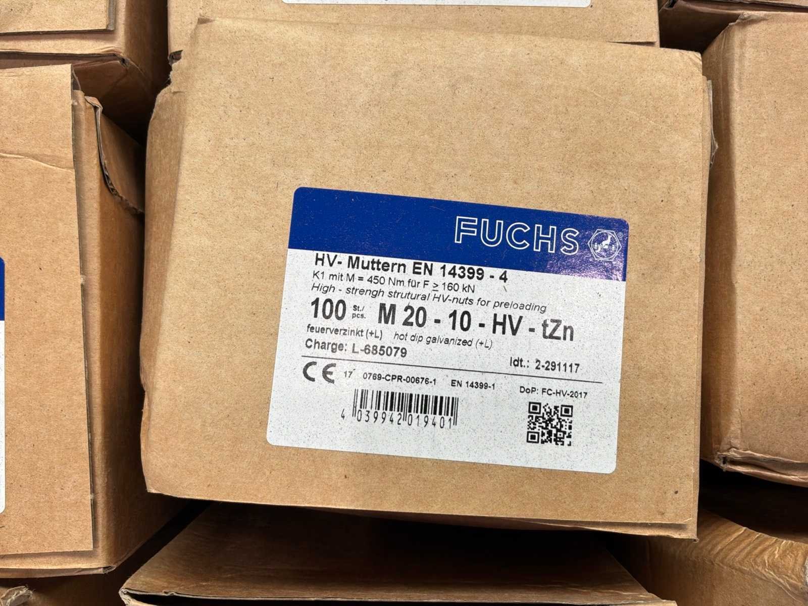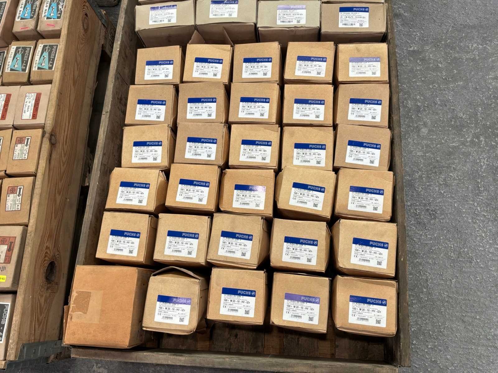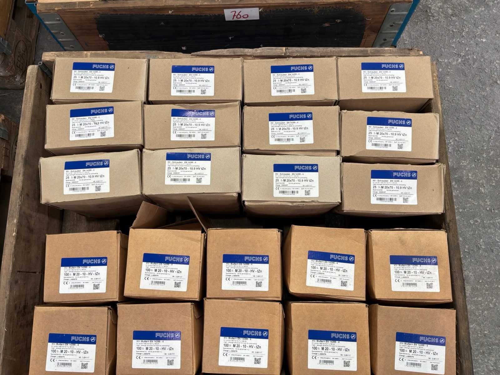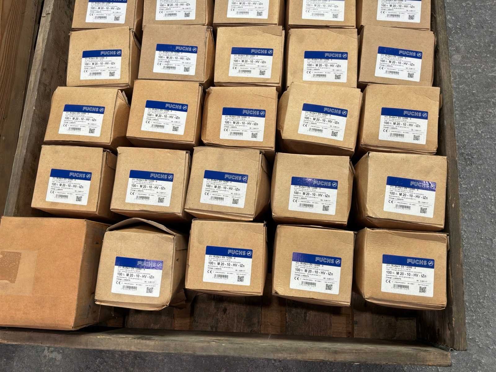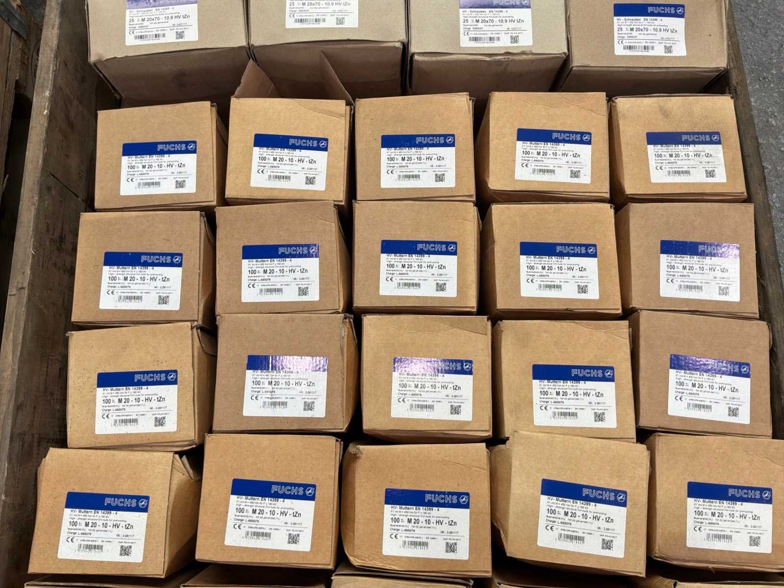 12x M20 bouten in doosjes van 25 stuks 30x M20 moeren in doosjes van 100 stuks