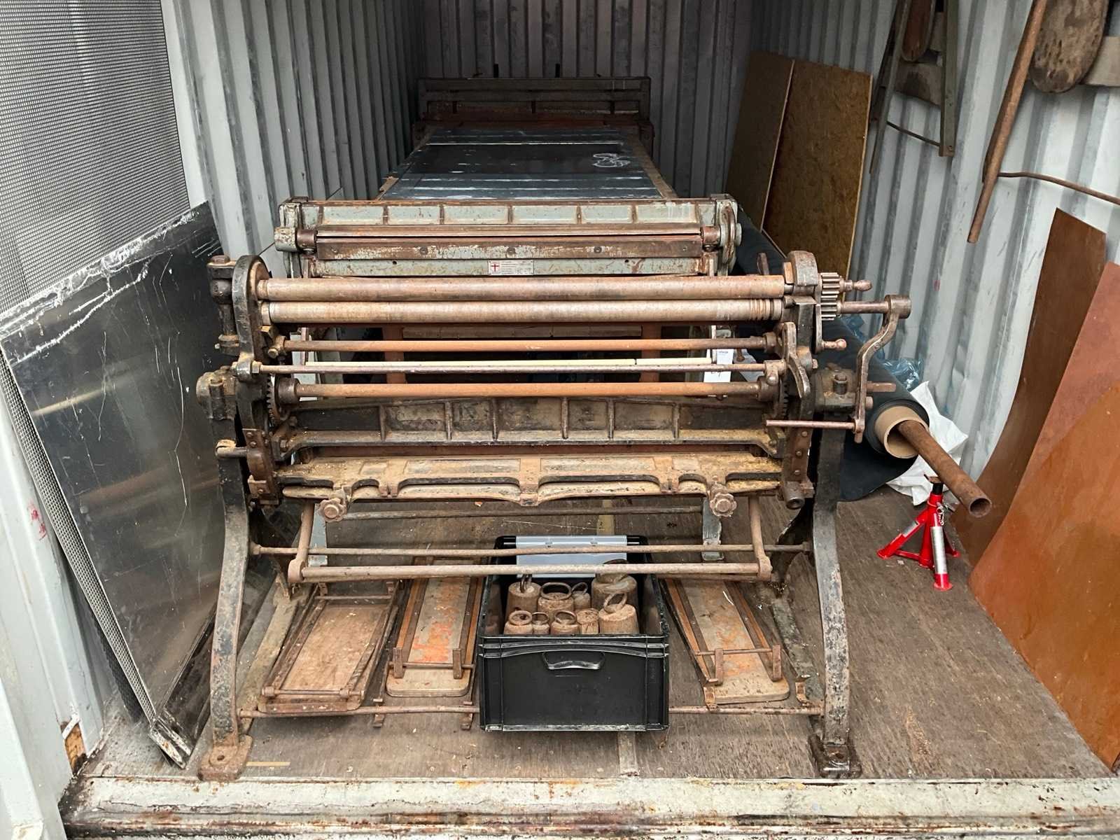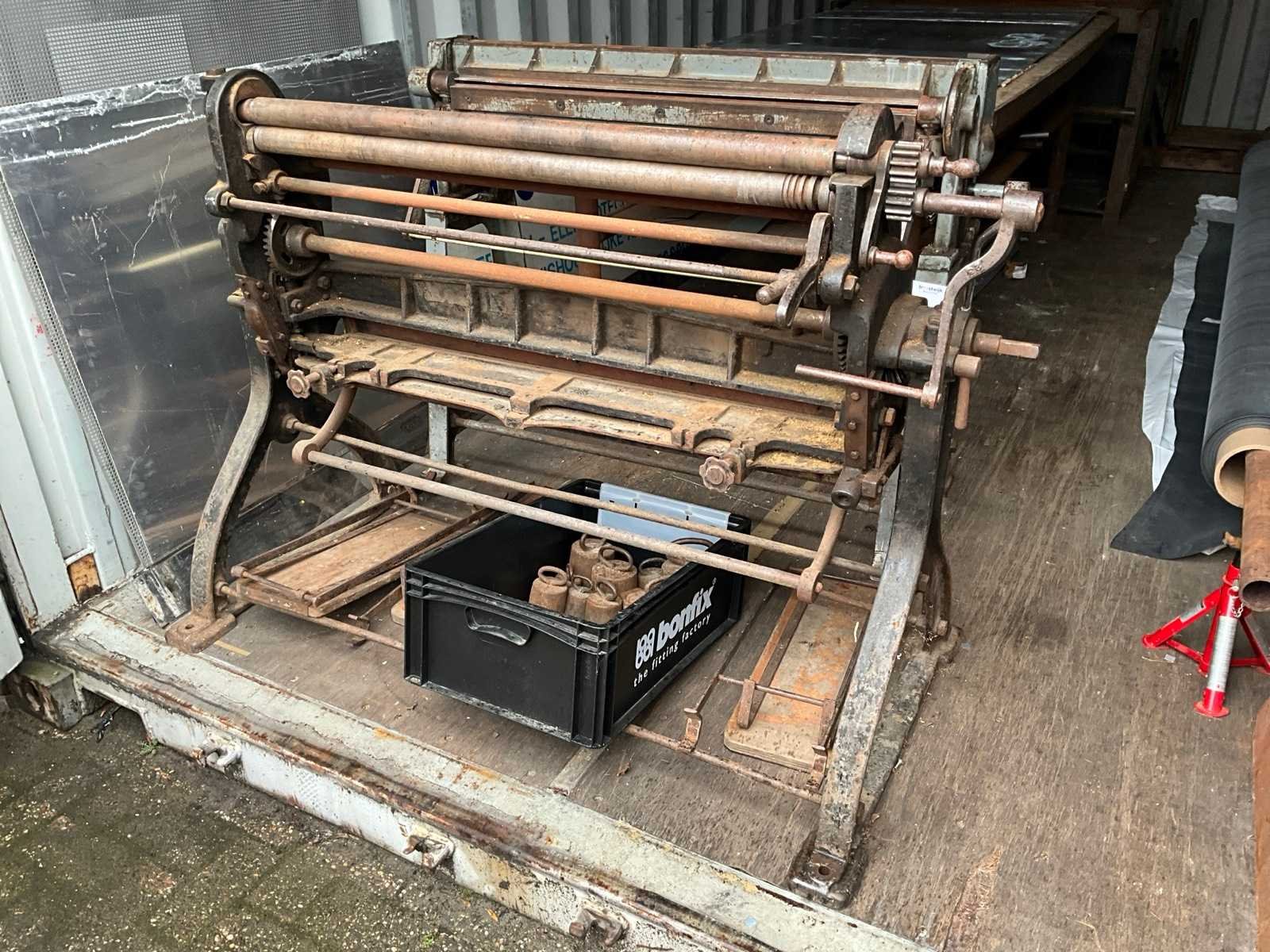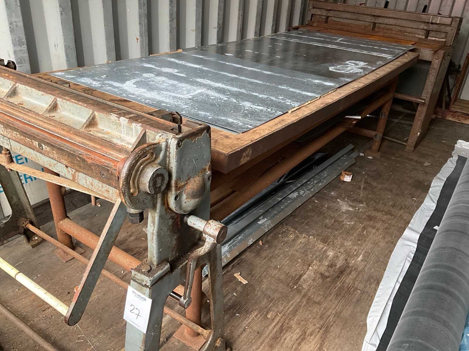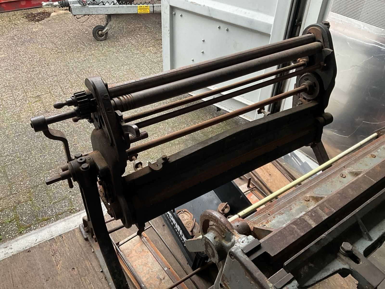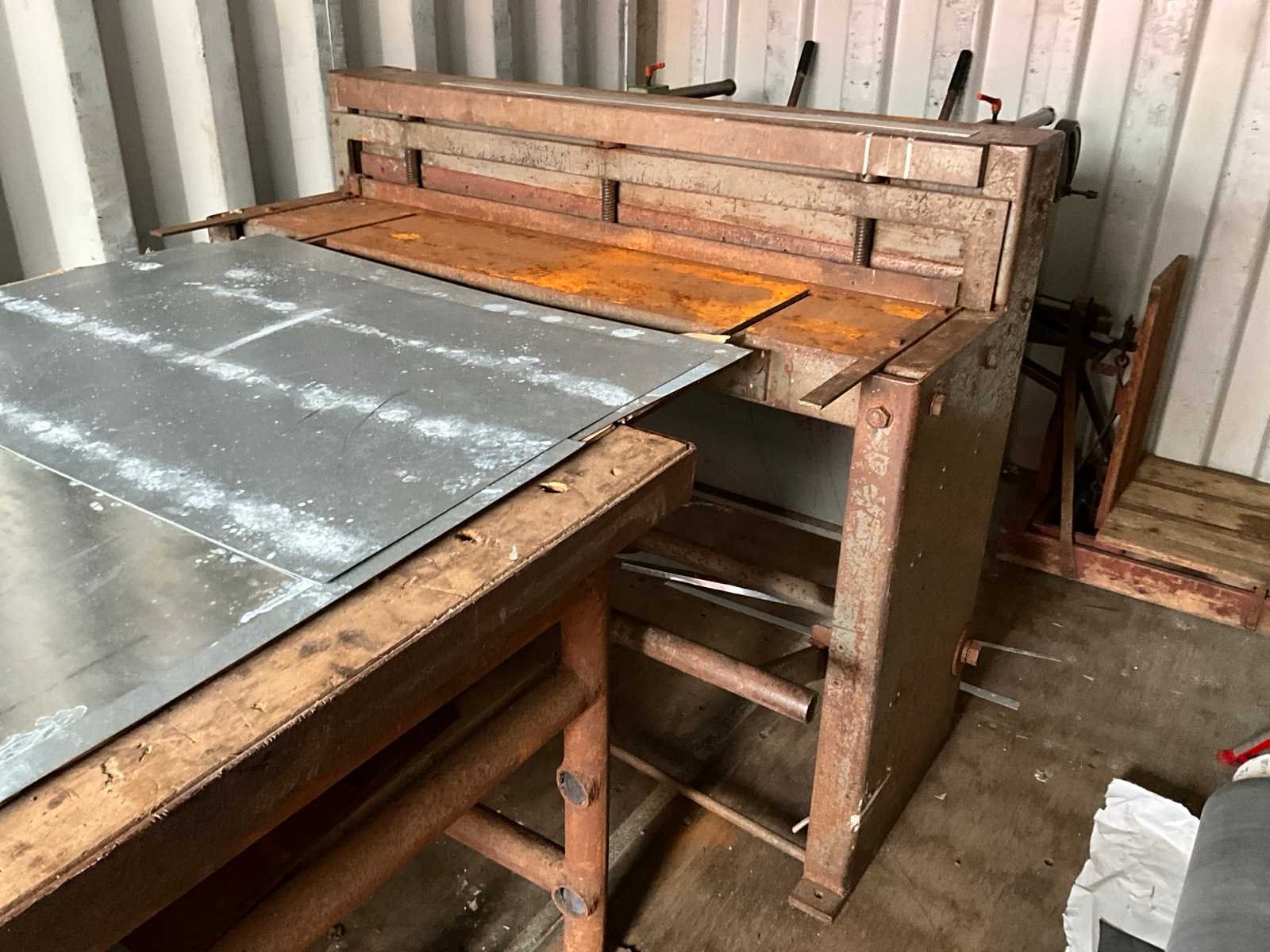 Bestaande uit: plaatwals werkbreedte 100cm, Jorg 4801 zetbank werkbreedte 100cm, tafel met guillotineschaar (120cm) H110xB145xL430cm en 2x pijpklem