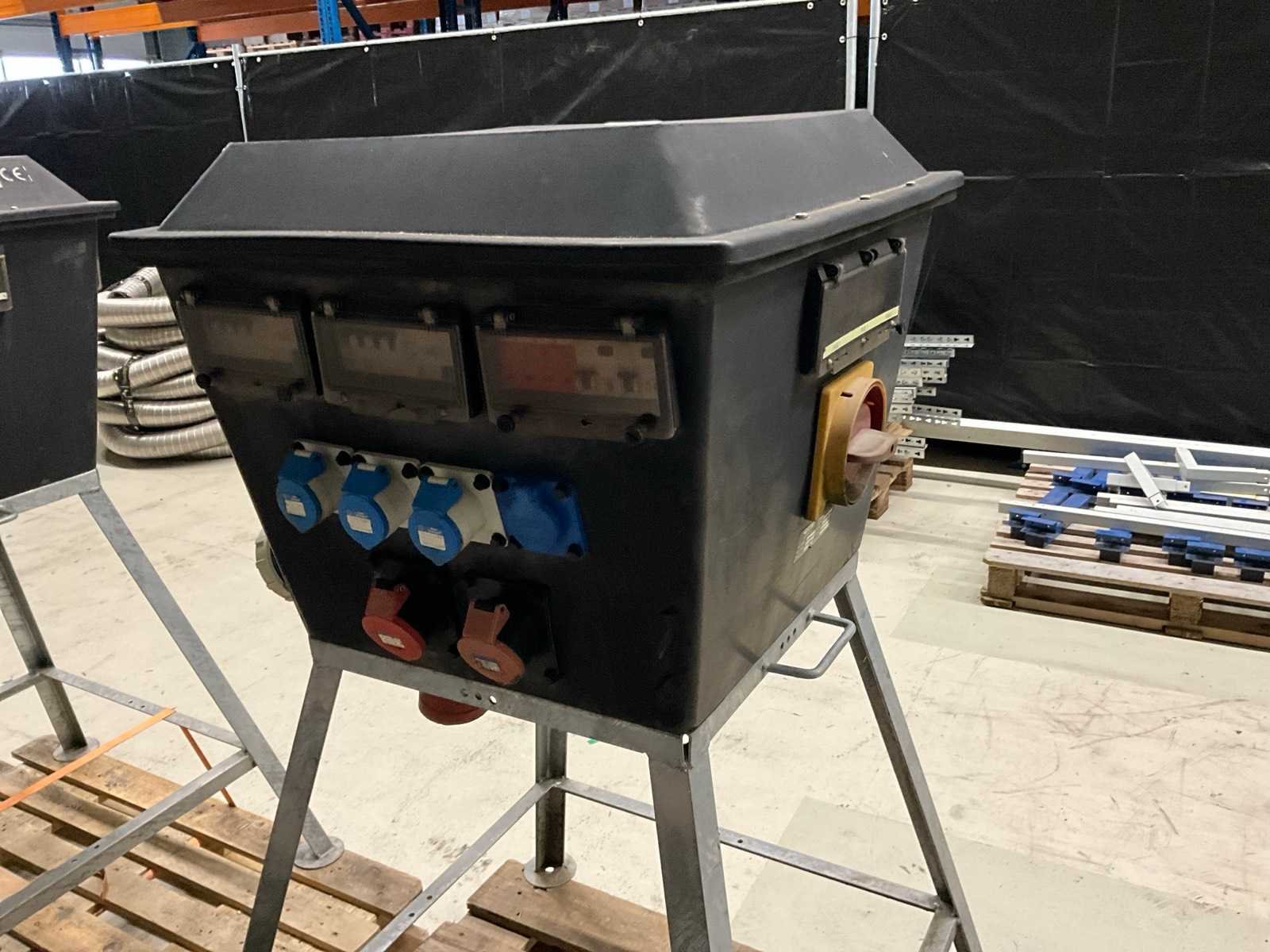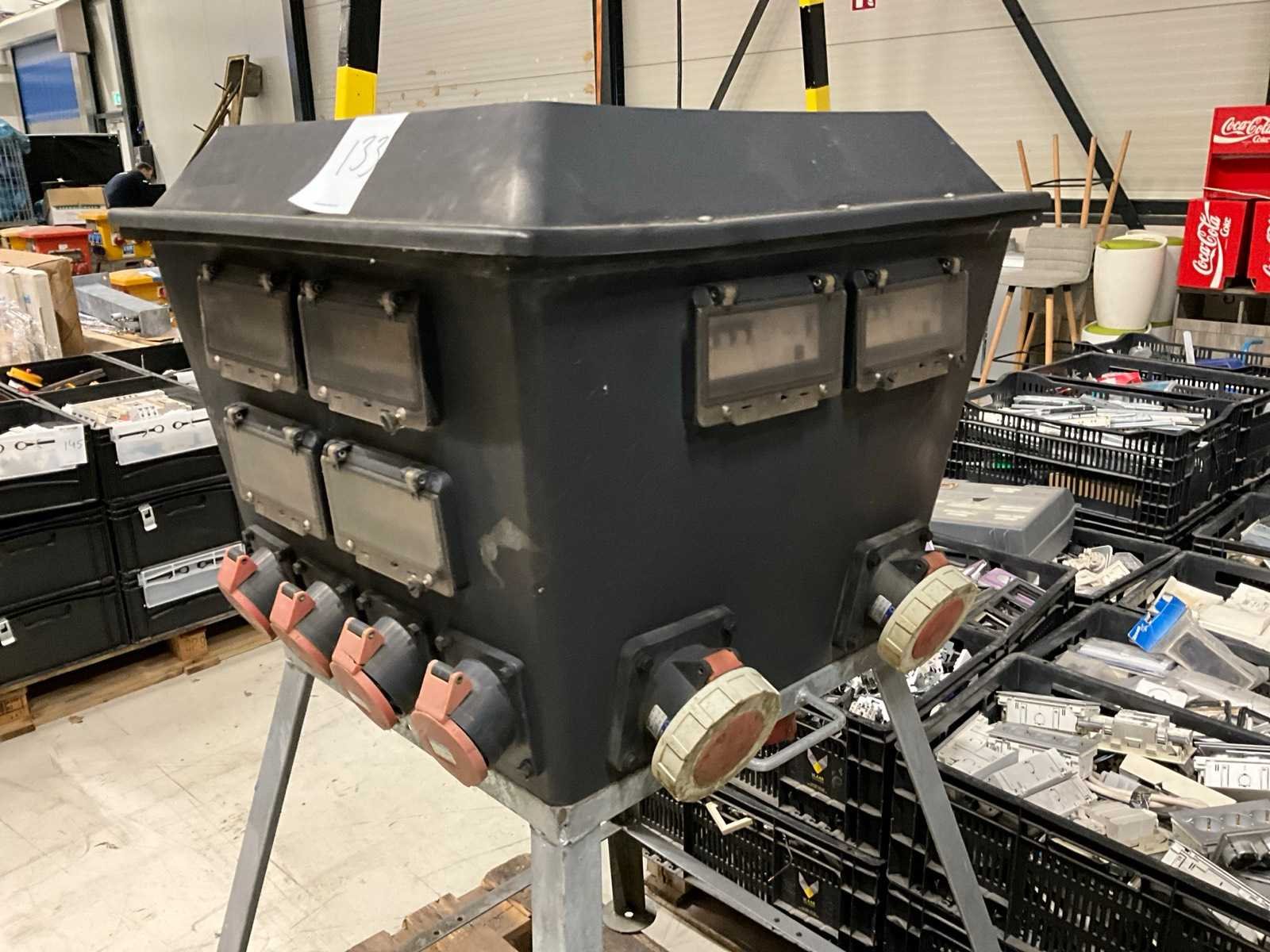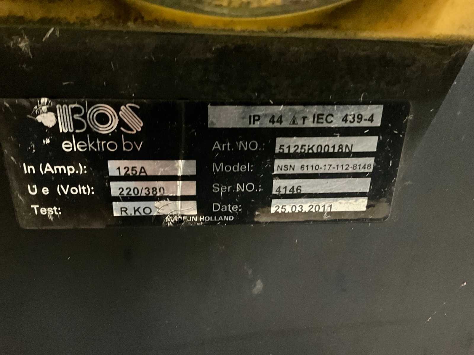 Merk: Bos Bouwjaar: 2011 Serienummer: 4146 Aantal uitgangen 230v: 4 Aantal uitgangen 380 v / 16 a: 2 Aantal uitgangen 380 v / 32 a: 4 Totale afmeting L: 640mm Totale afmeting Breedte: 640mm Totale afmeting Hoogte: 1380mm