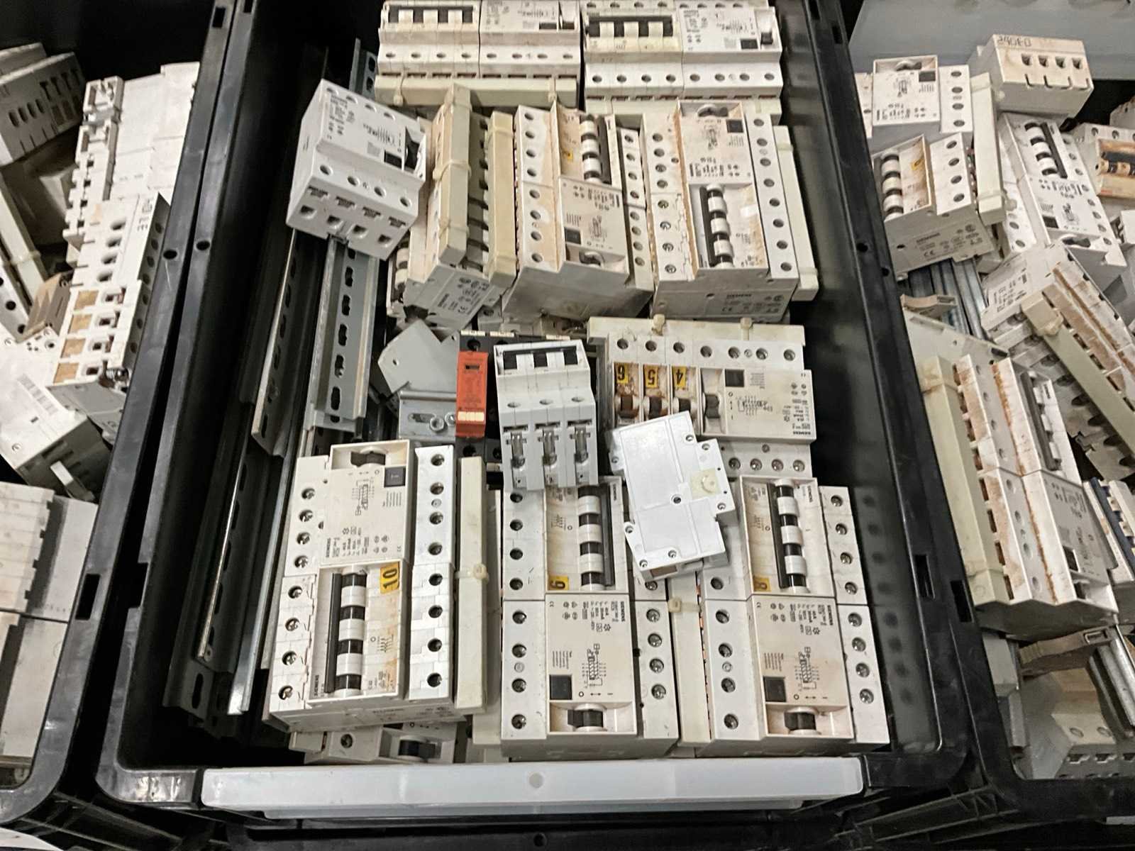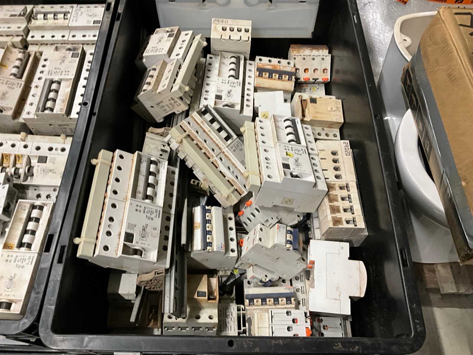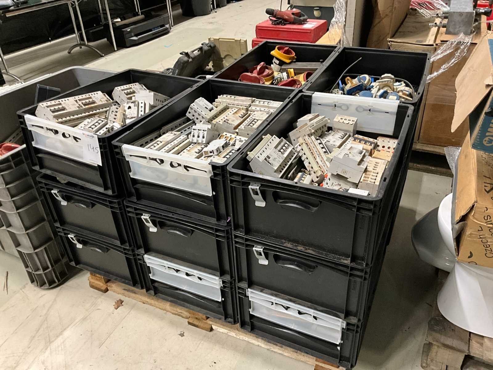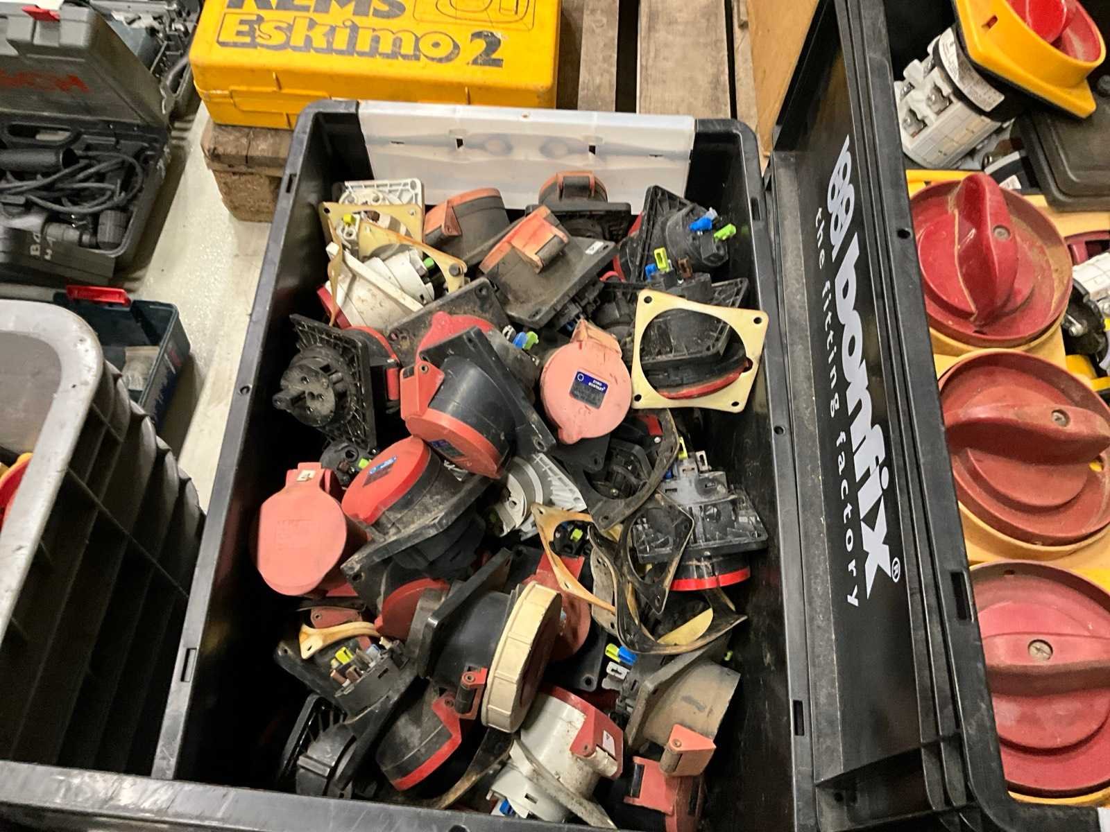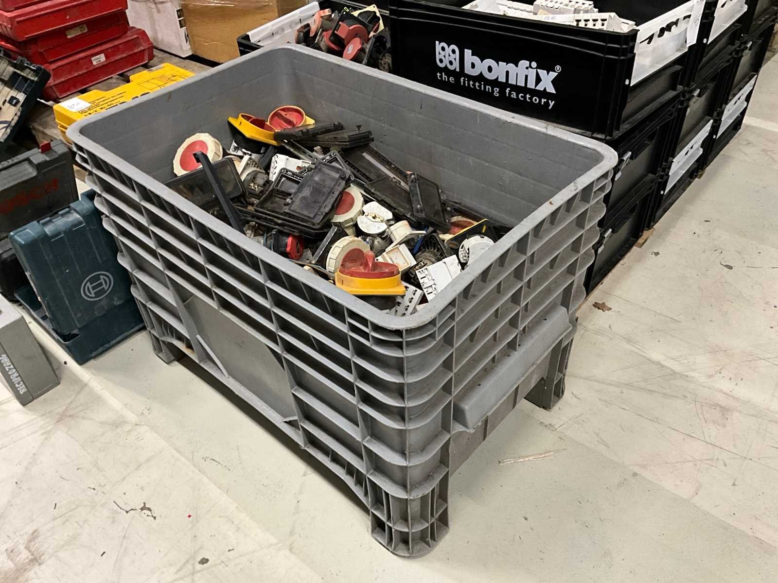 Diverse stekkers, automaten en schakelaars. In 17 stapelkratten en 1x plastic krat