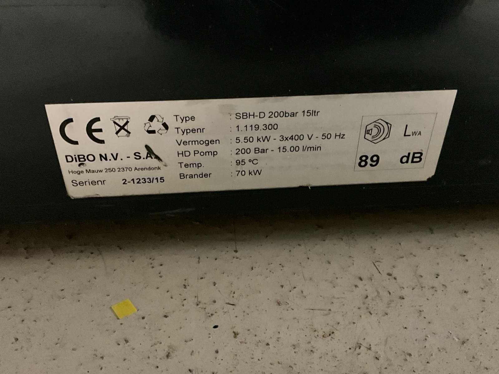 Merk: Dibo Type: SBH-D Maximale werkdruk: 200bar Temperatuurbereik max.: 95°c Capaciteit.: 900l/hr Dieselgestookt: true Vermogen: 5.5kW Aansluiting: 400V Totale afmeting L: 950mm Totale afmeting Breedte: 820mm Totale afmeting Hoogte: 1220mm