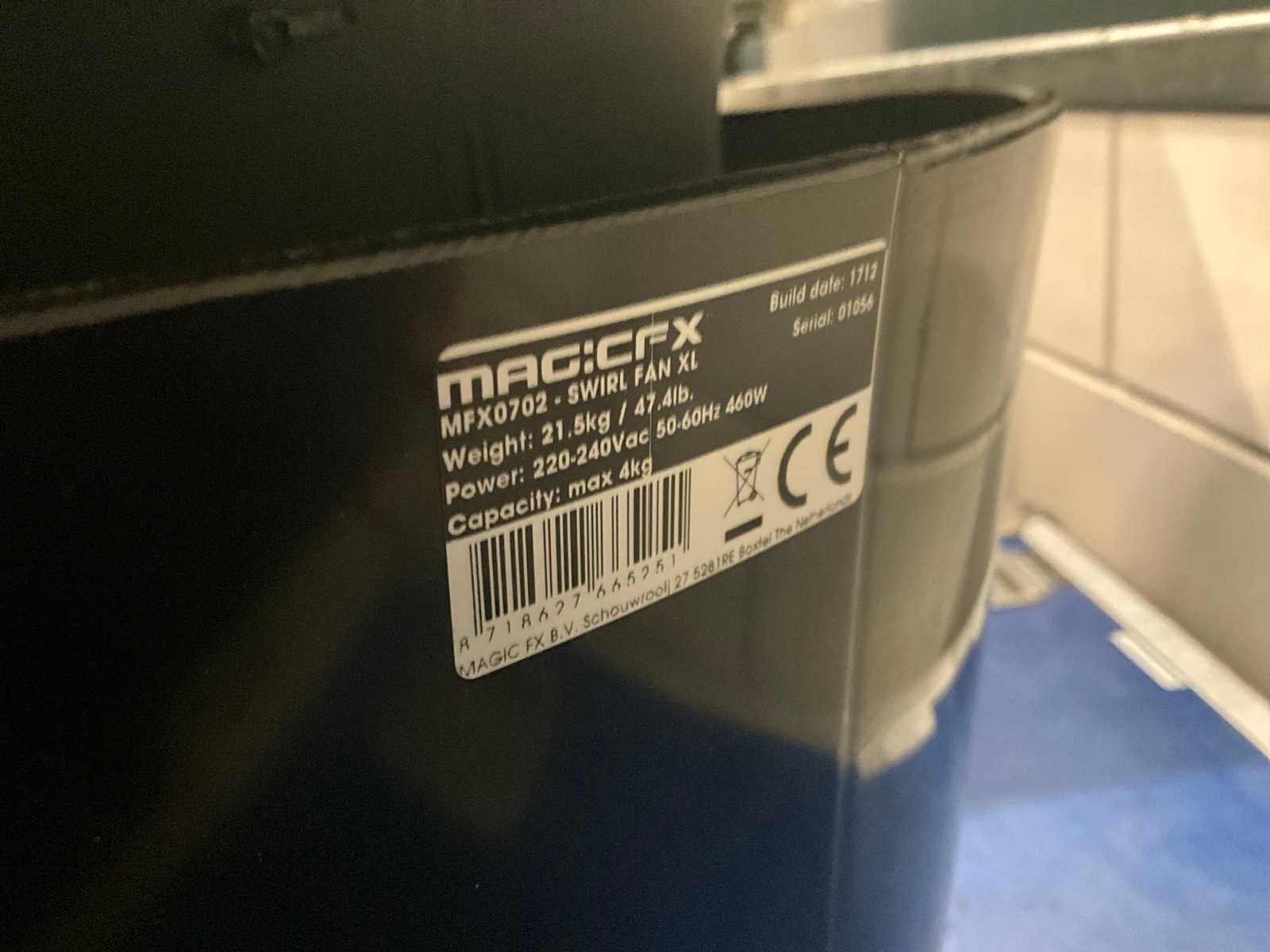 Maximale capaciteit: 4kg Merk: MagicFX Type: MFX0702 Swirl Fan XL Bouwjaar: 2017 Aansluiting: 230V Totale afmeting L: 630mm Totale afmeting Breedte: 630mm Totale afmeting Hoogte: 450mm Eigen gewicht: 21.5kg