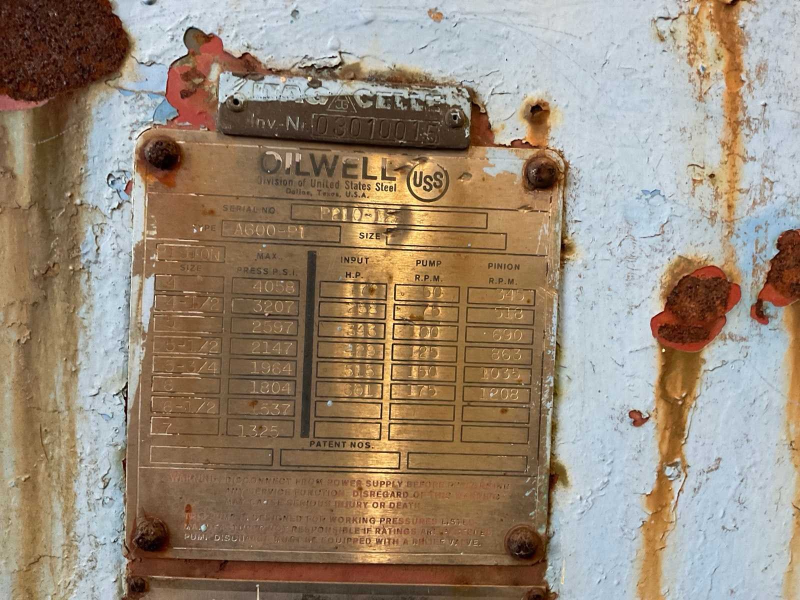 Merk: Oilwell Type: A600-PT Aantal cilinders: 3 Totale afmeting L: 3500mm Totale afmeting Breedte: 2200mm Totale afmeting Hoogte: 1800mm