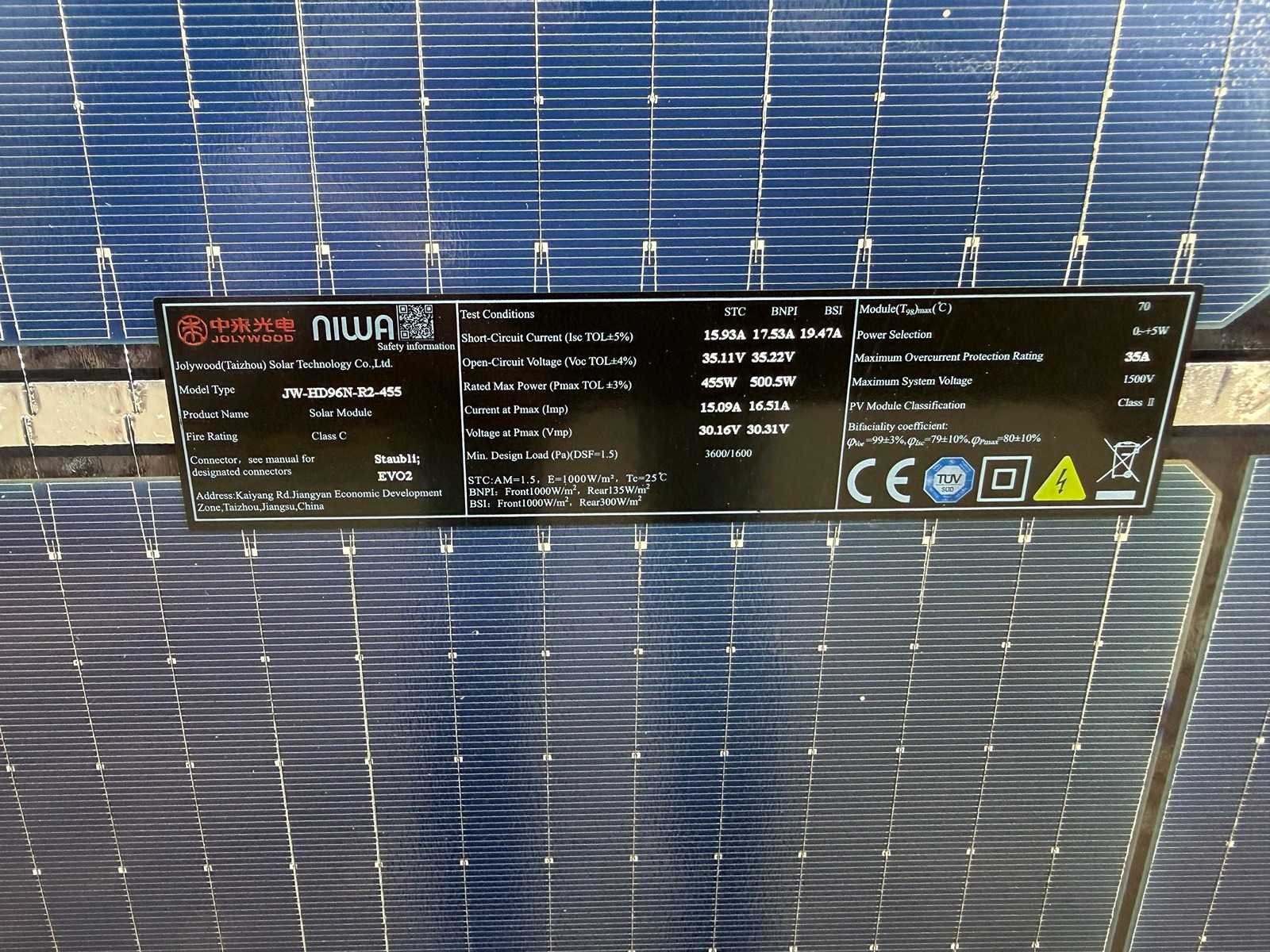 60x Jolywood 455W Bifacial Glas-Glas Full Black omvormer: Solax X3-PRO-25K-G2 (3-fase) Merk: Jolywood Type: JW-HD96N-R2-455 Max. dc power: 455W Eigen gewicht: 24,6kg Totale afmeting L: 1752mm Totale afmeting Breedte: 1134mm Totale afmeting Hoogte: 30mm