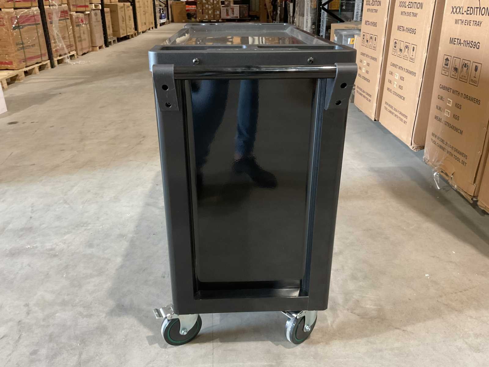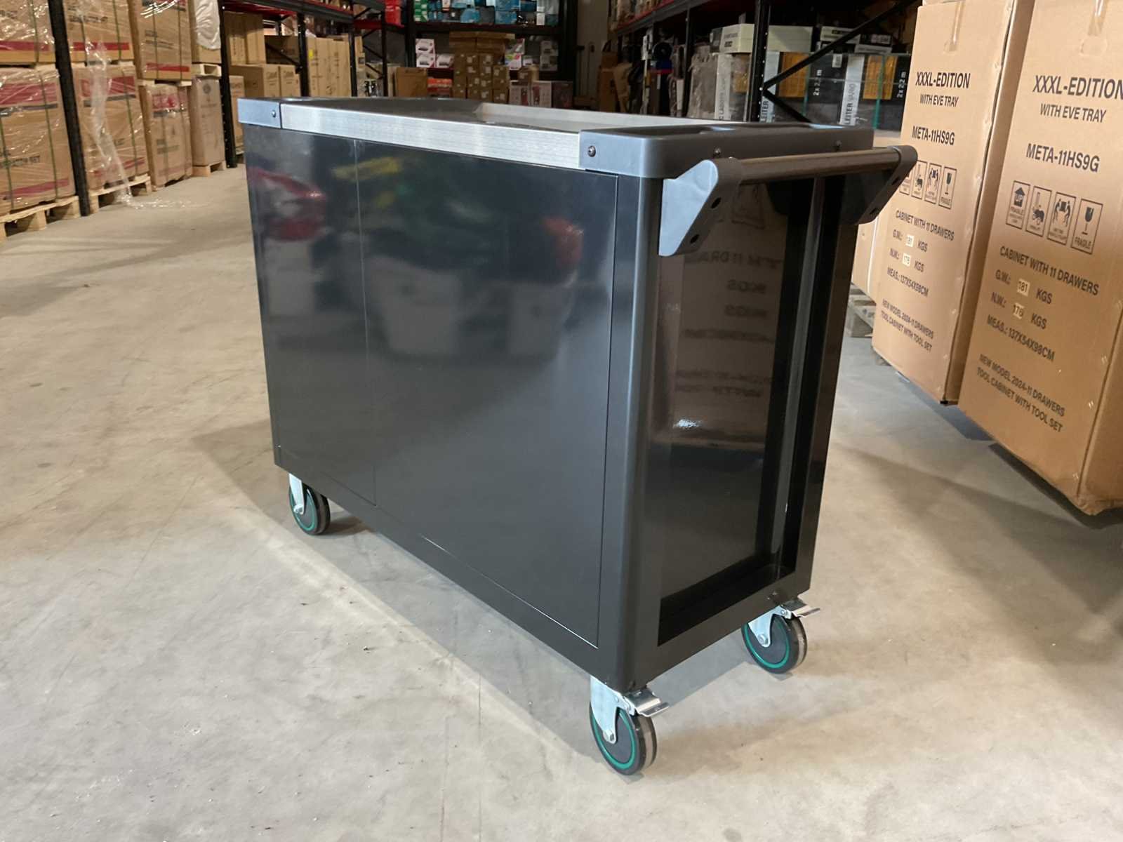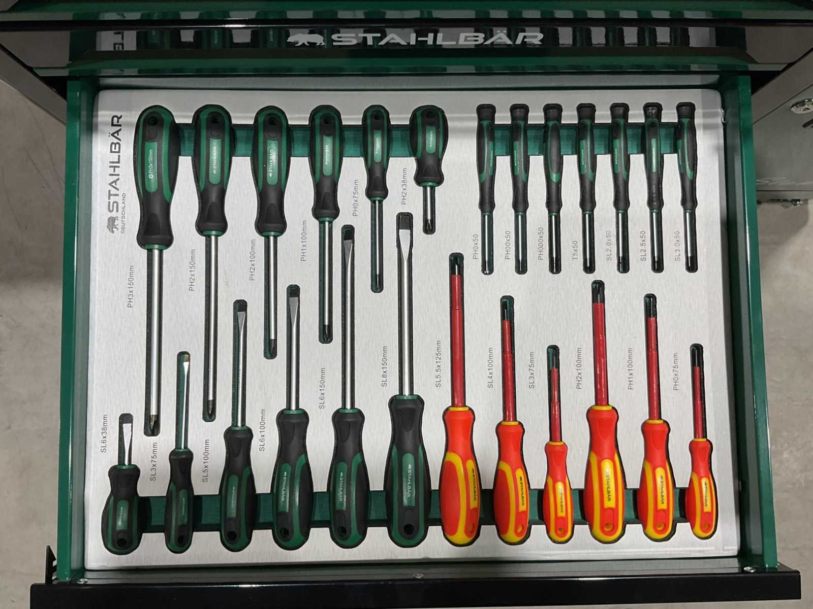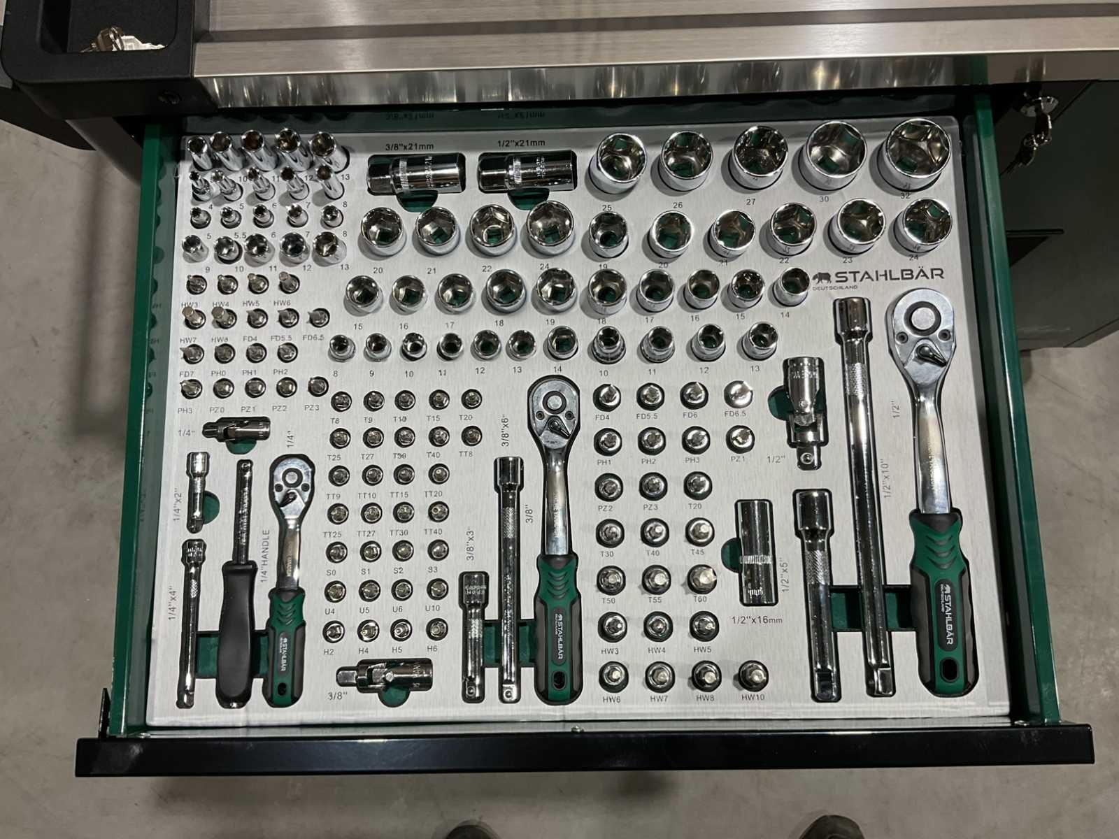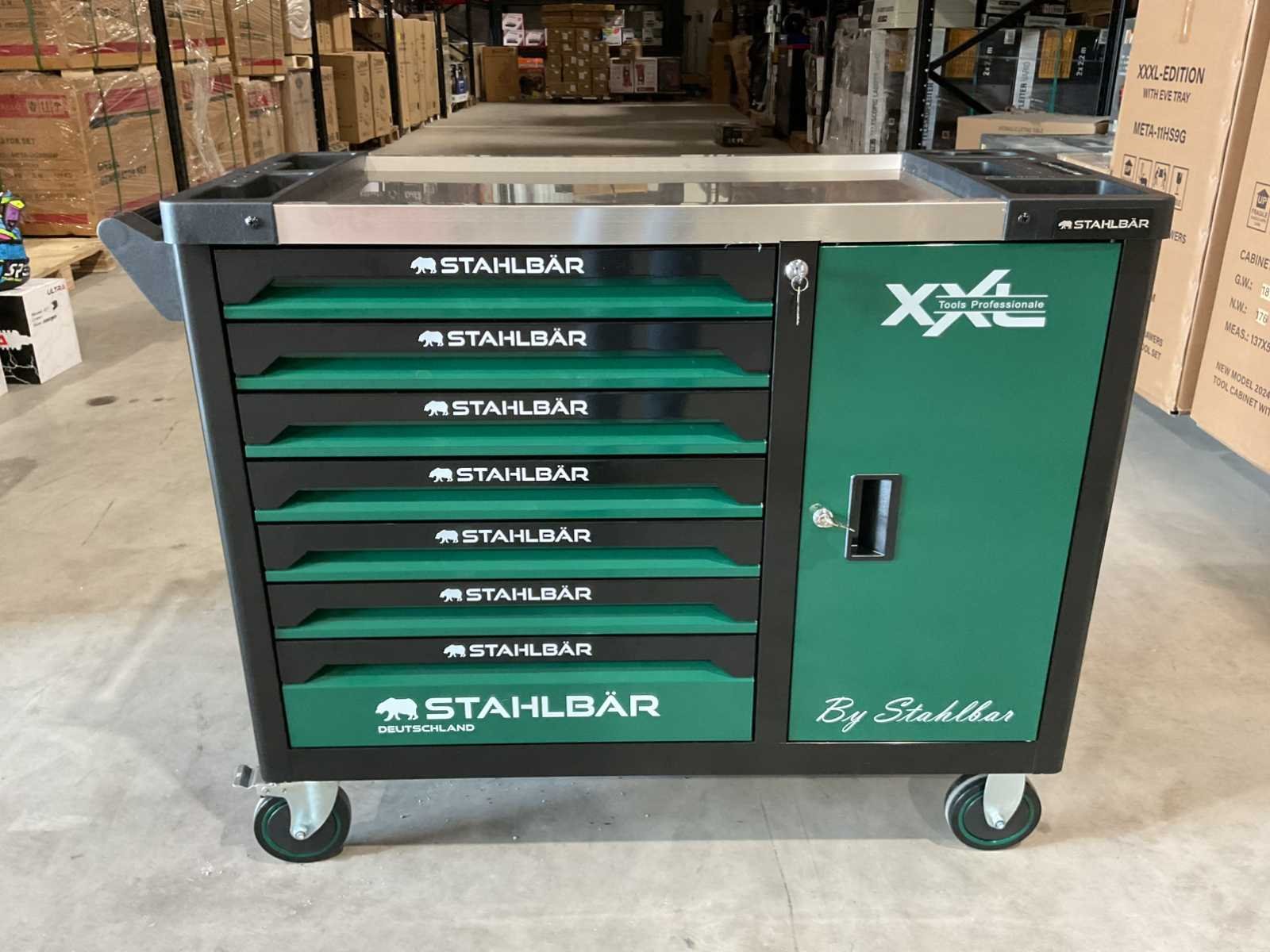 Voorzien van 7 lades waarvan 7 gevuld met gereedschap; zijdeur; professioneel chroom-vanadium gereedschap; heavy duty gereedschapswagen; 4 wielen; stevig handvat; ongebruikt in doos (transport afmetingen 110x50x80 cm) Merk: Stahlbär Type: Deutschland jumbo Bouwjaar: 2025 Aantal laden: 7 Met inhoud: true Eigen gewicht: 75kg Totale afmeting L: 1100mm Totale afmeting Breedte: 500mm Totale afmeting Hoogte: 800mm