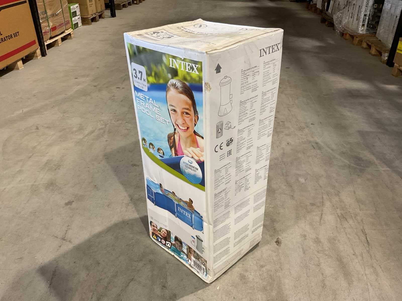 Voorzien van Opzetzwembad; 3-laags PVC met gerasterde polyester tussenlaag; Frame gepoedercoat staal; Vorm: Rond; Inhoud 6503 liter; Pompaansluiting (mm) 32; Diameter (cm) 366; Hoogte (cm) 76; Dikte liner wand (mm) 0,50; Dikte liner bodem (mm) 0,265; Reparatieset; Ongebruikt in doos Merk: INTEX Model: 28212GN Product type: 3,7m Kleur: Blauw Gewicht: 21.9kg Lengte: 31.8cm Breedte: 29.8cm Hoogte: 87.6cm Materiaal: Dubbelwandig PVC folie met gerasterde binnenlaag