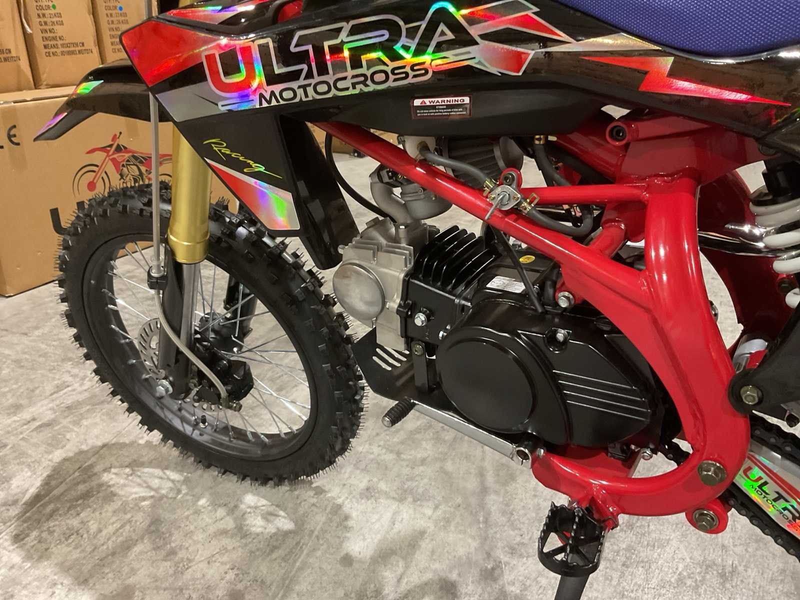 Voorzien van motor: 125 cc, 4-takt, 11 pk; Brandstof: benzine (4-takt); Transmissie: schakel; Remmen: hydraulische schijfremmen; Bandenmaat: voor 17" / achter 14"; Transportafmetingen (in doos): 135 × 45 × 65 cm; Transport gewicht: 78kg; ongebruikt in doos Merk: Ultra Motocross Model: DB003 26DE Type: 125cc Rood Cilinderinhoud: 125cc