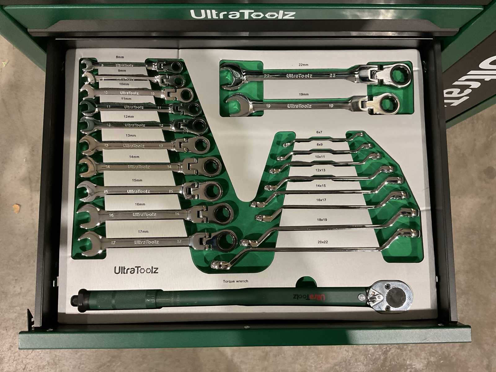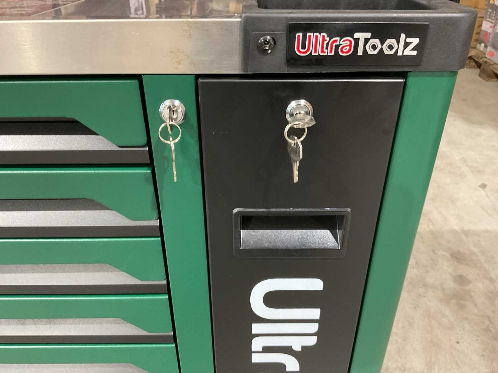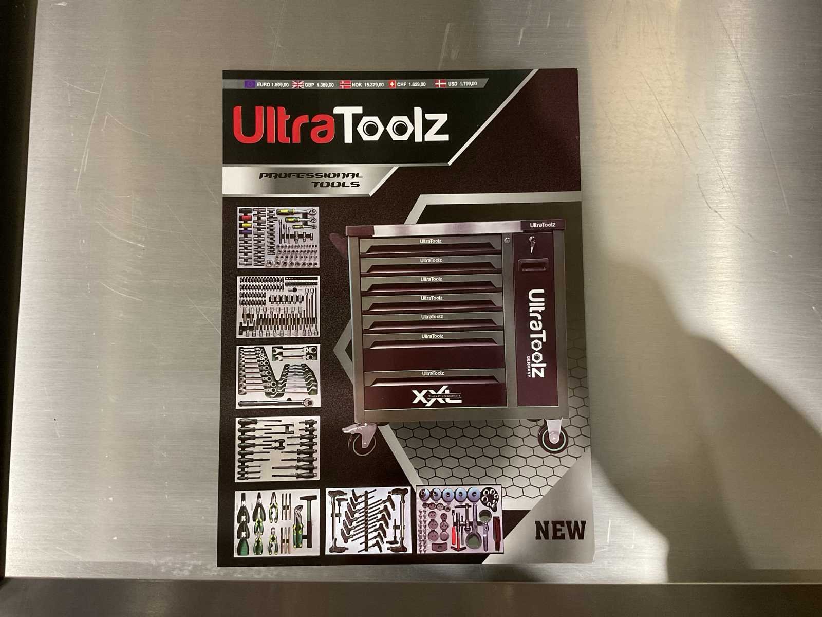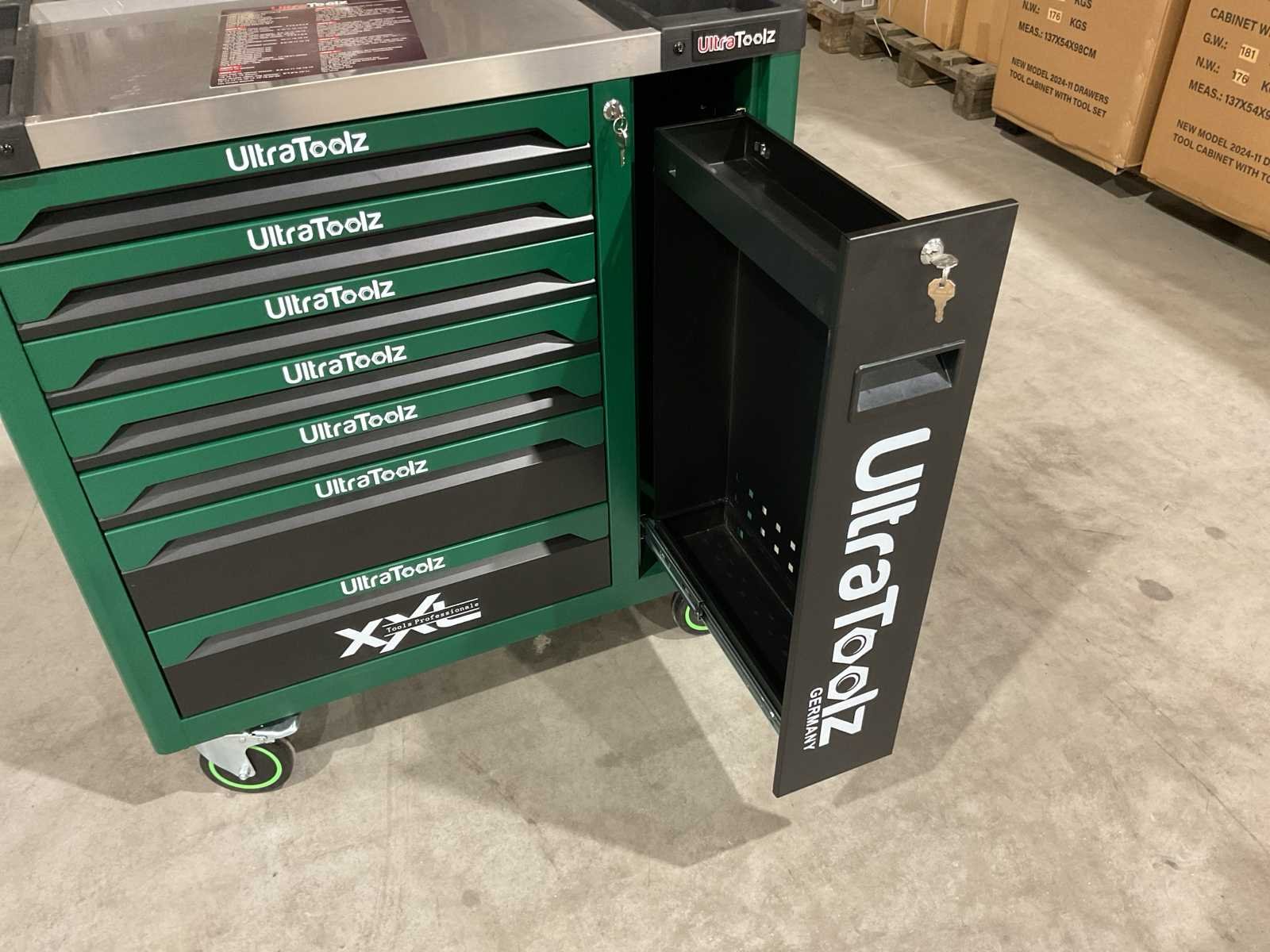 Voorzien van 7 lades waarvan 7 gevuld met gereedschap; zij lade; professioneel chroom-vanadium gereedschap; heavy duty gereedschapswagen; stevig werkblad; 4 wielen; stevig handvat; ongebruikt in doos (transport afmetingen 95x50x85 cm) Merk: UltraToolz Type: Germany 8/7 Bouwjaar: 2025 Aantal laden: 7 Met inhoud: true Eigen gewicht: 83kg Totale afmeting L: 950mm Totale afmeting Breedte: 500mm Totale afmeting Hoogte: 850mm