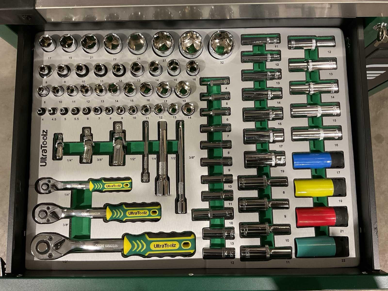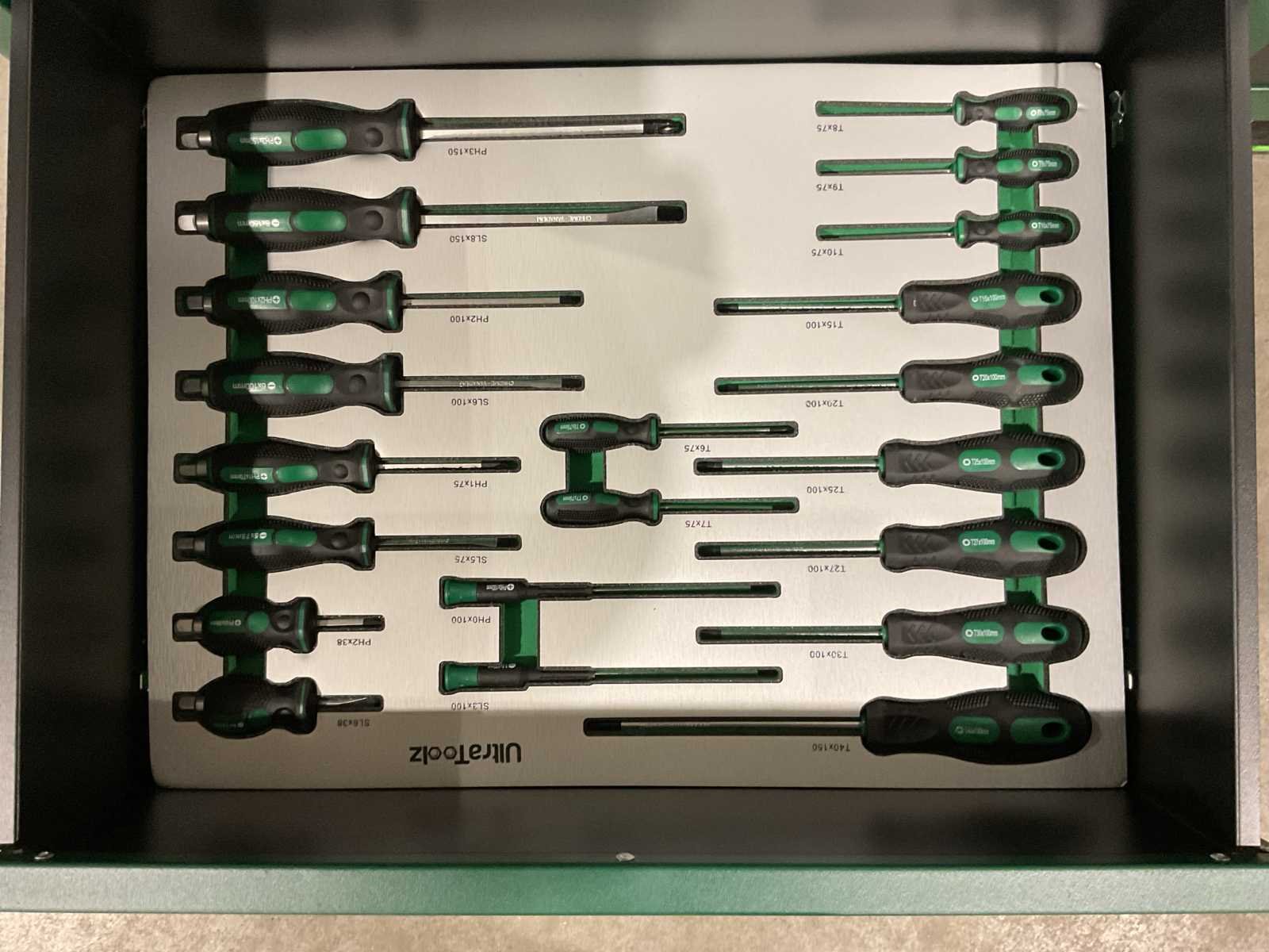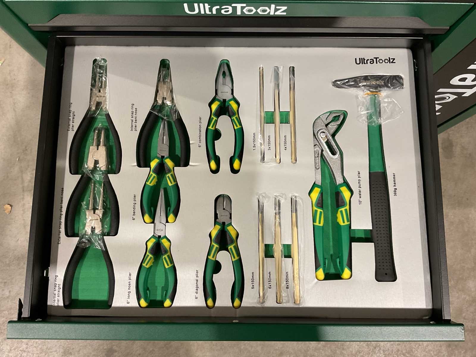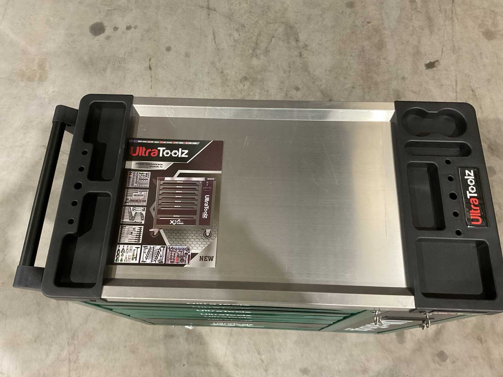 Voorzien van 7 lades waarvan 7 gevuld met gereedschap; zij lade; professioneel chroom-vanadium gereedschap; heavy duty gereedschapswagen; stevig werkblad; 4 wielen; stevig handvat; ongebruikt in doos (transport afmetingen 95x50x85 cm) Merk: UltraToolz Type: Germany 8/7 Bouwjaar: 2025 Aantal laden: 7 Met inhoud: true Eigen gewicht: 83kg Totale afmeting L: 950mm Totale afmeting Breedte: 500mm Totale afmeting Hoogte: 850mm