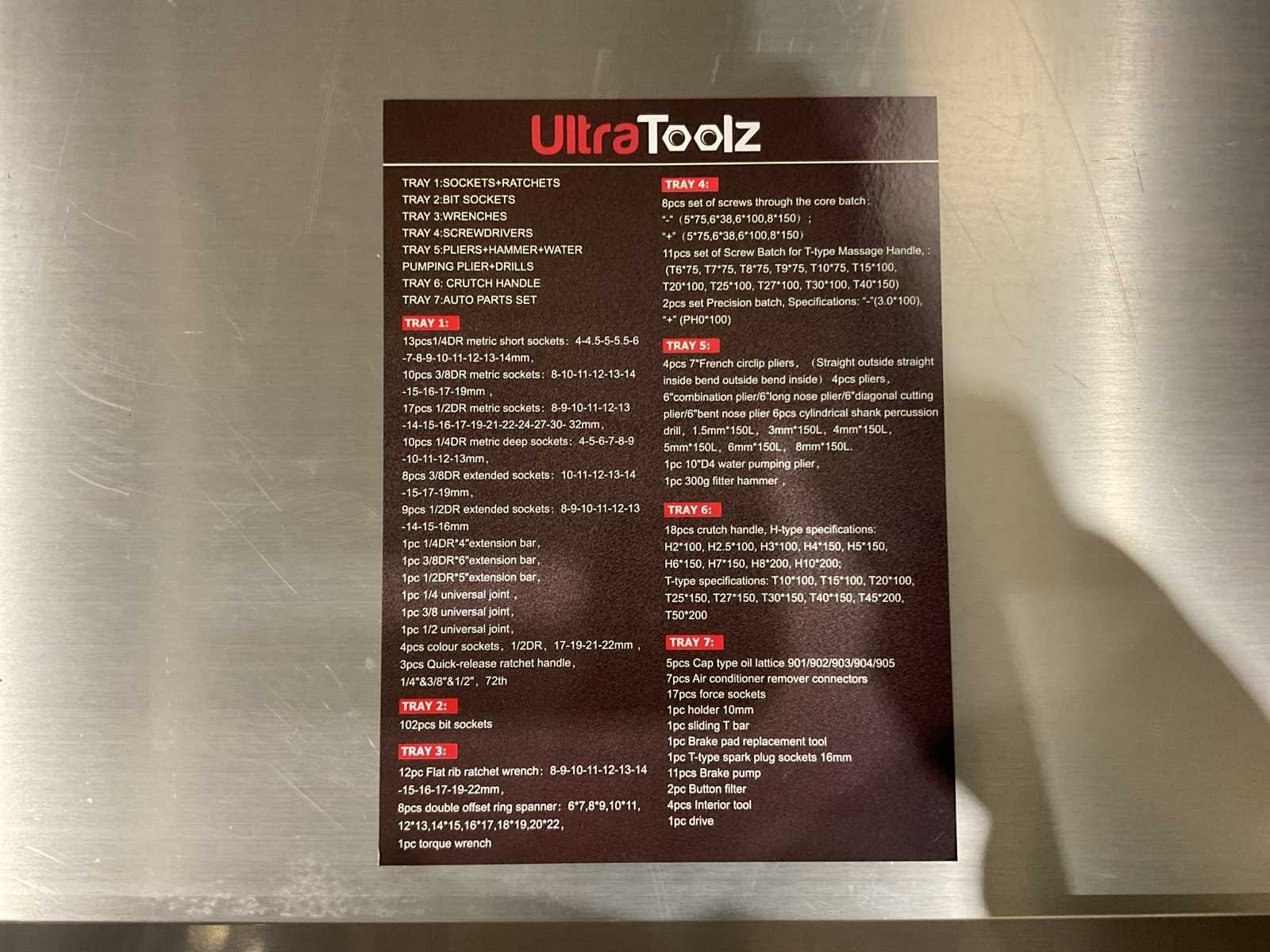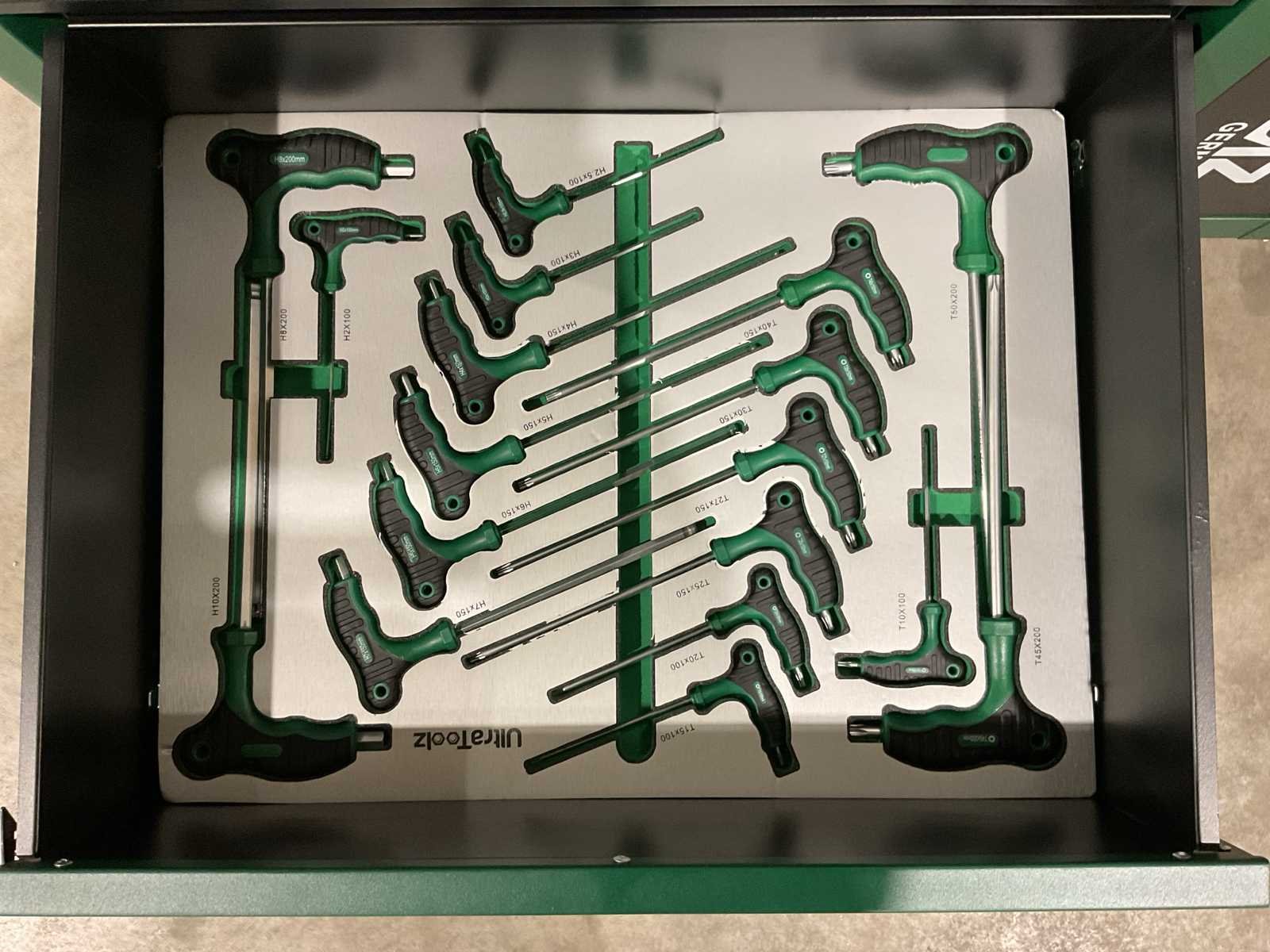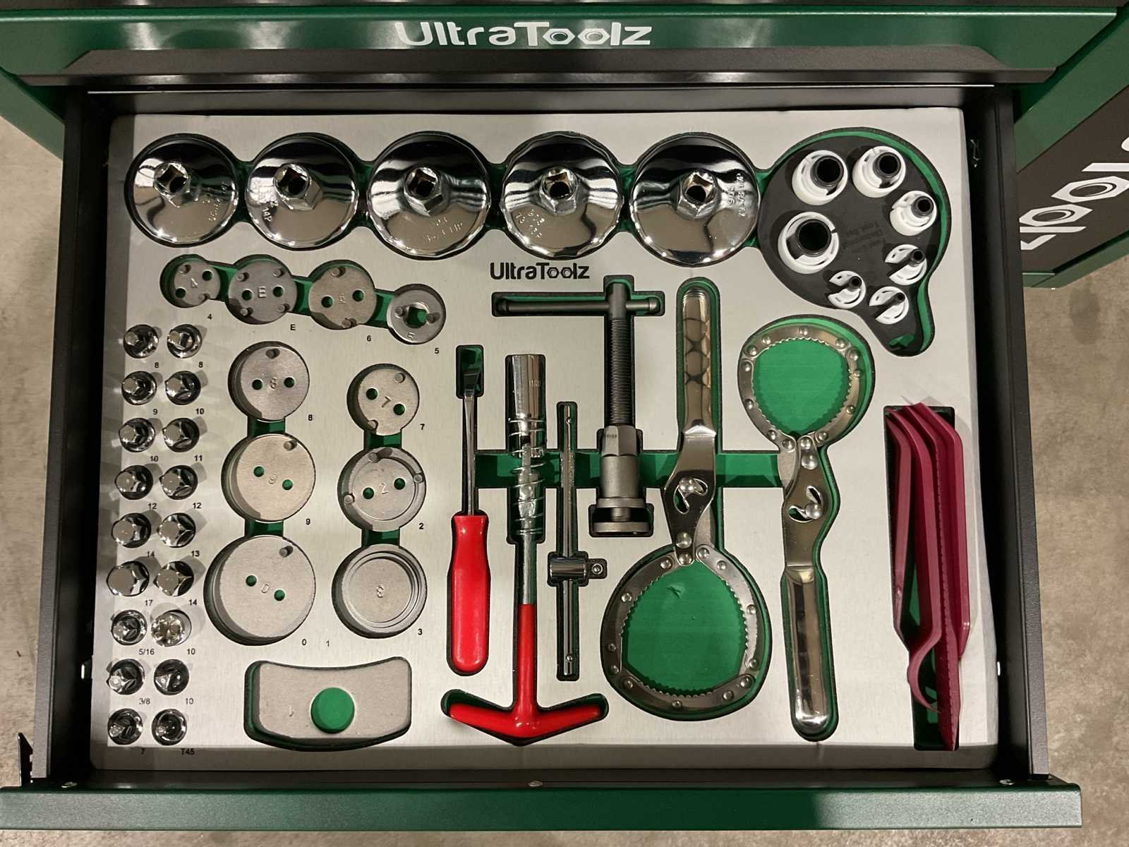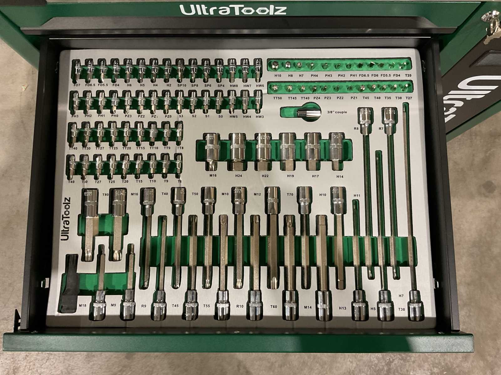 Voorzien van 7 lades waarvan 7 gevuld met gereedschap; zij lade; professioneel chroom-vanadium gereedschap; heavy duty gereedschapswagen; stevig werkblad; 4 wielen; stevig handvat; ongebruikt in doos (transport afmetingen 95x50x85 cm) Merk: UltraToolz Type: Germany 8/7 Bouwjaar: 2025 Aantal laden: 7 Met inhoud: true Eigen gewicht: 83kg Totale afmeting L: 950mm Totale afmeting Breedte: 500mm Totale afmeting Hoogte: 850mm