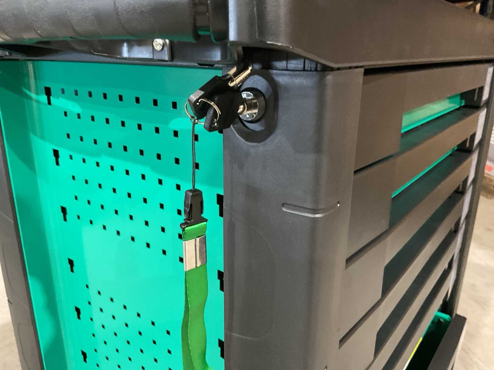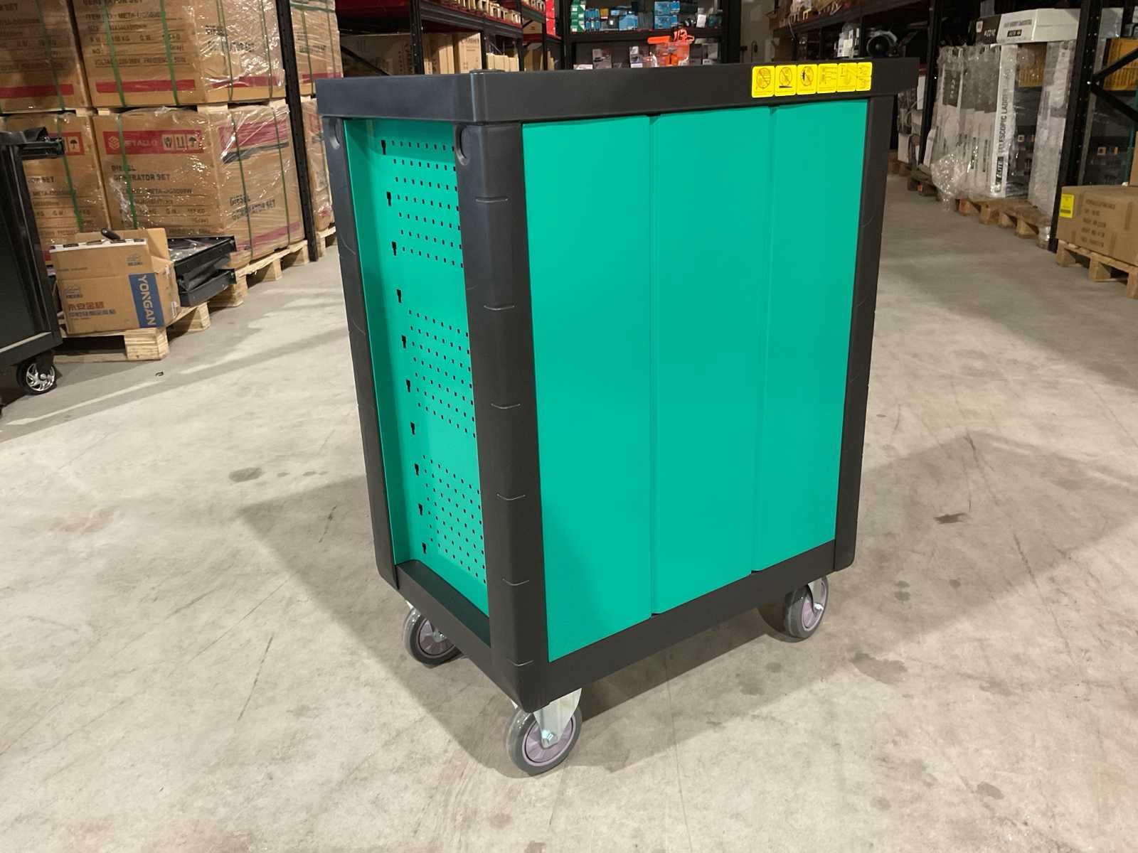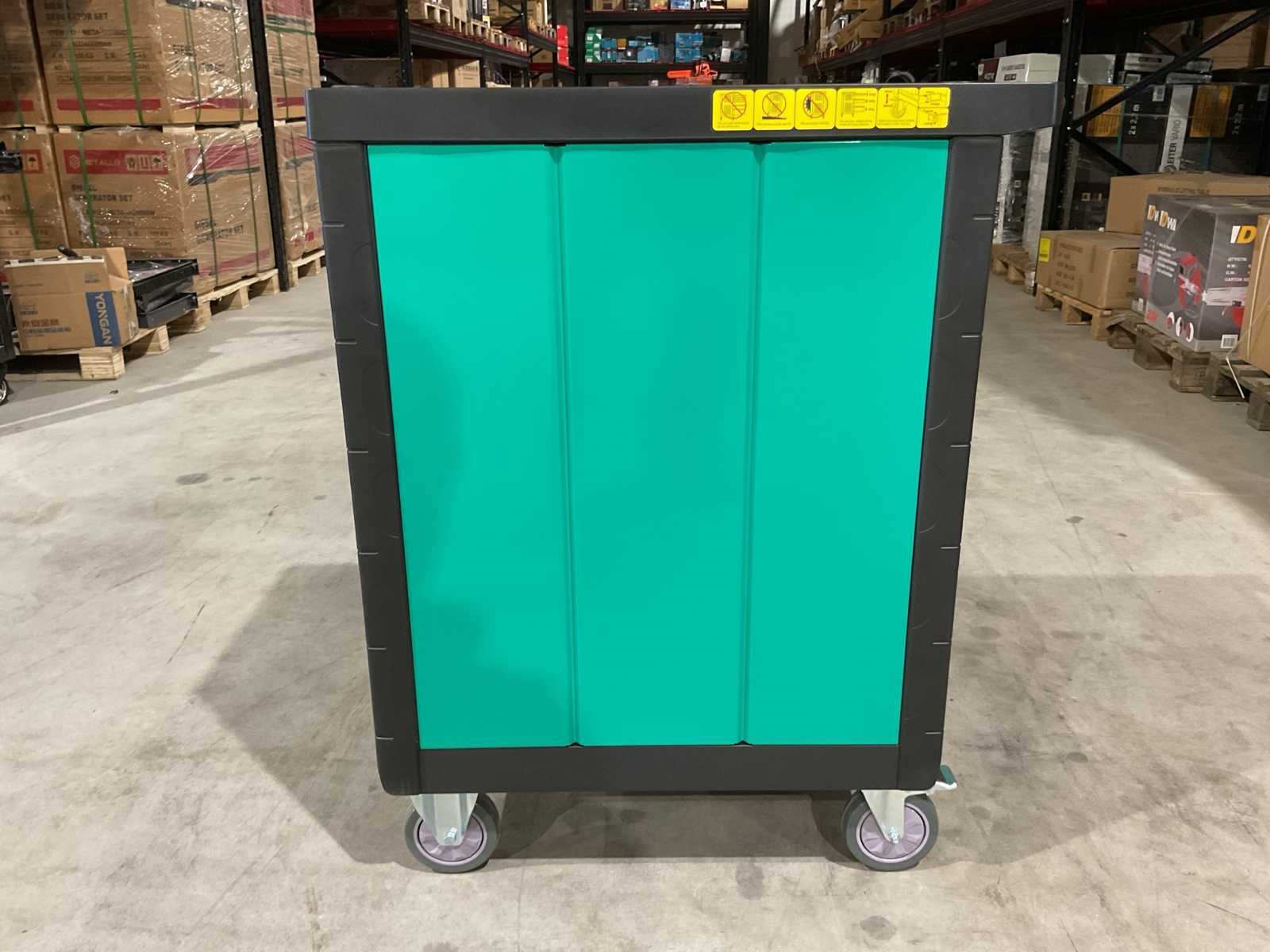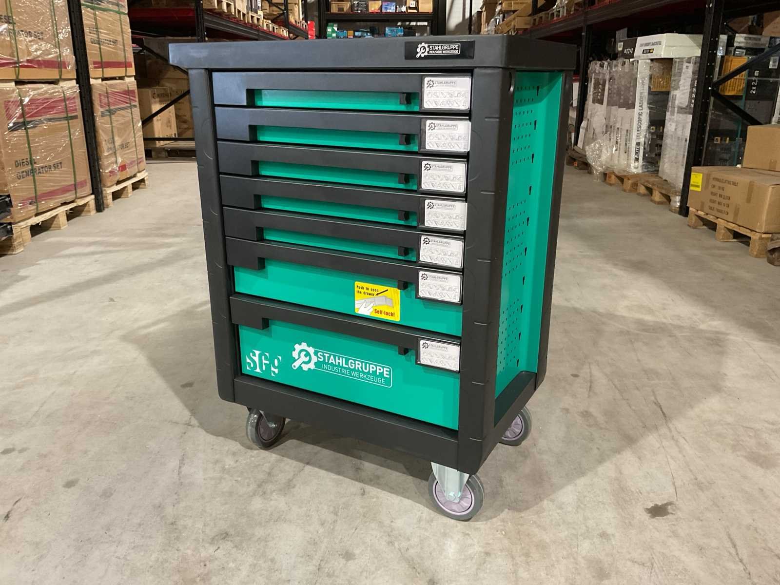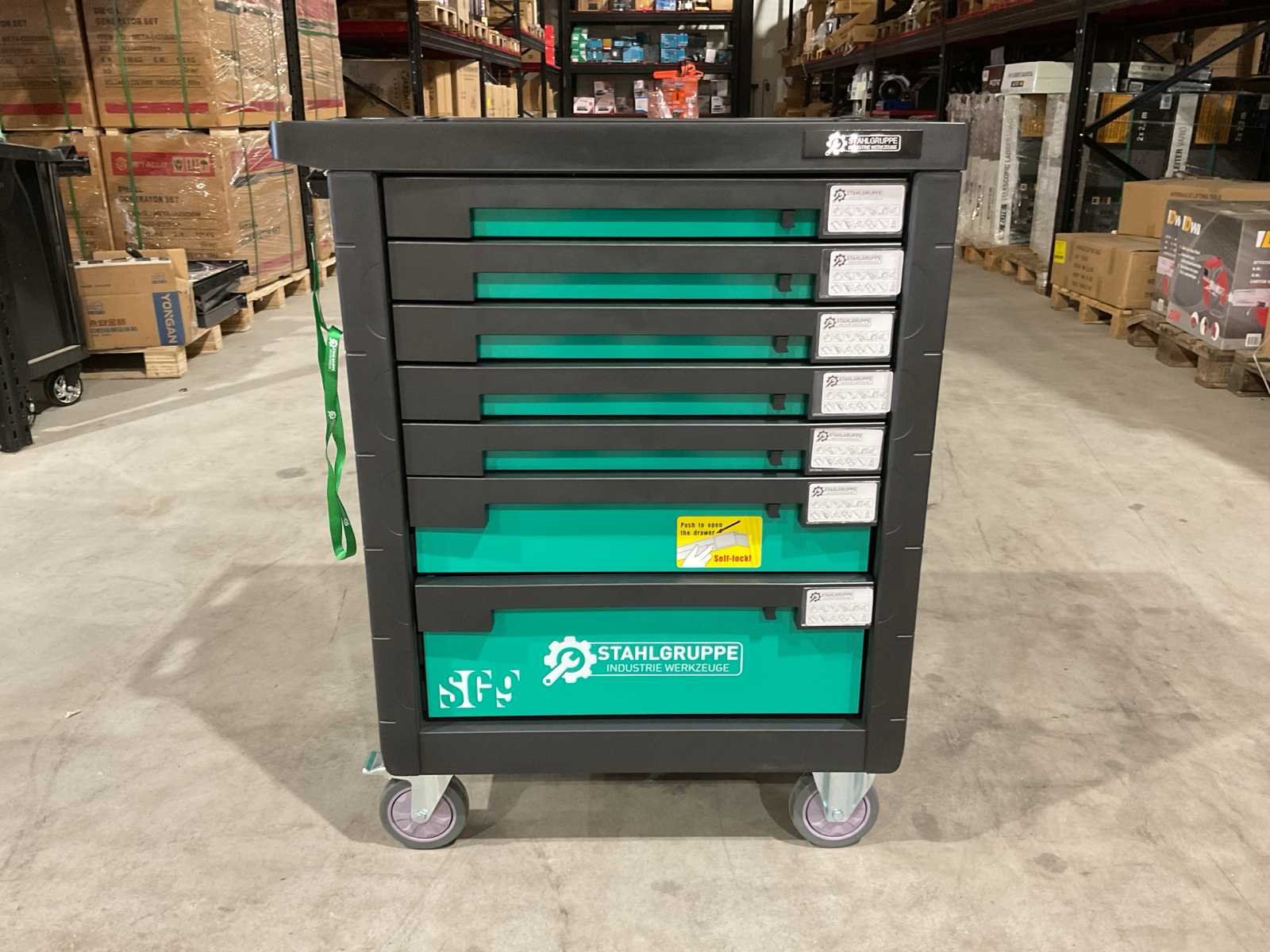 Voorzien van 7 lades waarvan 5 gevuld met gereedschap; professioneel chroom-vanadium gereedschap; heavy duty gereedschapswagen; stevig werkblad; 4 wielen; stevig handvat; ongebruikt in doos (transport afmetingen 80x50x105 cm) Merk: Stahlgruppe Type: SG9 Bouwjaar: 2025 Aantal laden: 7 Met inhoud: true Eigen gewicht: 78kg Totale afmeting L: 800mm Totale afmeting Breedte: 500mm Totale afmeting Hoogte: 1050mm