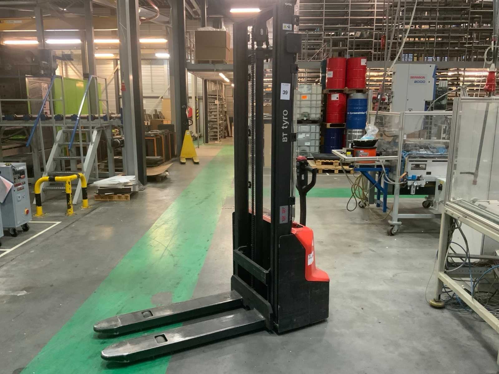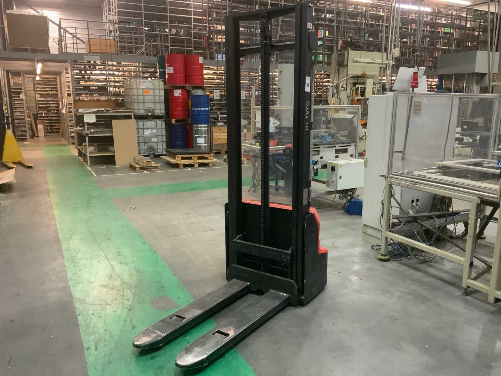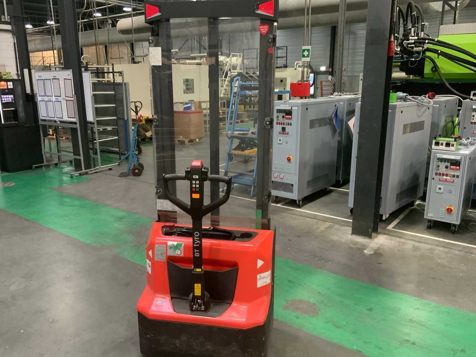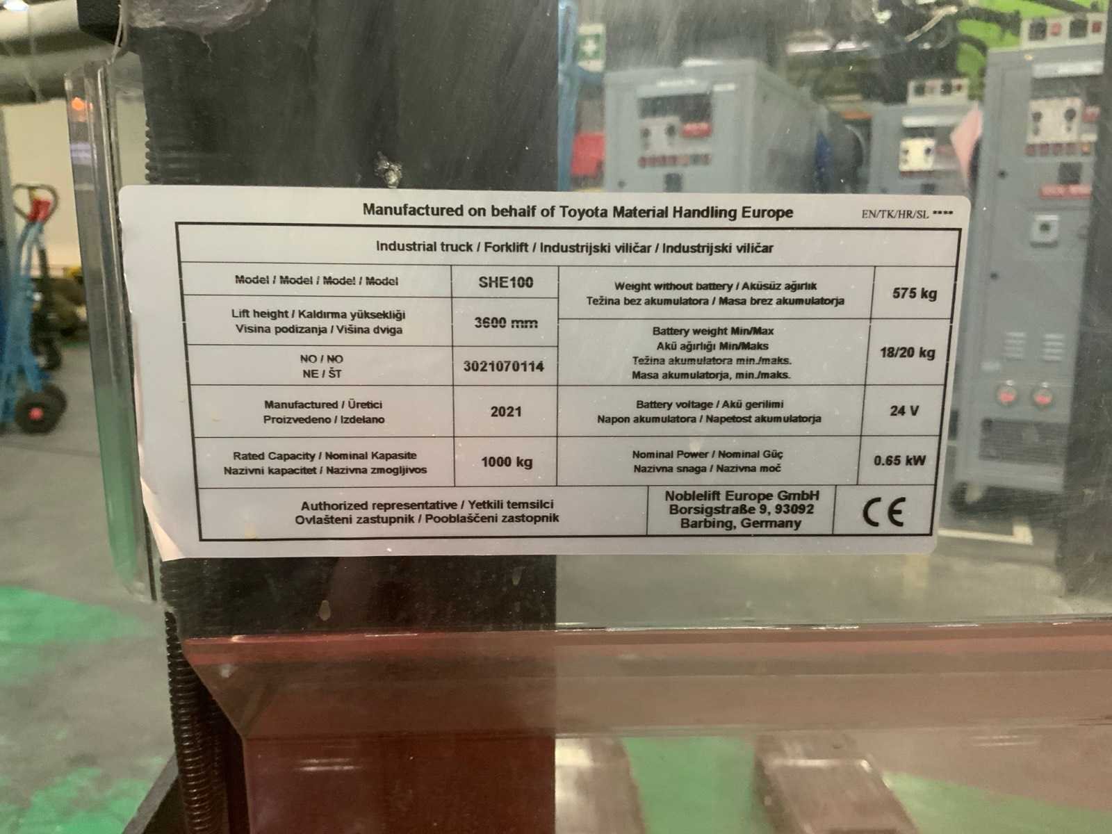 Merk: BT Tyro Type: SHE 100 Bouwjaar: 2021 Serienummer: 3021070114 Hefvermogen: 1000kg Hefhoogte: 3600mm Lepellengte: 1150mm Minimale doorrijhoogte: 2300mm Totale afmeting Breedte: 800mm Accu lader: true