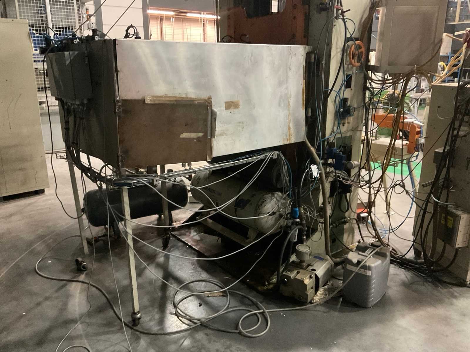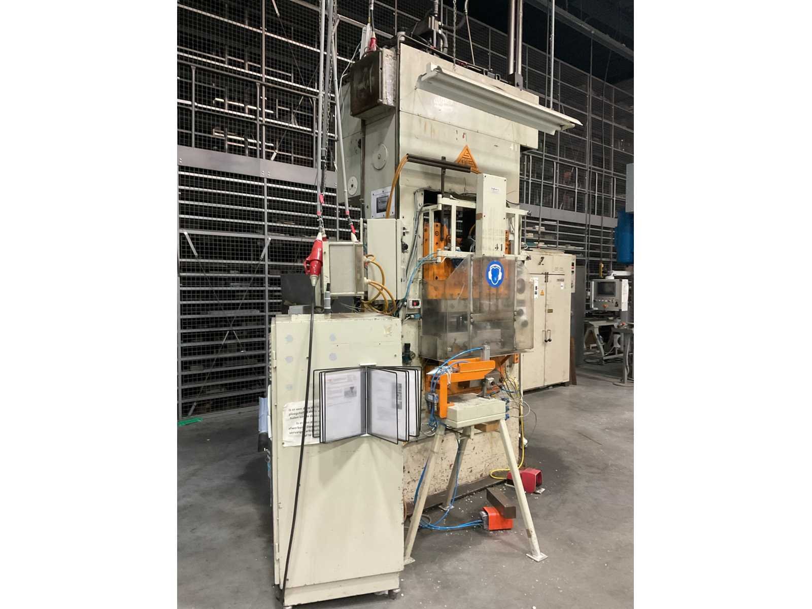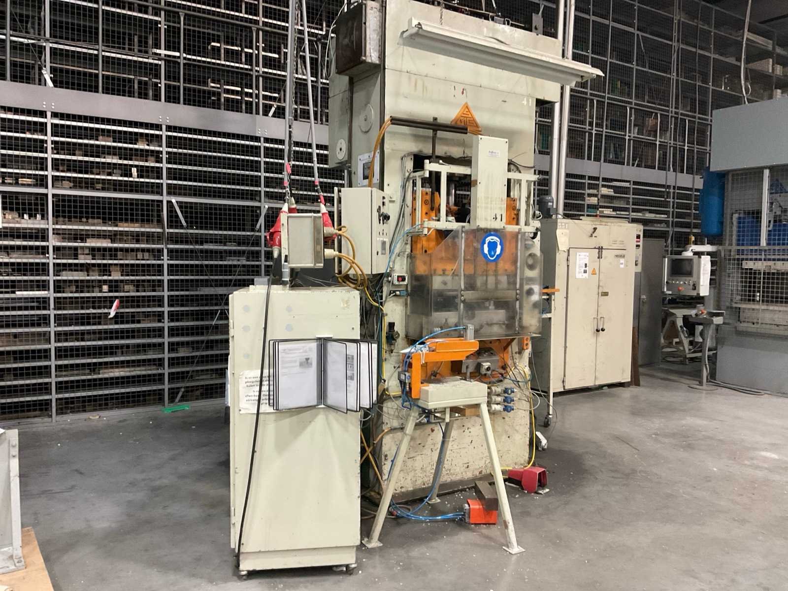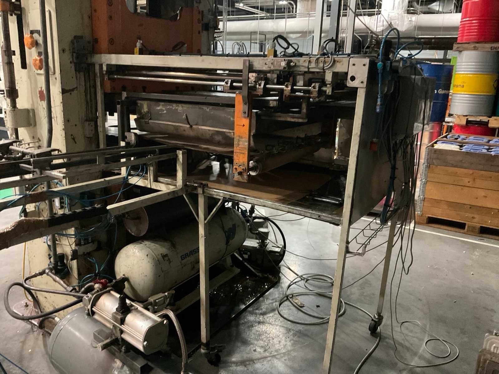 Voorzien van pers beveiliging, verrijdbaar frame, invoer inrichting, zij invoerinrichting, infrarood verwarmingsunit, temperatuur regelkast, pneumatische inrichting Alsmede pneumatische stanspers Merk: SMG Type: HZ PR60 II M Bouwjaar: 1954 Serienummer: 670/299 Capaciteit.: 60t Aansluiting: 400V Afmeting l: 4200mm Afmeting b: 3900mm Afmeting h: 3300mm