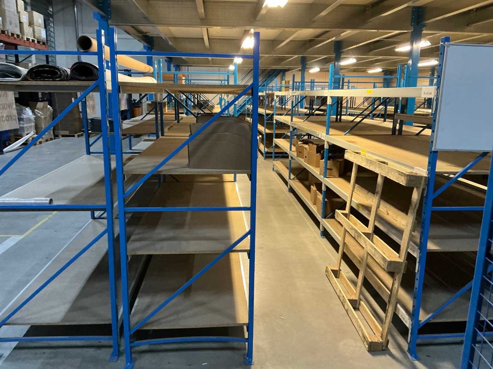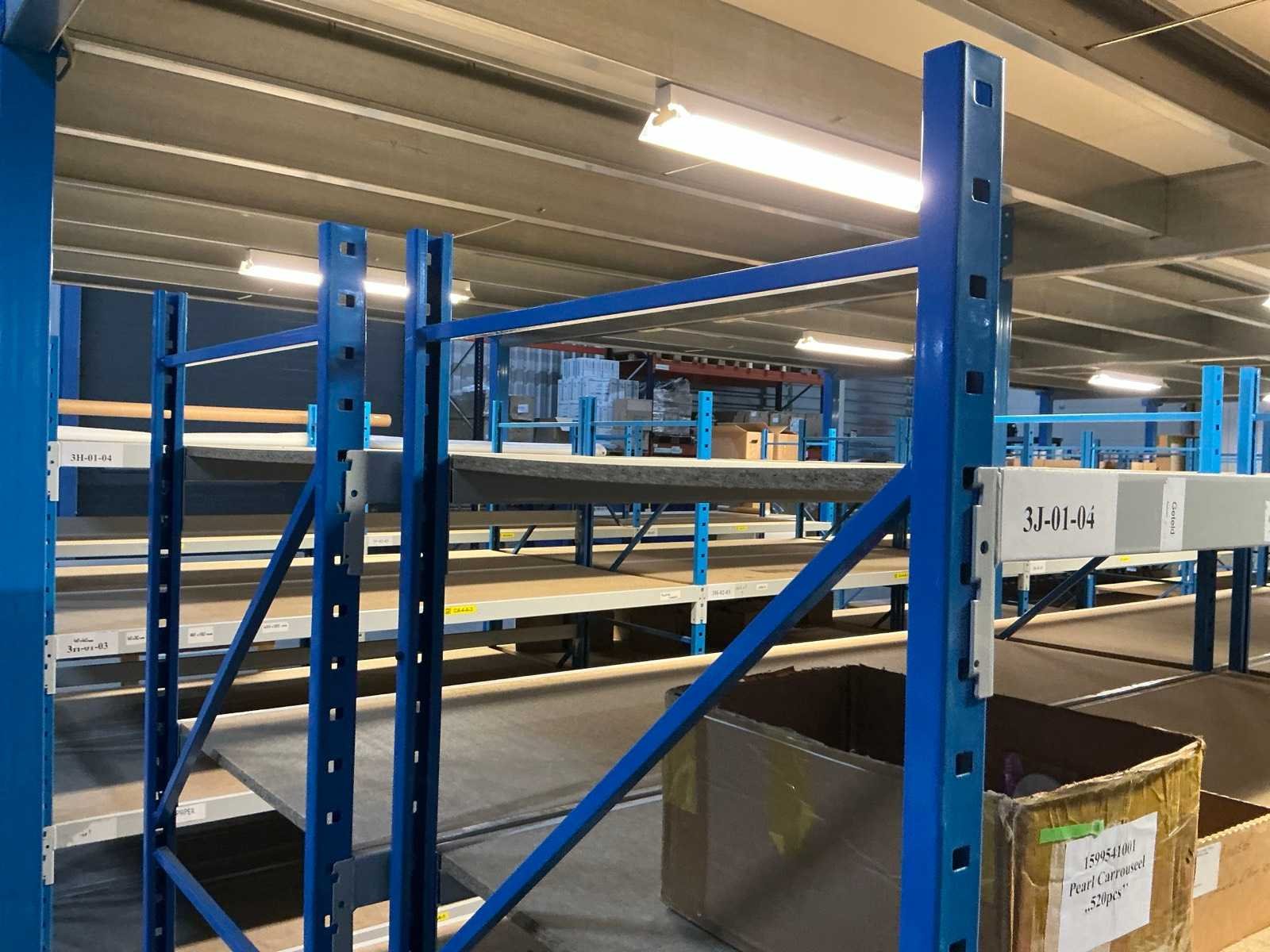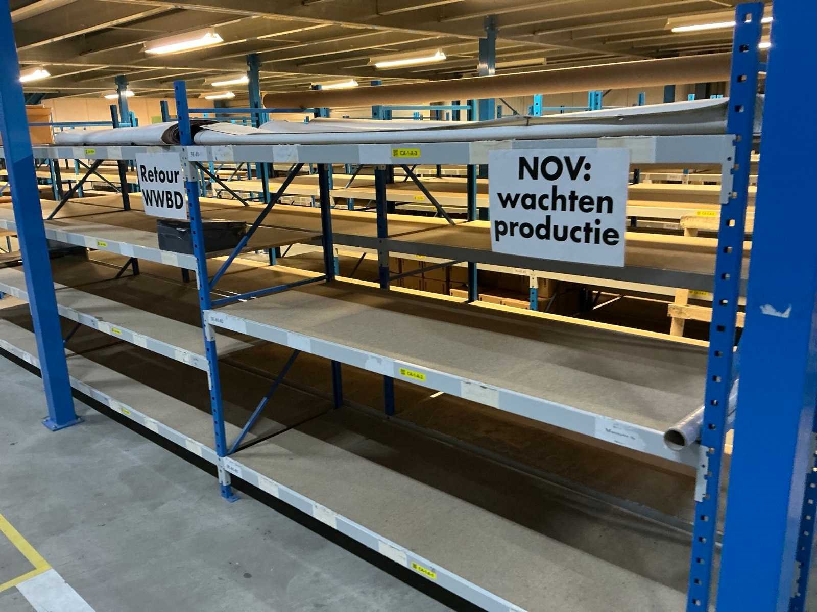 Breedtes variërend tussen de 200 en 225cm; Staat onder de entresolvloer. Geen lift/heftruck aanwezig. Aantal secties: 46 Sectie afm. b: 2250mm Sectie diepte: 800mm Sectie afm. h: 2000mm Aantal staanders: 59 Aantal liggers: 302 Demontabel: true Materiaal: Metaal