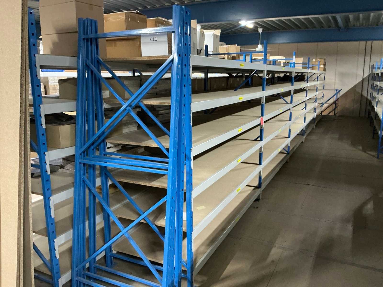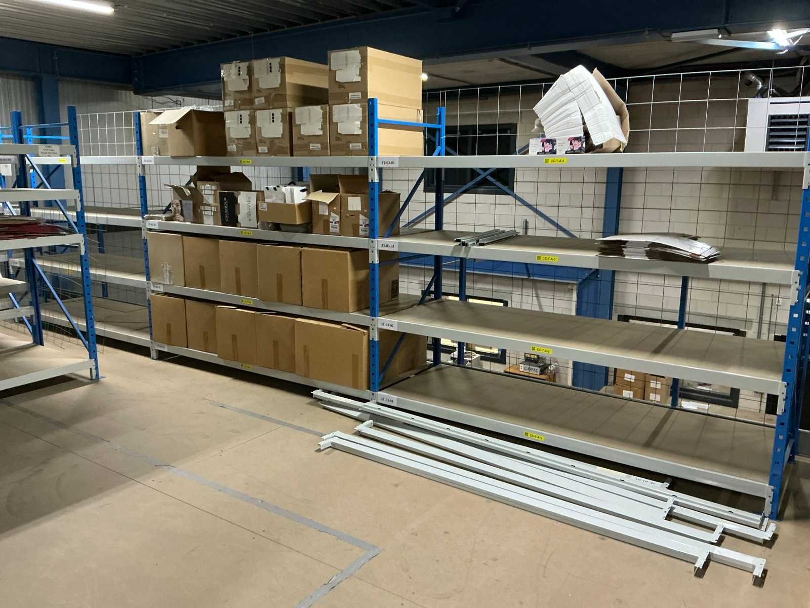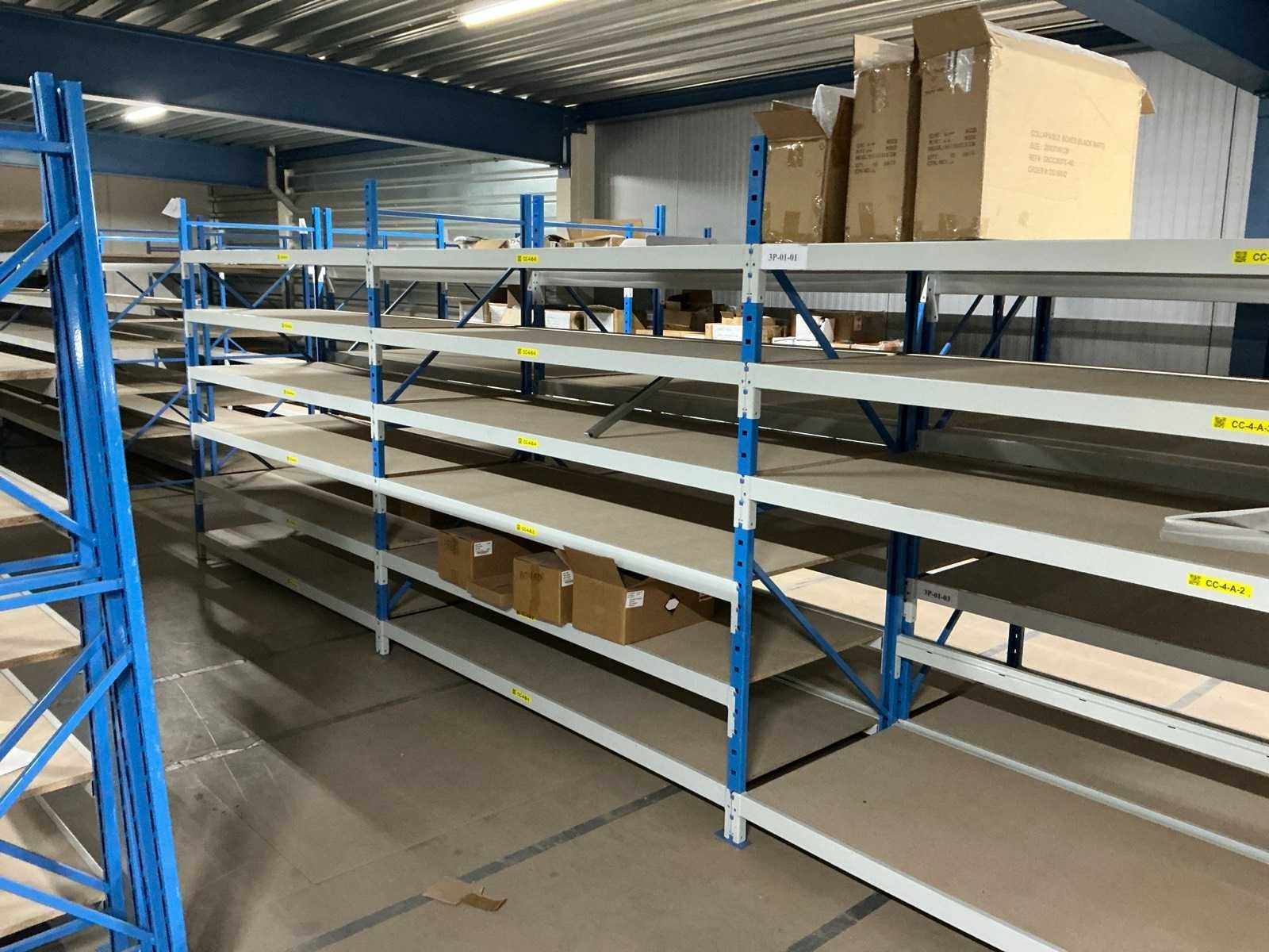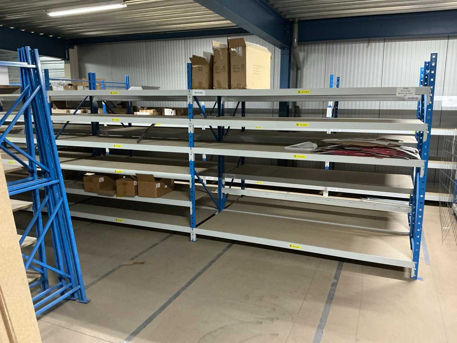 Breedte variërend tussen de 200 en 225cm; Staat op de verdieping van een entresolvloer. Geen lift/heftruck aanwezig. Aantal secties: 37 Sectie afm. b: 2250mm Sectie diepte: 800mm Sectie afm. h: 2000mm Aantal staanders: 42 Aantal liggers: 360 Demontabel: true Materiaal: Metaal