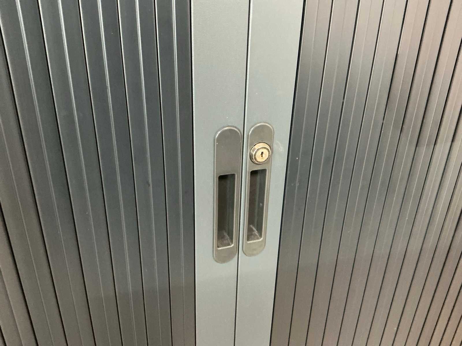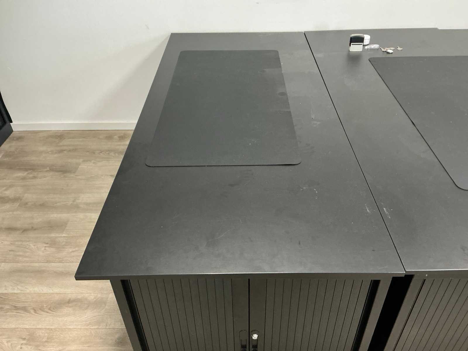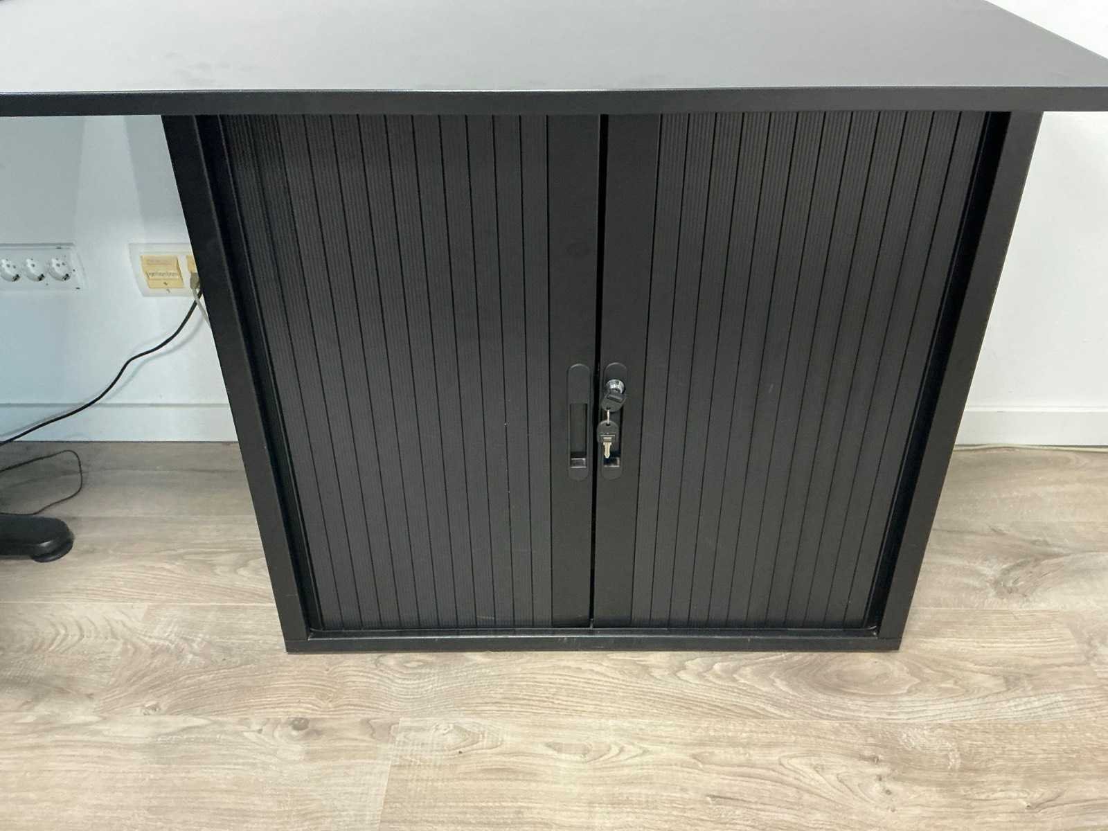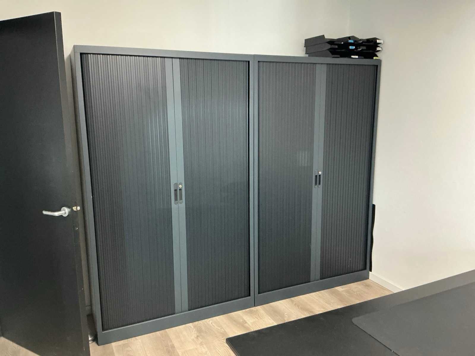 Afmeting 204x90cm, 3x archiefkast met roldeur, 2x archiefkast 2deurs 120x45x198cm (geen sleutels) Kleur: Zwart Materiaal: Hout/metaal