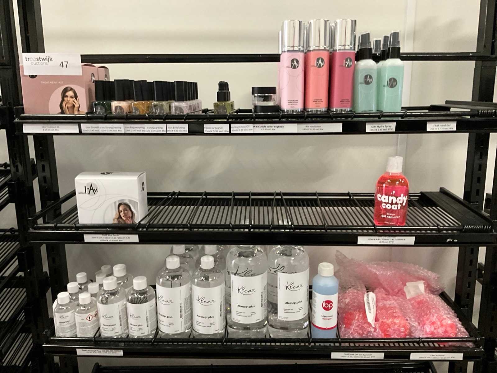 Bestaande uit: treatment kits, argan oil, cuticle butter soybean, hand lotion, hydra spray, alcosept plus, etc; inclusief 4x verrijdbare stelling H192xB95xD34cm Merk: I AM Kleur: Divers